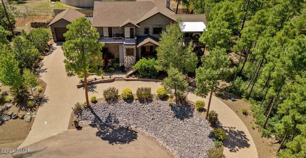 Discover the ultimate in luxury lifestyle on this elevated lot in Starlight Ridge Estates with unforgettable views! Arguably one of the best lots in the White Mountains. Situated in a private cul de sac connecting to the National Forest and Reservation. Perched at the end of the community every area of this estate has spectacular views and has been completely renovated. The result, a sophisticated custom home where functionality is key, yet still elegant, warm and inviting. The unique design truly elevates the principles of timeless appeal and resort style living. Enjoy the outdoors year-round with choices of warm summer days, cool winter evenings, take refuge from the sun under many expansive covered patios, or just relax in privacy. Enter through the welcoming Alder side lite front door. Once inside you are immediately drawn to the outdoors by the large wall of windows and breathtaking mountain views. The main living areas truly bring new meaning to an open floor plan with sliding doors opening to the expansive covered and uncovered back deck and paver patio. This home takes indoor/outdoor living to a whole new level. The gourmet kitchen is a chef's dream. Offering high-end appliances, two huge center islands, quartz book matched slab & backsplash, coffee bar with custom lite elm wood shelves, two dishwashers, 36" farmhouse sink, custom lighting and two-tone cabinetry, built in 66" fridge-freezer, huge pantry, and a large dining nook. The kitchen, truly designed with cooking in mind, blends perfectly with sleek designed custom elements, sweeping views and an abundance of natural light. Entertaining is a delight with multiple dining & seating arrangements. Spacious, romantic owner's suite with unobstructed soaring mountain views features sliding doors to the covered deck, and a large walk-in closet. Enjoy the spa-like bath with luxurious soaker tub, large walk-in shower w/ bench, dual vanities along with fabulous lighting. Just outside the suite you will find a private workspace with mountain views. Three generous sized secondary bedrooms one of which is an en suite, the other two share a large double vanity, walk in shower and all with custom closets and built-ins. You will notice all rooms were designed with mountain views in mind. In addition, a loft and den provide additional entertainment space. A huge office is beautifully presented with custom barnwood ceiling and tons of natural light. French doors that open to the space off of the entry make this room ideal for a workspace or an en suite for your guests. The fifth room currently used as an executive office can easily convert to a fifth bedroom, fitness or music room. The indoors flow seamlessly to the outside creating indoor/outdoor living sanctuary. Enjoy the stunning sunrises with your morning coffee on one of the three front decks, or spend your evenings on the back deck with a glass of wine watching the sunset. Enjoy watching the Monsoons roll in with their spectacular lightning shows from the large upper deck, or watch the many spectacular meteor showers clear skies allow. In addition, the full spectacular fall harvest moons, blood red moons and the smell of the mountains after a rainstorm will take to a place of relaxation! The 3-car attached garage is worth talking about. Having a desired side load entry features lofty ceilings and you can add a few lifts to make room for 6 cars. Don't forget the detached RV Garage! The 6000+ square feet of paved driveway with a circular boulevard and side parking create enough room for many additional vehicles. This is more than a house; it is a lifestyle. Enjoy the romance of the property, the birds & wildlife & the sound of the wind rustling through the hundreds of mature ponderosa pines and oak trees. In addition, sitting by the crackling backyard firepit provides space for engaging in deep conversation or simply just enjoying the silence. Architectural design and the blending of indoor and outdoor spaces make thi