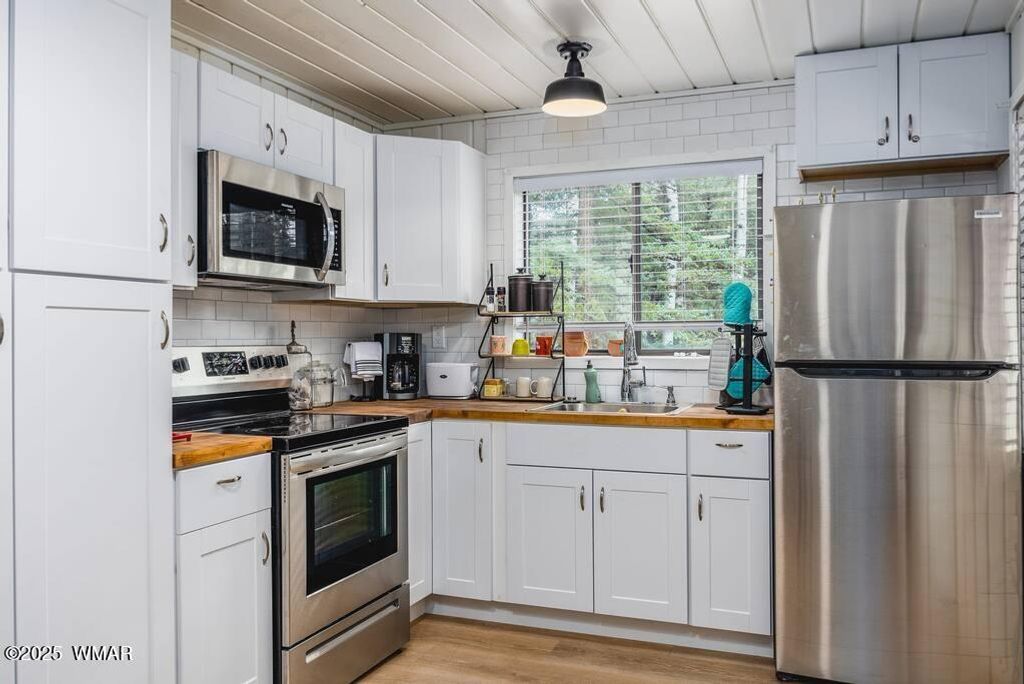 Welcome to this beautifully remodeled cabin in Greer, AZ, offering a cozy and inviting retreat surrounded by nature's splendor. This cabin boasts a charming blend of modern comfort with thoughtful upgrades that enhance its appeal. As you step into the cabin, you'll immediately notice the stunning butcher block countertops in the kitchen. The kitchen itself is fully equipped with modern appliances, including a refrigerator, stove, and microwave, ensuring convenience and functionality for all your cooking needs. The living area features a fireplace, providing both visual appeal and a cozy ambiance during cooler evenings. The cabin has 2 well-appointed bedrooms, offering comfortable spaces for relaxation and rejuvenation.