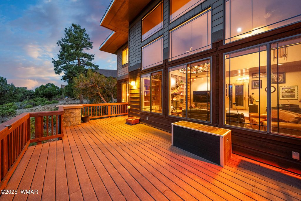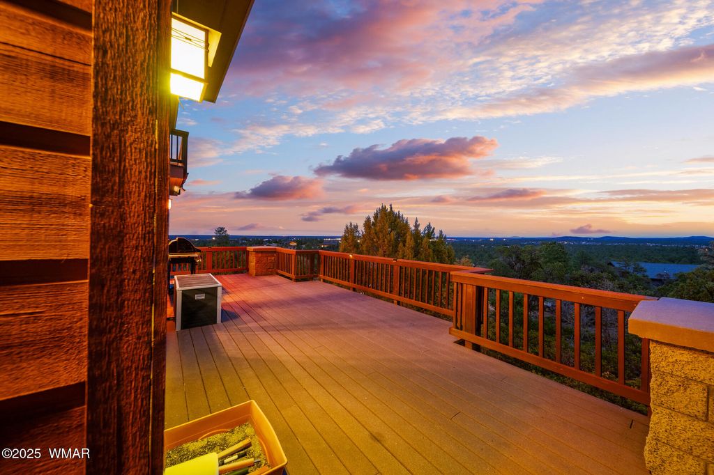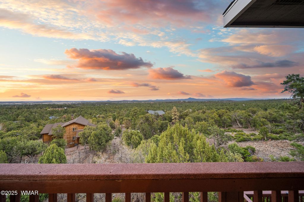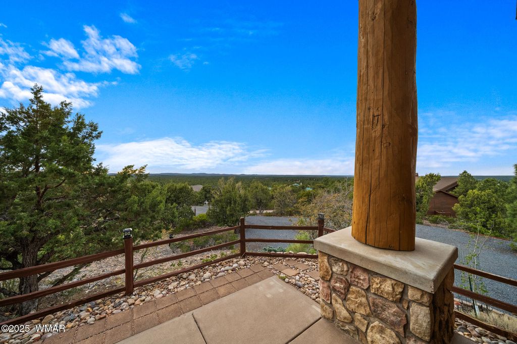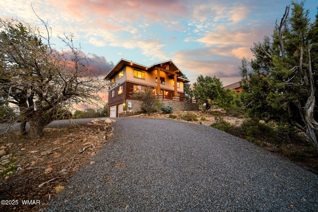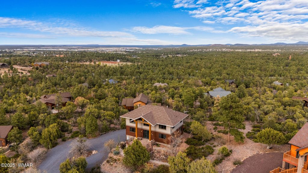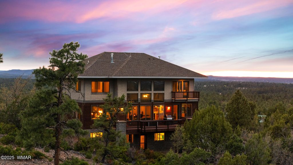 An architect-designed custom house at the top of Show Low, with views, views and more views! On clear days the front patio overlooks the west as far as the San Francisco Peaks of Flagstaff. To the north, you have forest views, views of town, and can even see the wind turbines beyond Snowflake The back deck offers views of Porter Mountain, Mount Baldy, Blue Peak and the other White Mountains. There are three levels to maximize the views. This home has 3 fireplaces in total, one is the primary bedroom, study, and living room. Main (middle) level has an open concept kitchen with custom maple cabinets and new LG combination oven/microwave combo and dividable oven, for three separate cooking ovens in all. Cook your turkey, biscuits and stuffing at different temperatures all at the same time. The kitchen has a 10-ft long granite topped kitchen island with Wolf professional six burner cooktop, and features two recently purchased French door, built-in refrigerators side by side. Never run out of fridge space. The kitchen and dining room open onto a great room with 20-high ceiling, lots of glass and huge elk antler chandelier. It features a stone fireplace with gas logs controlled by a thermostat and has a massive juniper log mantle flanked on both sides by built-in maple bookshelves. This level also features a large study and den with another juniper mantle and second gas-log, stone fireplace. And lots more views. The two-story tall entry foyer has a whitetail antler chandelier to highlight the deer and elk that inhabit the 1.1 acre yard. A powder room with a David Marsh mirror, Antelope Ranch lighting fixture and custom-made Michael Hays vessel sink on granite countertop rounds out the main floor. The upper floor has three bedrooms with spectacular views as well, and a full bath for guests or the kids. This upper bath has a Jacuzzi-brand steeping tub for long luxurious soaks. The main suite at the opposite end features a Vermont Casting woodstove with gas logs and thermostat for cozy evenings in bed. This bedroom opens onto a full bath highlighted by a two-person Jacuzzi-brand tub with whirlpool jets and built-in heater so your bathwater will never get cold. It also has a glassed-in shower, double vanities, plus private toilet room and a large walk-in closet. The whole top floor and all stairs have brand new carpet and premium pad, and both bathrooms feature newly installed engineered wood floors with waterproof polymer backing. A laundry closet is located just outside the main bedroom door and features a Maytag stacked washer and dryer and shelving. You wash your clothes right there on the bedroom wing. The lowest level features a three car garage with shelving. Just inside the house is a walkout living room and a fourth bedroom with its own half bath and giant walk-in closet featuring a row of cabinets. Off the lower living room or rec room is a room that can be a workshop or a kitchen for a mother-in-law suite. It features a brand new stainless steel sink, built-in cabinets and lots of power outlets for a microwave oven and more. The bedroom's bath can be expanded with a small shower, for which the plumbing is already roughed in. The house has a updated on-demand Rinnai water heater with circulation system that insures you always have instant hot water throughout the house. Circulation can be controlled by your smart phone or you can set it to flow during the times of day you most use hot water. There is also a hybrid water softener with whole-house charcoal water filtration system. The house also features a lighting arresting system on the roof (installed by a company certified by the Lightning Institute of America) and has a whole-house surge protector to keep your sensitive electronics safe. It also has a monitored, hardwired security alarm system with monitored heat/smoke detection. The back deck features a gas outlet for a barbeque, so you never run out of gas while your steaks are cooking. On fourth of July you, your f