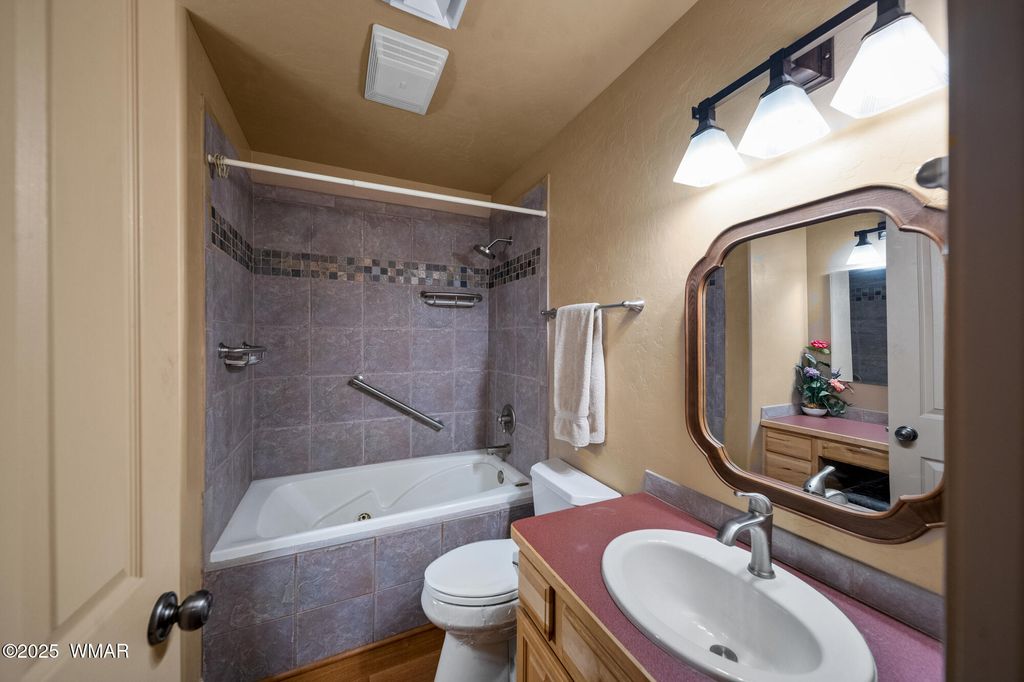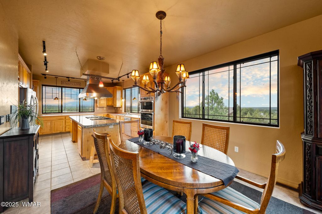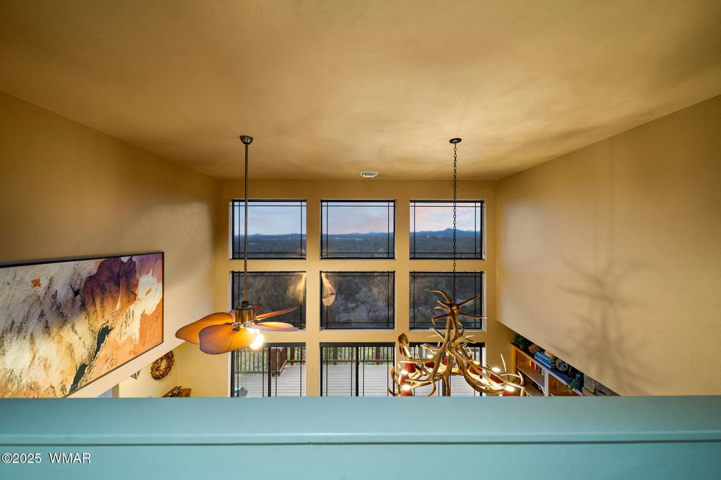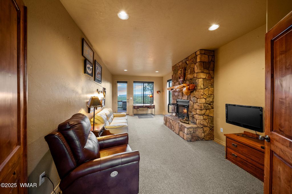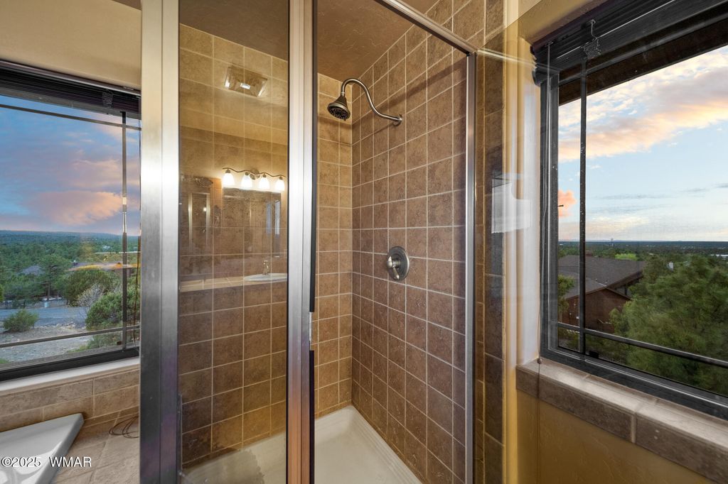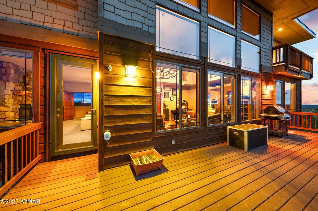 An architect-designed custom house at the top of Show Low, with views, views and more views! On clear days the front patio overlooks the west as far as the San Francisco Peaks of Flagstaff. To the north, you have forest views, views of town, and can even see the wind turbines beyond Snowflake The back deck offers views of Porter Mountain, Mount Baldy, Blue Peak and the other White Mountains. There are three levels to maximize the views. This home has 3 fireplaces in total, one is the primary bedroom, study, and living room. Main (middle) level has an open concept kitchen with custom maple cabinets and new LG combination oven/microwave combo and dividable oven, for three separate cooking ovens in all. Cook your turkey, biscuits and stuffing at different temperatures all at the same time. The kitchen has a 10-ft long granite topped kitchen island with Wolf professional six burner cooktop, and features two recently purchased French door, built-in refrigerators side by side. Never run out of fridge space. The kitchen and dining room open onto a great room with 20-high ceiling, lots of glass and huge elk antler chandelier. It features a stone fireplace with gas logs controlled by a thermostat and has a massive juniper log mantle flanked on both sides by built-in maple bookshelves. This level also features a large study and den with another juniper mantle and second gas-log, stone fireplace. And lots more views. The two-story tall entry foyer has a whitetail antler chandelier to highlight the deer and elk that inhabit the 1.1 acre yard. A powder room with a David Marsh mirror, Antelope Ranch lighting fixture and custom-made Michael Hays vessel sink on granite countertop rounds out the main floor. The upper floor has three bedrooms with spectacular views as well, and a full bath for guests or the kids. This upper bath has a Jacuzzi-brand steeping tub for long luxurious soaks. The main suite at the opposite end features a Vermont Casting woodstove with gas logs and thermostat for cozy evenings in bed. This bedroom opens onto a full bath highlighted by a two-person Jacuzzi-brand tub with whirlpool jets and built-in heater so your bathwater will never get cold. It also has a glassed-in shower, double vanities, plus private toilet room and a large walk-in closet. The whole top floor and all stairs have brand new carpet and premium pad, and both bathrooms feature newly installed engineered wood floors with waterproof polymer backing. A laundry closet is located just outside the main bedroom door and features a Maytag stacked washer and dryer and shelving. You wash your clothes right there on the bedroom wing. The lowest level features a three car garage with shelving. Just inside the house is a walkout living room and a fourth bedroom with its own half bath and giant walk-in closet featuring a row of cabinets. Off the lower living room or rec room is a room that can be a workshop or a kitchen for a mother-in-law suite. It features a brand new stainless steel sink, built-in cabinets and lots of power outlets for a microwave oven and more. The bedroom's bath can be expanded with a small shower, for which the plumbing is already roughed in. The house has a updated on-demand Rinnai water heater with circulation system that insures you always have instant hot water throughout the house. Circulation can be controlled by your smart phone or you can set it to flow during the times of day you most use hot water. There is also a hybrid water softener with whole-house charcoal water filtration system. The house also features a lighting arresting system on the roof (installed by a company certified by the Lightning Institute of America) and has a whole-house surge protector to keep your sensitive electronics safe. It also has a monitored, hardwired security alarm system with monitored heat/smoke detection. The back deck features a gas outlet for a barbeque, so you never run out of gas while your steaks are cooking. On fourth of July you, your f