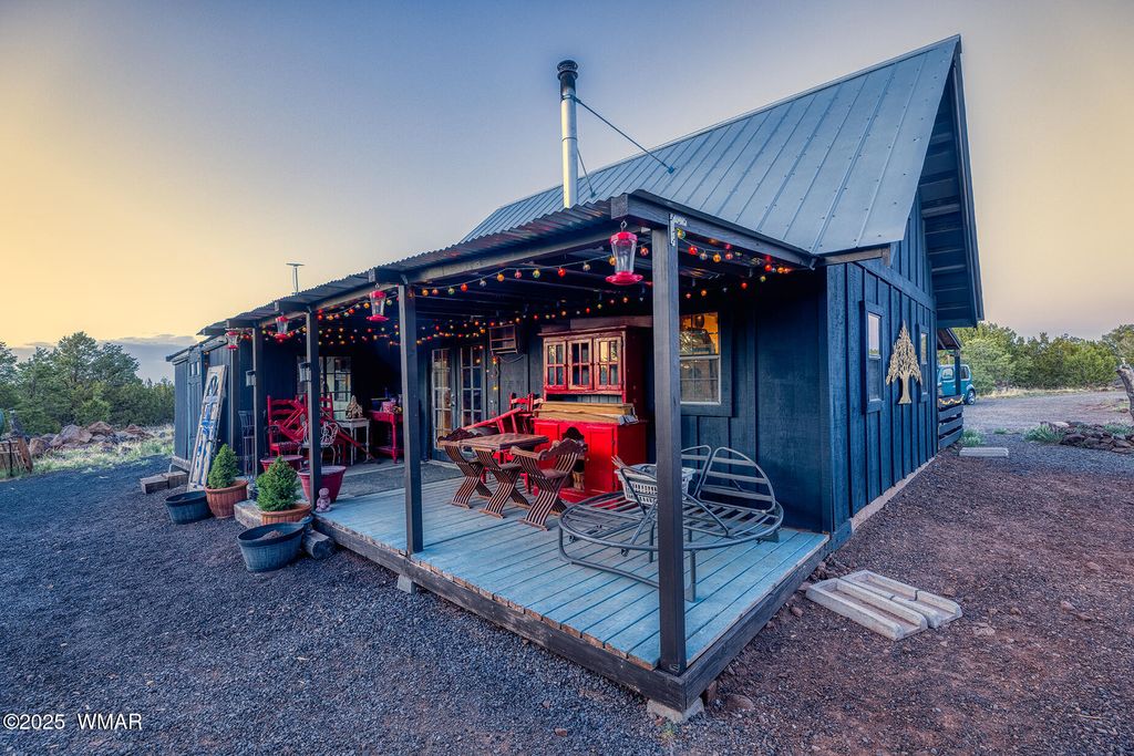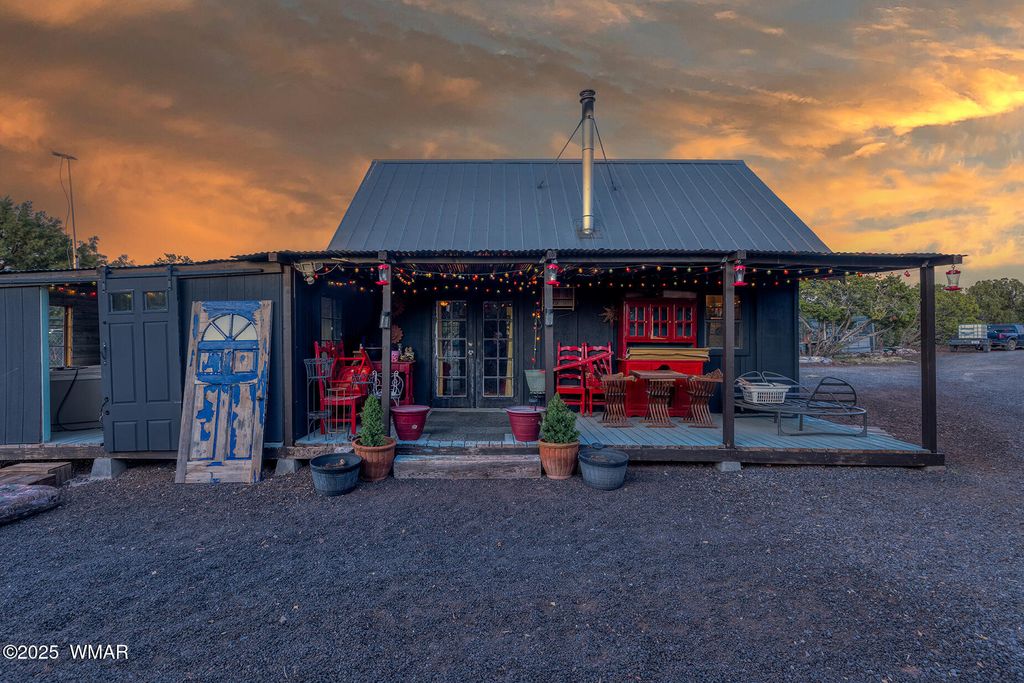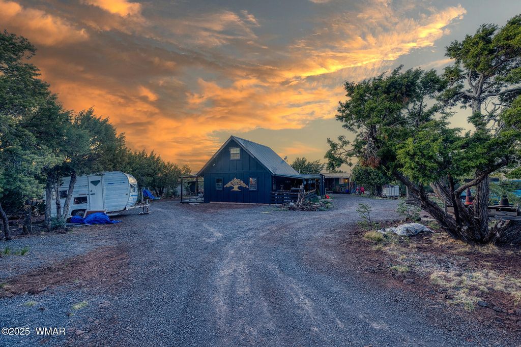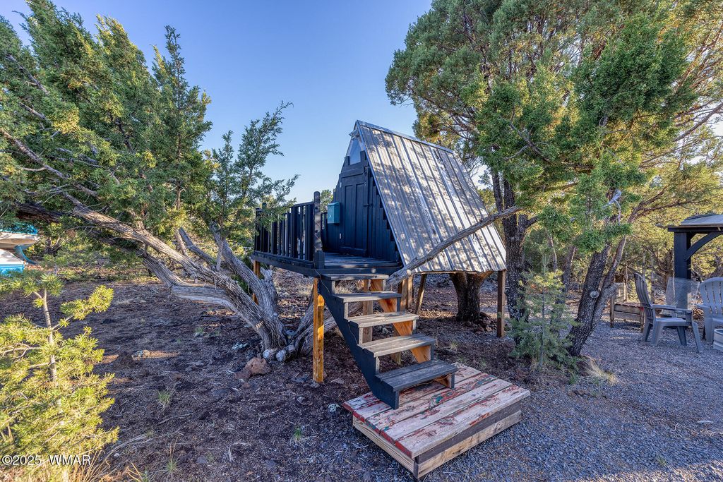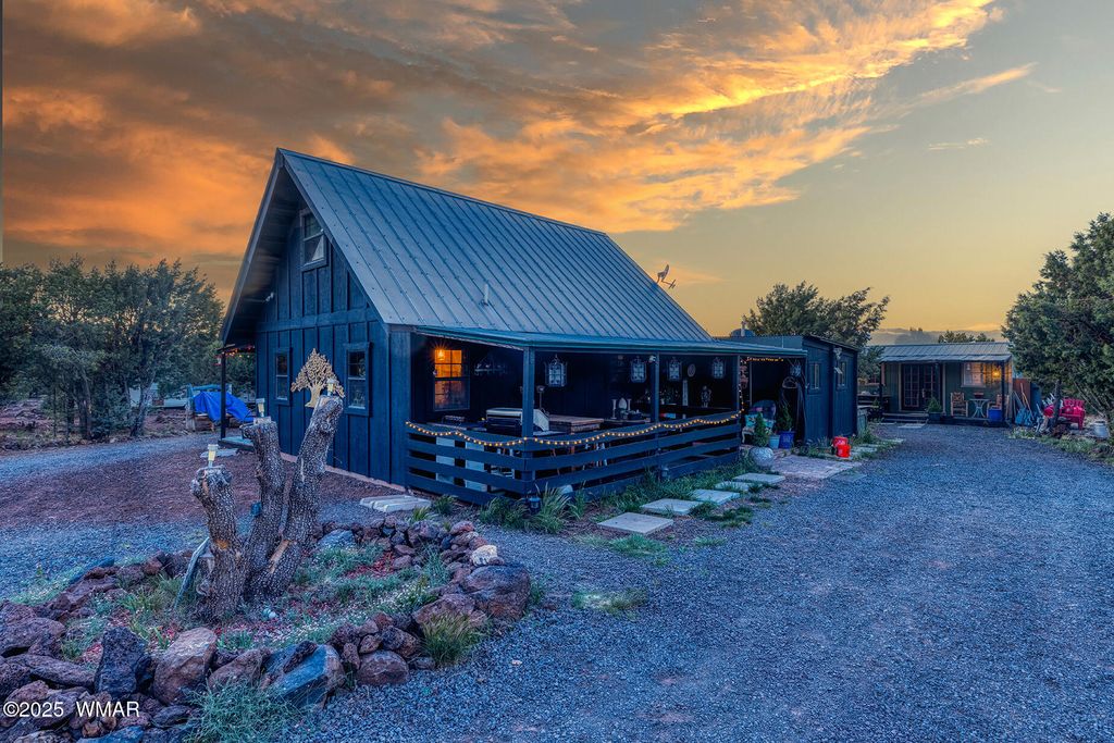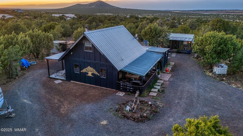 Seller will accept or counter offer between 350,000-375,000. Bring all offers!! Tucked away on approximately 4.99 wooded acres in Vernon, AZ, this charming site-built 2 bed, 1 bath home offers peaceful seclusion, rustic character, and versatile living. The main residence features painted concrete floors throughout and a warm, cabin-inspired interior highlighted by a vintage farmhouse sink that adds timeless appeal. A thoughtfully designed 300 sq ft guest house offers additional living or rental potential, complete with a soaking tub and a stunning stained glass accent wall that creates a colorful, artistic ambiance. Outside, the property offers multiple unique structures, including a cozy A-frame style treehouse, a gazebo ideal for outdoor gatherings, and two bonus buildings perfect for a studio, workshop, or storage. This horse-friendly retreat includes free-hauled water from a community well, and provides the ideal mix of off-grid tranquility with nearby conveniences. Located close to lakes, golfing, and scenic trails perfect for outdoor enthusiasts. A rare and flexible opportunity in Arizona's beautiful White Mountains. Property Features: 2 Bedrooms / 1 Bathroom Approximately 4.99 Acres (Heavily Treed & Private) Site-Built Main Home with Painted Concrete Floors Vintage Farmhouse Kitchen Sink 300 sq ft Guest House with Soaking Tub & Stained Glass Accent Wall A-Frame Style Treehouse Gazebo for Outdoor Relaxation 2 Bonus Structures (Studio/Storage/Workshop Potential) Horse-Friendly Property Free-Hauled Water from Community Well Close to Lakes, Golfing, and Hiking/Biking Trails Power line is buried making for cost effective Maintenace on only one power pole when the time come to replace it. Buyer to verify all material facts.