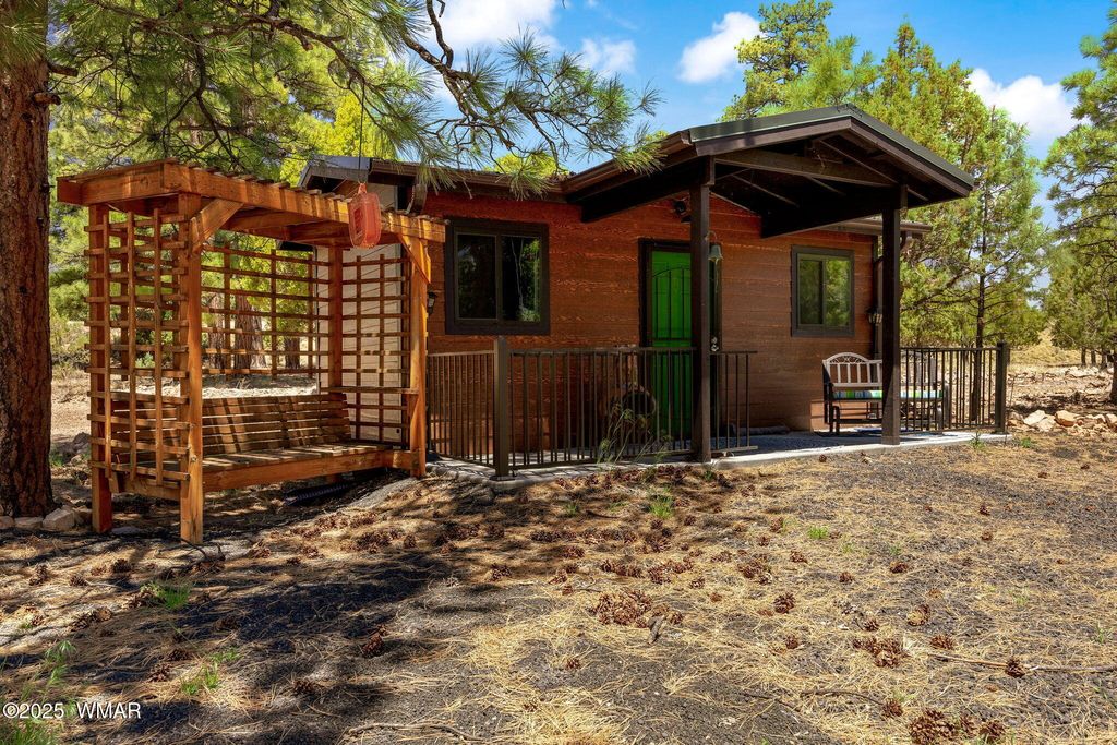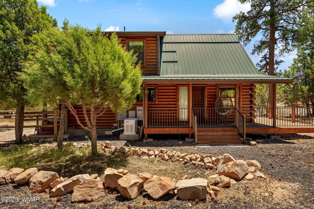 Escape the heat & unwind in this beautiful log-sided cabin nestled among tall, swaying Ponderosa pines. Step onto the inviting covered deck and through the charming Dutch front door into a cozy mountain haven. Generex generator (for house,garage and, shed) Inside, you'll find soaring vaulted ceilings & a warm pellet stove to keep you comfortable on cool nights. The kitchen is a showstopper with upgraded quartz countertops, a stylish backsplash, & a unique copper sink. This split floor plan offers privacy, with the primary suite featuring its own ensuite bath, complete with a new vanity, copper sink, & matching copper-framed mirror. Recent upgrades include brand-new windows & toilets throughout . A durable metal roof tops it off. Enjoy a detached garage & a she shed bunk house.