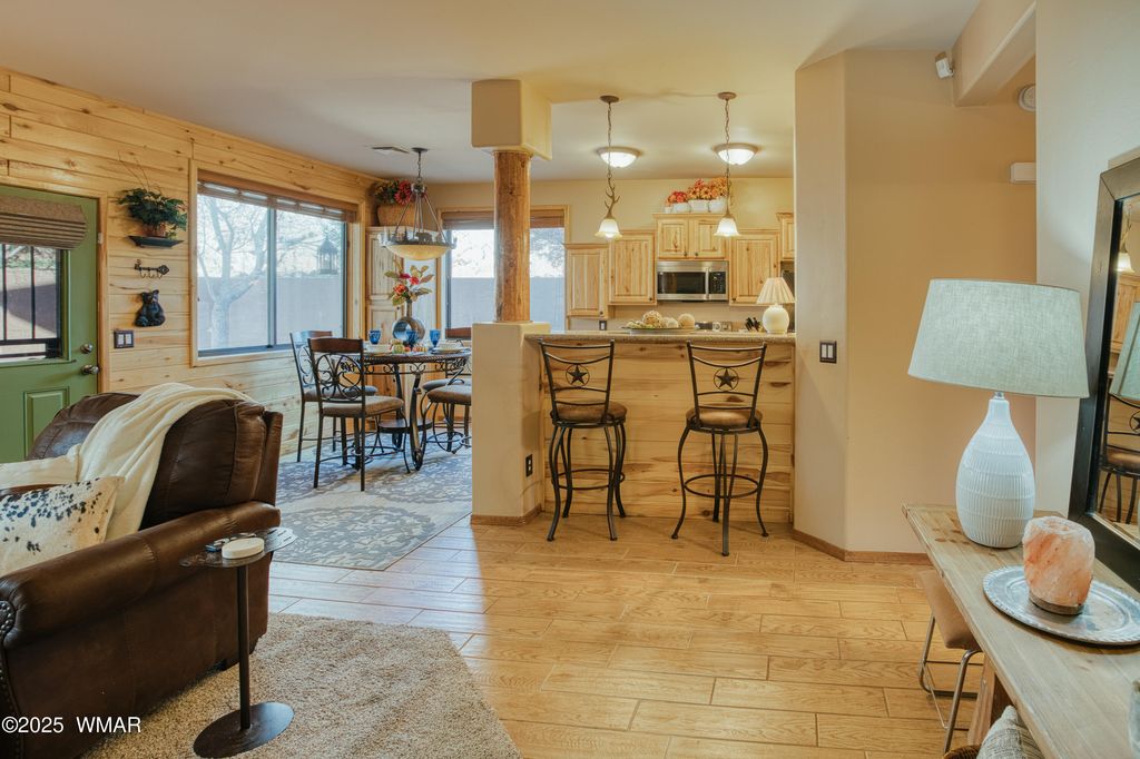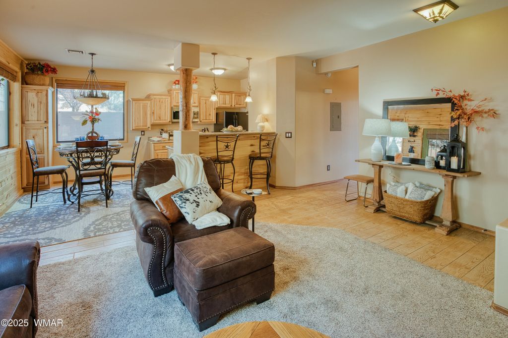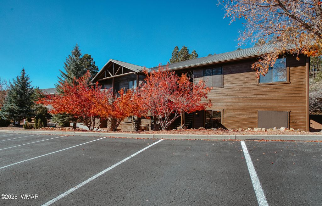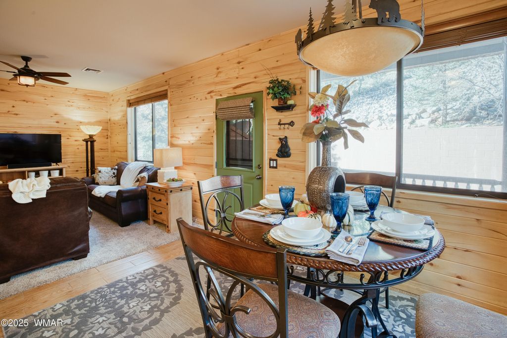 Partially, nicely furnished GROUND floor Condo at Bison Ridge located in Show Low, AZ of the White Mountains. This is a desirable corner unit, 2bed/2bath w/ a nice size living room to relax and leave your doors open to enjoy cool mountain cross breeze, or sit on the back patio and enjoy the trees, and wildlife visits. Kitchen boasts granite, new appliances ,and perfect breakfast bar/dining area. Beautiful light fixtures throughout with rustic feel of wood and metal finishes. HOA responsible for outdoors, no yard maintenance! Master bedroom/ en suite bath & walk-in shower. 2nd bedroom with nice sized closet. 2nd bath good size. Community park, HOA Garden area. Amazing, relaxing home in sought after neighborhood! Come up to the cool pines and see this beautiful condo!
