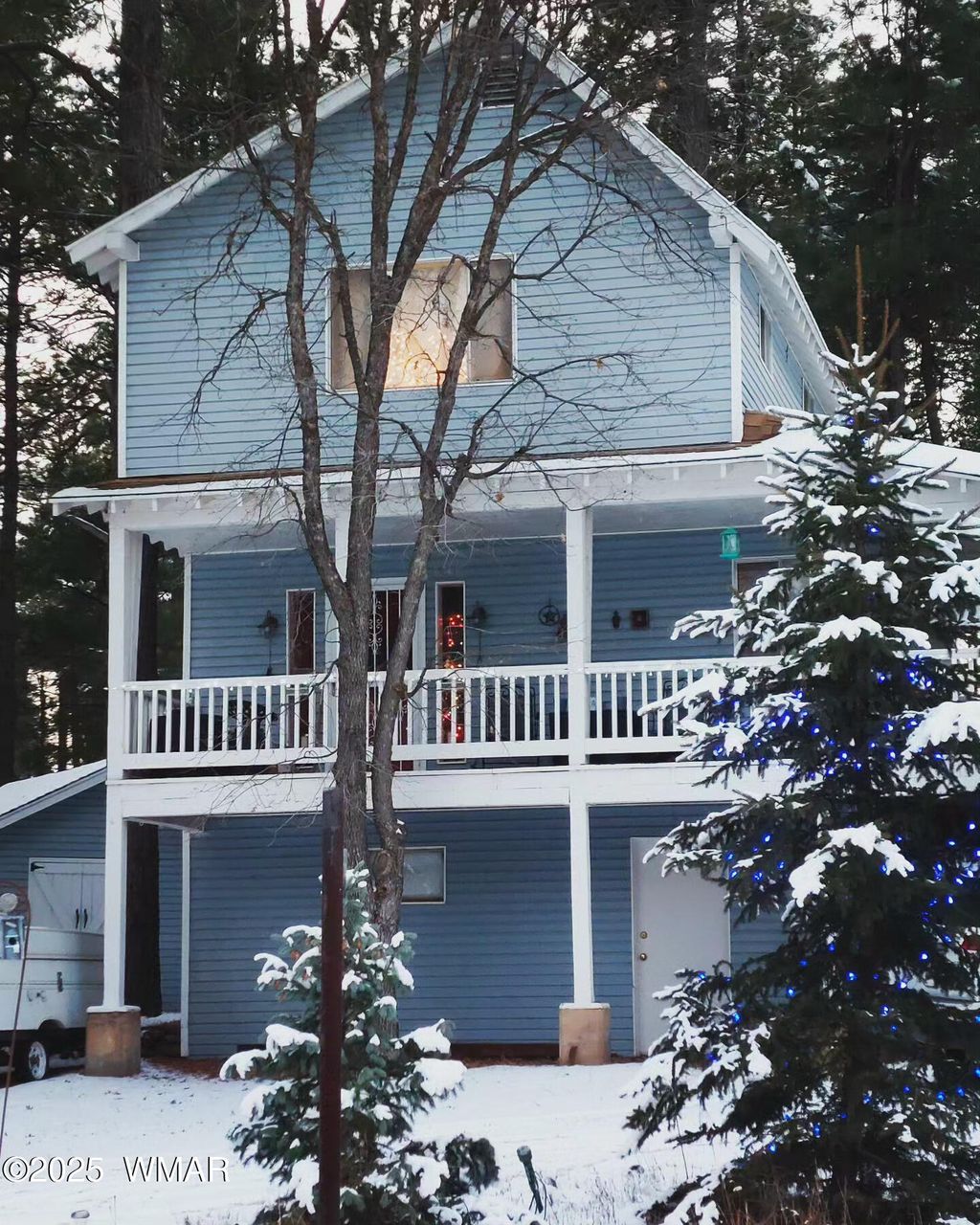 BEAUTIFUL MOUNTAIN RETREAT. This is a rare opportunity to purchase a cozy cabin, with an extra lot AND bordering the National Forest! Fully Furnished! Perfect for full time residency, short term rental opportunity or escape the heat every chance you get. Features 2 bedrooms with views of the tall pines and 1 bath upstairs, an additional full bath downstairs, a cool man cave on the first floor with a garage roll up door for your toys. Cozy up to the fireplace on cool mountain nights, sip coffee on the front porch and enjoy the sunrise. The home has a new roof installed in the fall of 2024.