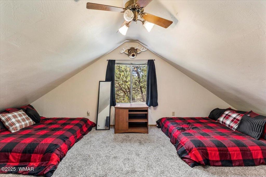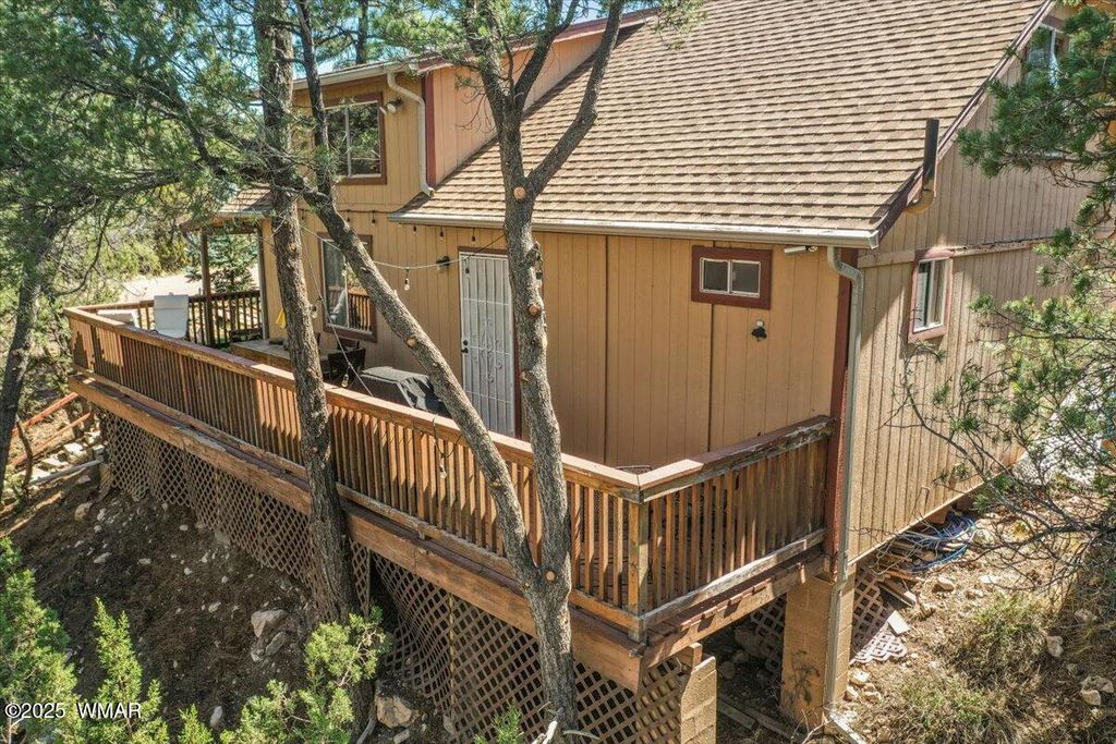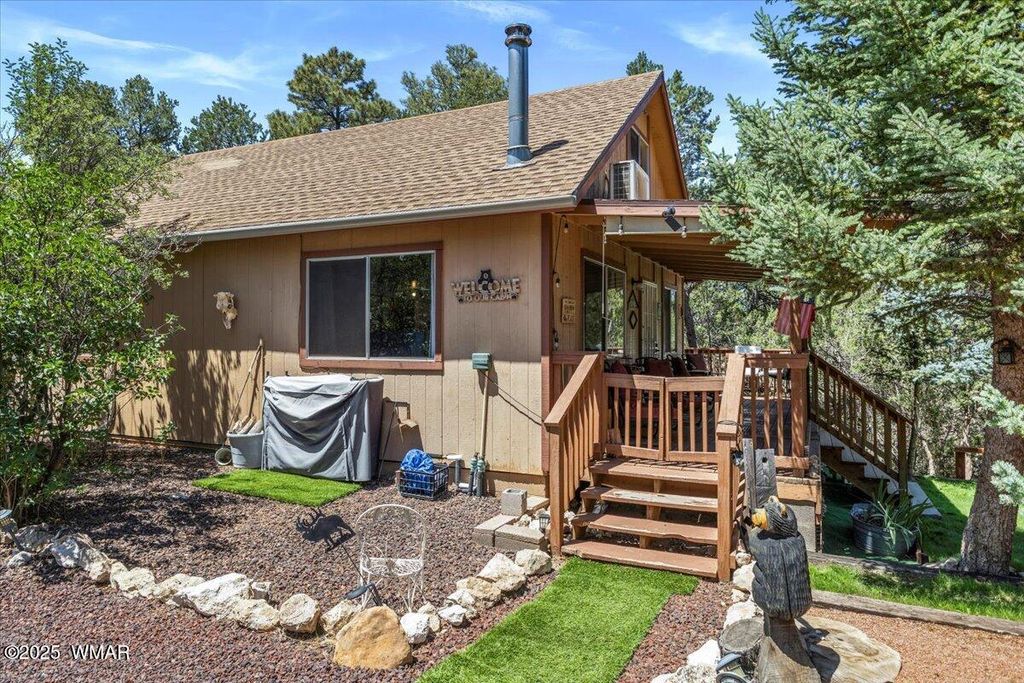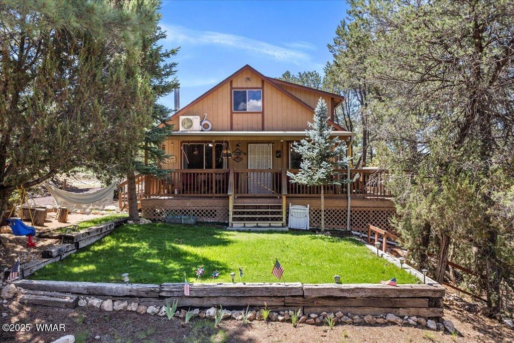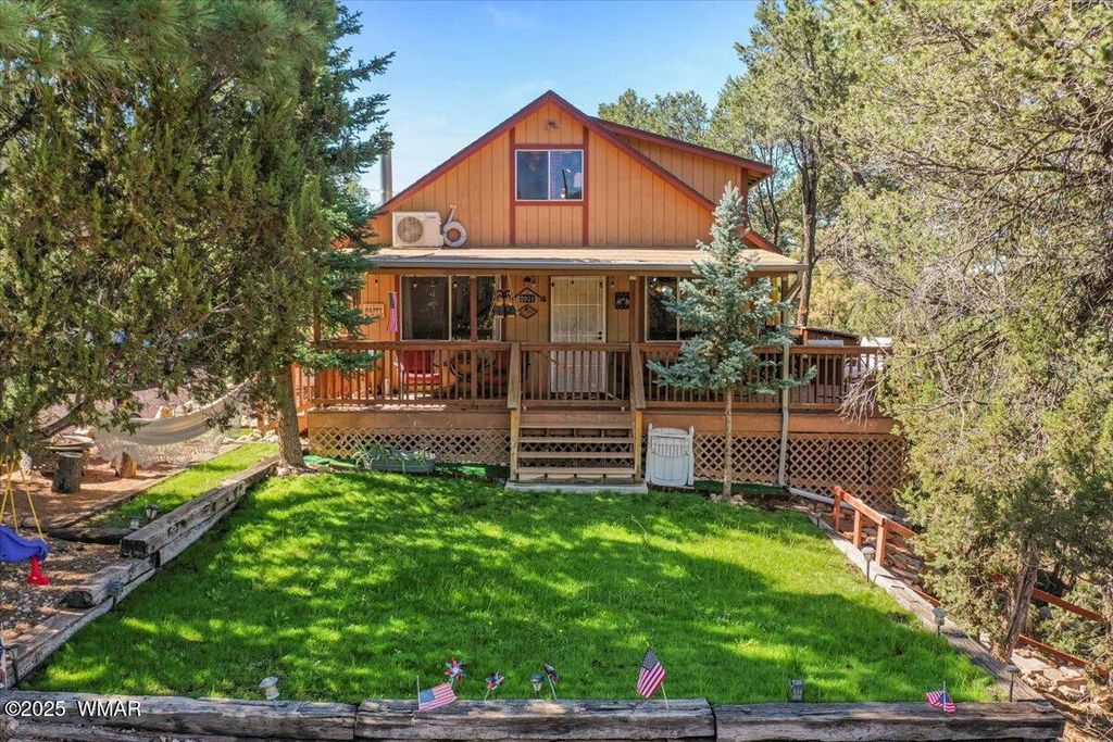 Escape the desert heat and retreat to your private mountain sanctuary! This beautiful cabin is nestled among mature pine trees on a 14,000+ sq ft forested lot, with no neighbors beside or across the street"”offering rare privacy and peaceful views. Whether you're seeking a weekend escape or a full-time residence, this home combines rustic charm with modern comfort. Step onto the expansive wrap-around porch and breathe in the cool mountain air as you overlook your own private ravine, complete with a custom concrete and rock staircase leading down for easy access. Inside, the cabin features new carpet and flooring throughout (updated in 2020), a newer roof, and a thoughtfully designed layout. The spacious upstairs room can comfortably fit four queen beds, in addition to a large loft area that adds even more flexible space. The main living area and bathroom are equipped with efficient baseboard heaters, while a 2-ton mini split system provides year-round comfort in the living area, complemented by a separate 1-ton system in the primary bedroom. The exterior features a beautifully widened driveway with lava rock that accommodates 7-8 vehicles, plus a custom-built entry staircase for enhanced curb appeal. A cozy fire pit area with 1/4 minus rock sets the stage for evenings under the stars, and the full gutter system with covers ensures easy maintenance year-round. The front yard includes a sprinkler system with durable Kentucky Bluegrass for added greenery and charm. Tucked away in a quiet mountain community, this cabin offers the warmth and peacefulness of home with all the modern amenities you need. Don't miss your chance to own a private slice of mountain paradise.