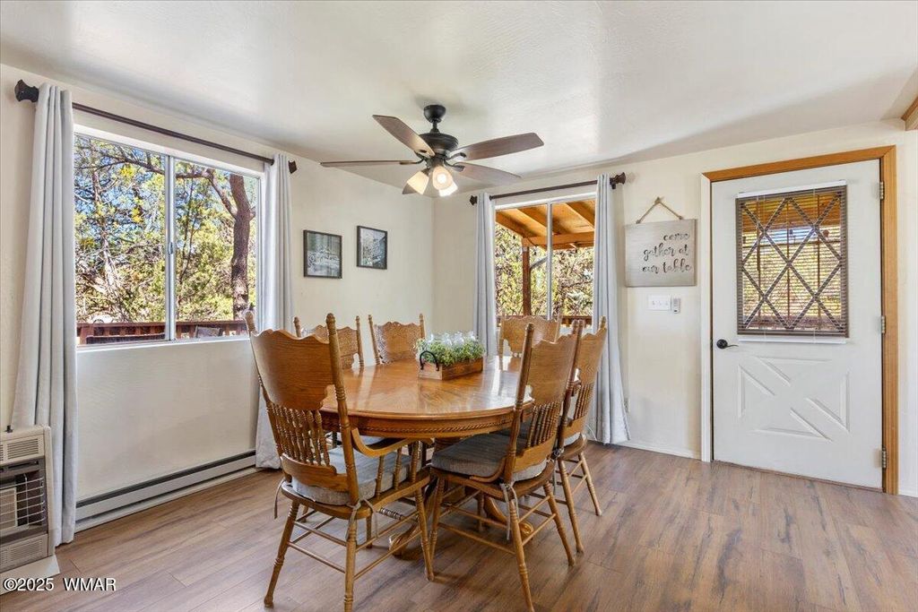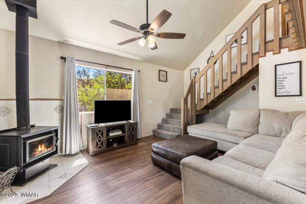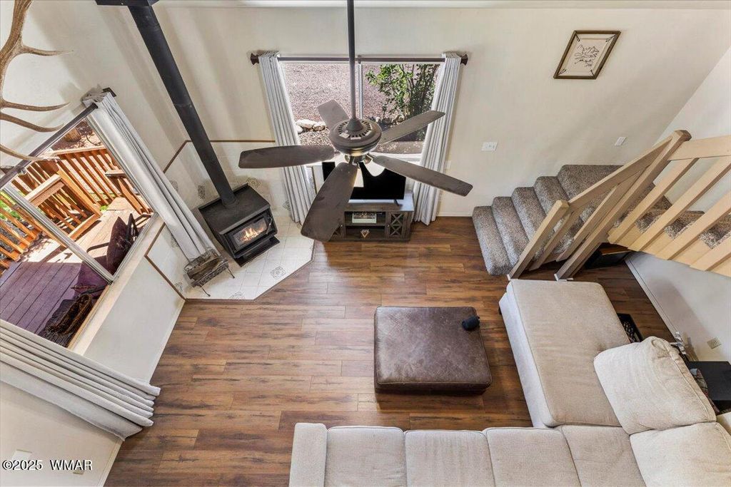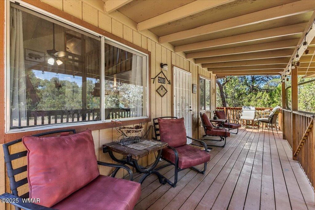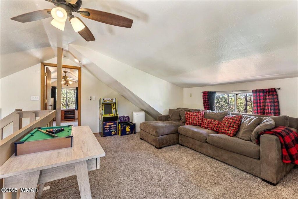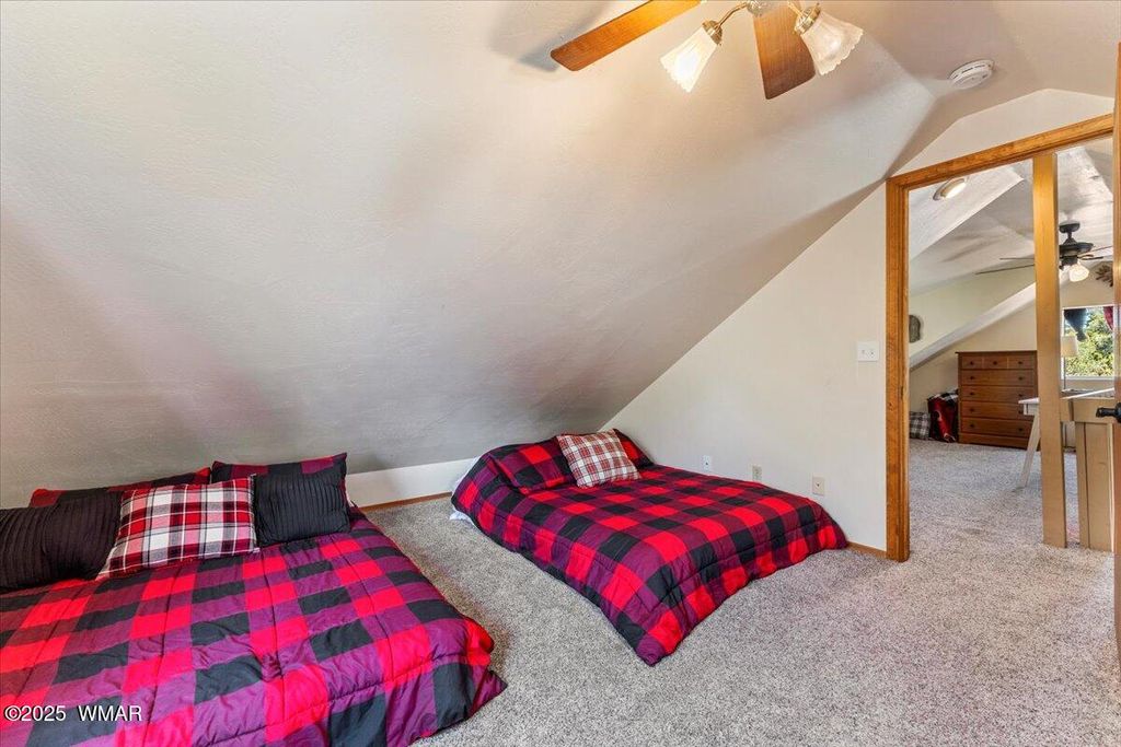 Escape the desert heat and retreat to your private mountain sanctuary! This beautiful cabin is nestled among mature pine trees on a 14,000+ sq ft forested lot, with no neighbors beside or across the street"”offering rare privacy and peaceful views. Whether you're seeking a weekend escape or a full-time residence, this home combines rustic charm with modern comfort. Step onto the expansive wrap-around porch and breathe in the cool mountain air as you overlook your own private ravine, complete with a custom concrete and rock staircase leading down for easy access. Inside, the cabin features new carpet and flooring throughout (updated in 2020), a newer roof, and a thoughtfully designed layout. The spacious upstairs room can comfortably fit four queen beds, in addition to a large loft area that adds even more flexible space. The main living area and bathroom are equipped with efficient baseboard heaters, while a 2-ton mini split system provides year-round comfort in the living area, complemented by a separate 1-ton system in the primary bedroom. The exterior features a beautifully widened driveway with lava rock that accommodates 7-8 vehicles, plus a custom-built entry staircase for enhanced curb appeal. A cozy fire pit area with 1/4 minus rock sets the stage for evenings under the stars, and the full gutter system with covers ensures easy maintenance year-round. The front yard includes a sprinkler system with durable Kentucky Bluegrass for added greenery and charm. Tucked away in a quiet mountain community, this cabin offers the warmth and peacefulness of home with all the modern amenities you need. Don't miss your chance to own a private slice of mountain paradise.
