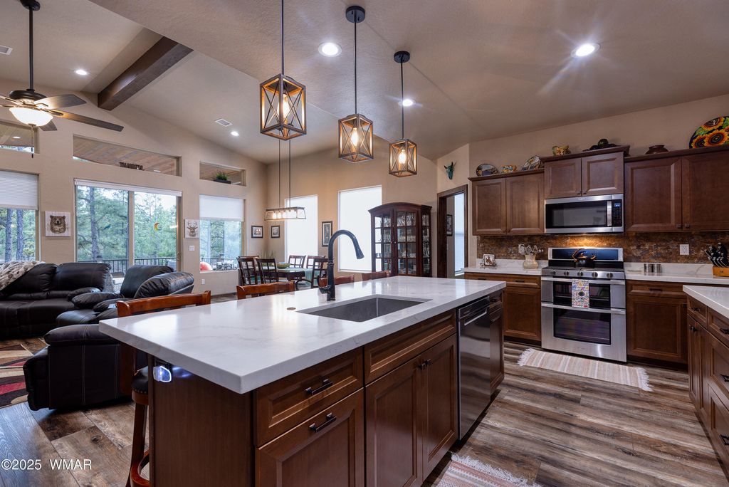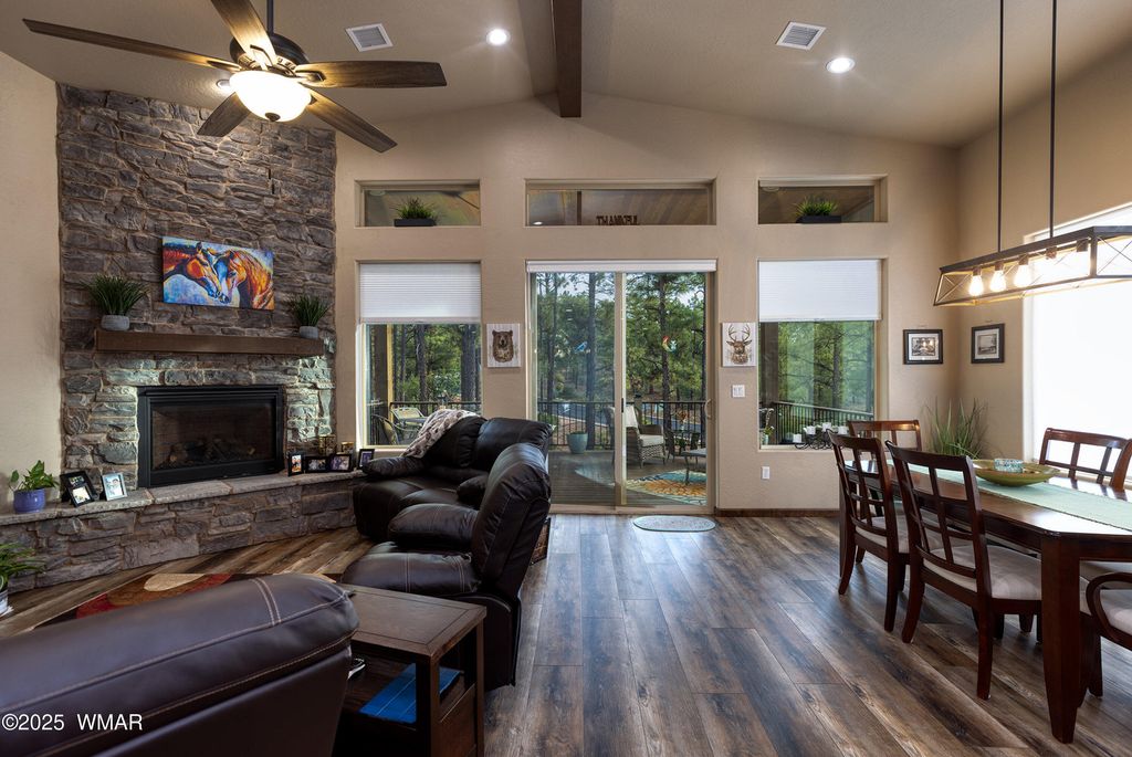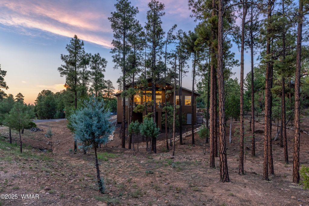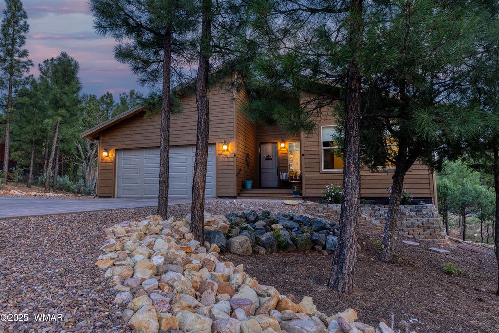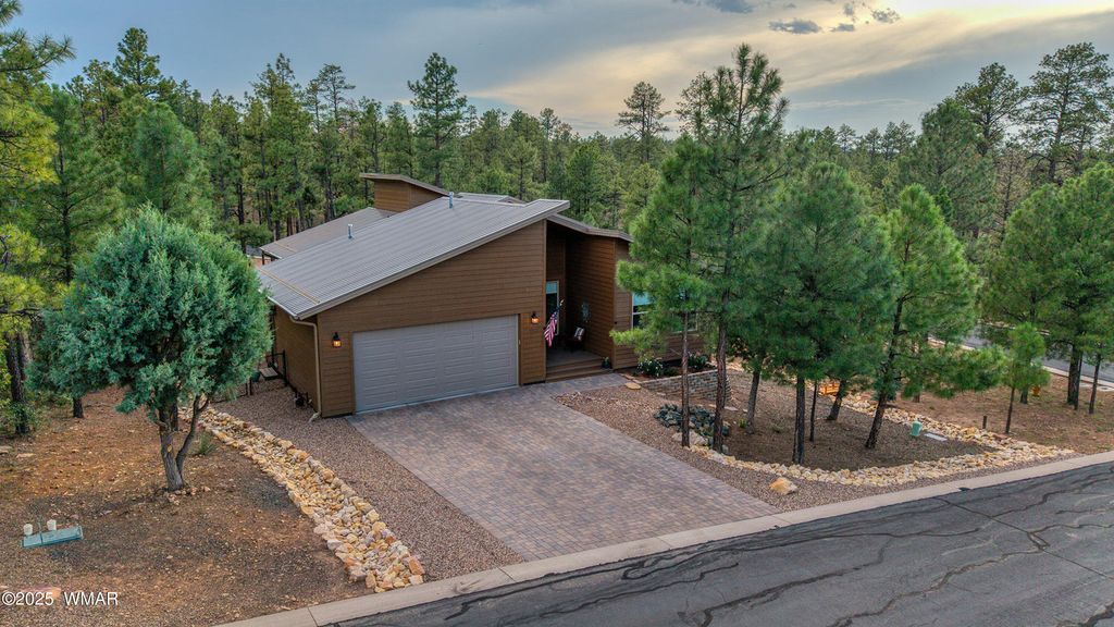 Nestled among mature pines inside the gated community of Snow Creek lays this gorgeous 3-year-old, 2 bedroom plus den (potential bedroom) on a very large, tree covered lot with privacy galore. Enter into the welcoming, bright great room with an abundance of large windows to take in all of the beauty. The open concept kitchen is truly an entertainers dream with a very large granite island with seating for 4, high end stainless appliances including a gas stove and double ovens. There is a very large walk-in pantry and a coffee bar (or desk) off the kitchen. The laundry room boosts additional cabinets and a large closet. Warm up by the gas fireplace while taking in breathtaking views from the oversized windows and sliding door leading onto your serene back deck. Retreat to the spacious master suite with very generous closet storage and an ensuite offering dual sinks. The split floor plan offers a large guest bedroom with adjacent guest bathroom for privacy. A flexible den/sitting room provides space for guests, hobbies or an office. An oversized two-car garage leads right into the kitchen for ease. Relax and watch the deer, elk and turkeys from the expansive covered back deck with tongue-and-groove ceilings, recessed lighting, plus additional open-air space for grilling including a gas stub for your bbq. The low-maintenance landscaping keeps weekends free to enjoy the mountain air. You and fido can easily access a fenced dog run from the walkout garage door. There is a large unfinished area under the home that is just waiting to be an exercise room, office, game room or? Upgrades include screened rain gutters with snow guards (downspouts are buried), cellular shades on all windows, retractable front screen door, house surge protector, upgraded smoke/CO detectors. This home is centrally located and only a few minutes from downtown Show Low and the hospital. Come see it before it's gone!