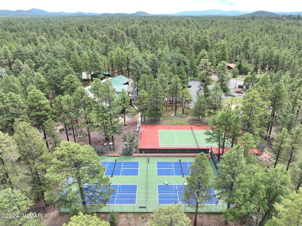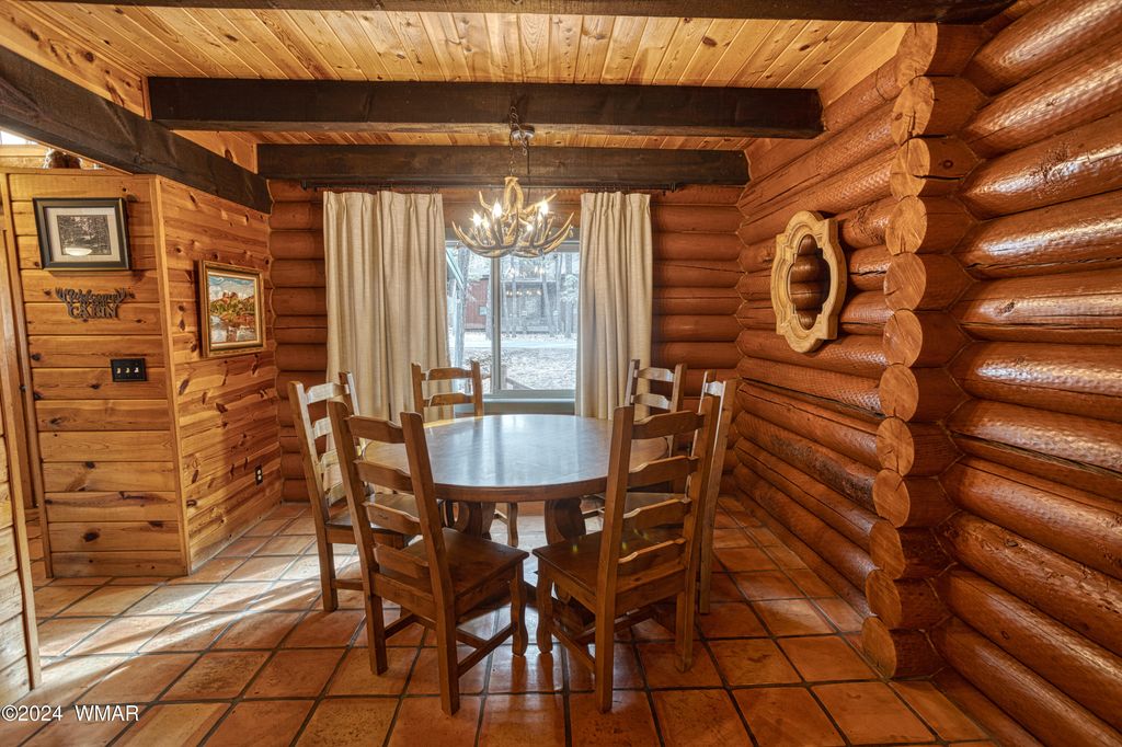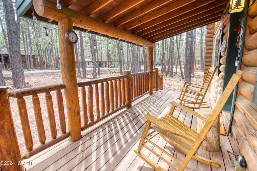 Fully Turnkey FURNISHED! This LOG CABIN, with rec. center privileges, in the pines is a private sanctuary! With the rich wood beams and T&G ceilings, the warmth of the flowing tile floors, and the rock backdrop to the natural gas stove, this space invites you to relax and unwind. The updated remodeled kitchen with stone counters and stainless-steel appliances, along with a breakfast peninsula and charming dining area, is ideal for entertaining. Vaulted ceilings in the open bedroom spaces and the updated bathrooms add a touch of luxury. The large, new Trex-style back deck and firepit area in the expansive yard make this log cabin the ultimate mountain retreat. Whether you plan to keep it as a personal getaway or use it as a rental, it's the perfect slice of paradise! Read more... This home has been a successful short term rental. It's ready to go to relax and enjoy plus it can be an excellent investment to generate income. Please note that the 2nd bathroom is a 1/2 bath. You could expand the bath upstairs in the large walk-in closet and/or add additional bath in the huge laundry room. This home includes Rec Center Privileges with a large swimming pool, hot tubs, workout center, pickleball, tennis, volleyball, basketball, shuffleboard, playground. Wonderful activities and classes like water arobics, crafts, etc. The pickleball has teams and tournaments. There are 3 golf courses - 2 private and 1 public. Imagine living in the White Mountains of Arizona where you have 4 beautiful seasons and where you can breathe in the fresh mountain air and enjoy the 40 lakes and over 600 miles of rivers and streams. In addition to the amazing fishing, this area has one of the most extensive trail systems in the southwest for hiking, biking, horseback riding, quadding and more. Sunrise Ski Resort is also just 40 minutes away with 3 beautiful mountains to ski, snow board or sled. If shopping is your interest, you will love the antique stores and the multitude of arts and craft shows that happen in the summer. The music festivals have something to fit everyone's enjoyment. Do you love to golf? There are 7 amazing golf courses, 3 that are public. The White Mountains, where this home/cabin is the best kept secret of Arizona! Come and explore and enhance your living! Pinetop-Lakeside was also voted 'Best Cabin Region in the U.S"... Embrace the MAGIC!