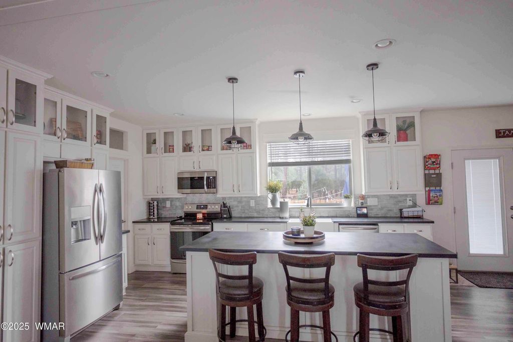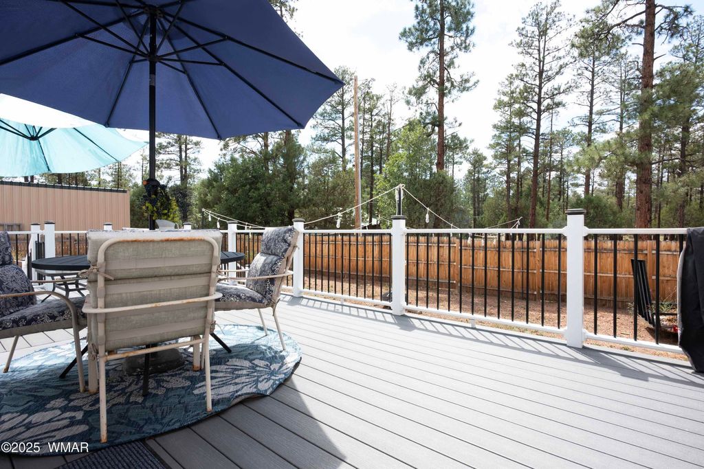 Beautiful 2021 CAVCO manufactured home on a .24-acre cul-de-sac lot surrounded by pines near Show Low Lake. This spacious split floor plan home features vaulted ceilings, recessed lighting, solid surface counters, and abundant natural light with both a living and family room. Energy-efficient with upgraded insulation from floor to ceiling. Enjoy the outdoors on the 12x32 Trex back deck overlooking a 7.5 acre HOA park in a peaceful neighborhood. Also included is a 2-car garage with rear garage door access to the backyard, RV gate and EV charging port. This home offers comfort, style, and convenience in the White Mountains. Highlights: 3 bedrooms | 2 bathrooms 2021 CAVCO Manufactured Home .24-acre cul-de-sac lot Solid surface counters Luxury Vinyl flooring Vaulted ceilings & recessed lighting Living room + family room Upgraded insulation package 24 x 24 - 2-car garage with rear access door 12' x 32' Trex deck Energy efficient appliances Home is set up to add A/C just plug and go, there are 2 floor a/c units in the home. Surrounded by pine trees, close to Show Low Lake, 7.5 acre HOA park, medical care, shopping, & entertainment. Seller is willing to sell front living room furniture, electric fireplace, and patio furniture with a separate bill of sale.