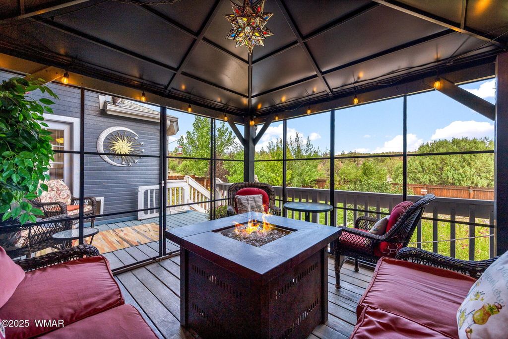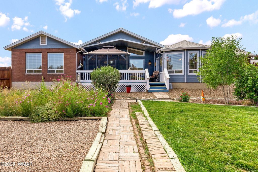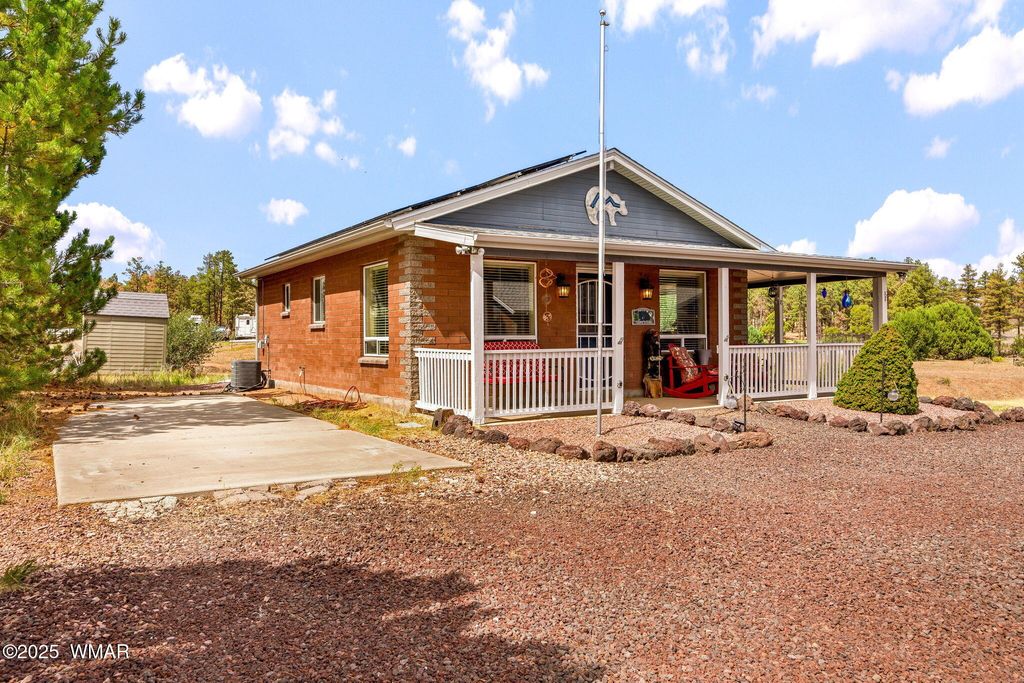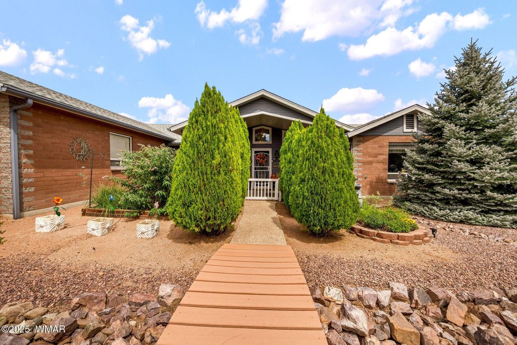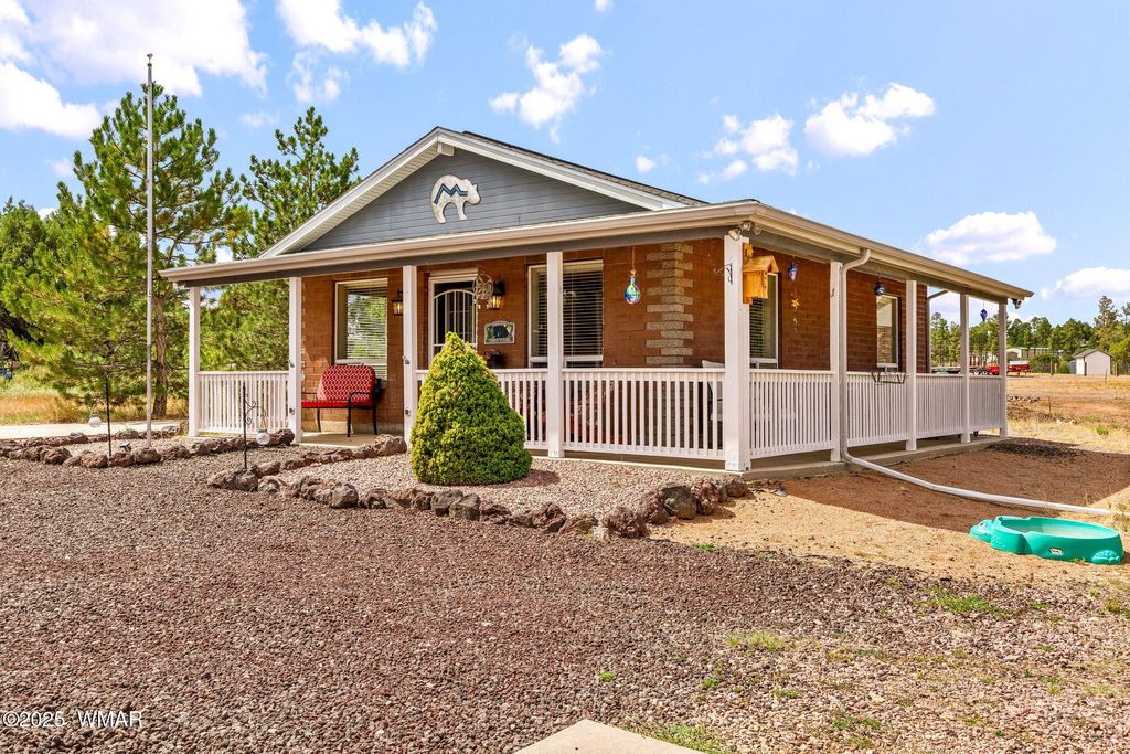 Set on over an acre near Show Low in the White Mountains, this rare Pinedale ranchette features two fully furnished homes on one property"”a spacious main residence and a detached guest house"”tucked away at the end of a private street. The single-level main home offers 4 bedrooms, 2 full baths, soaring vaulted ceilings, a striking stone fireplace, and a chef's kitchen. Off the dining area, a private courtyard invites outdoor gatherings, while the covered back deck frames stunning wooded ridge views. The landscaped grounds, accented by mature pines including Colorado Blue Spruce, attract birds and butterflies throughout the seasons. The owner's suite provides a spa-like retreat with double vanities, a jetted tub, and a separate shower. The detached 690 sq ft guest house includes... ...1 bedroom, 1 bath, a full kitchen, and great roomperfect for guests, multi-generational living, or rental income. Both homes received new roofs in 2023, and owned solar panels (5.61dc/6.0 ac) efficiently power them both. Set on over an acre, this horse property includes an RV pad with hookups, a shared well, septic system, and true move-in-ready convenience. A unique opportunity to enjoy mountain living with comfort, versatility, and natural beauty.