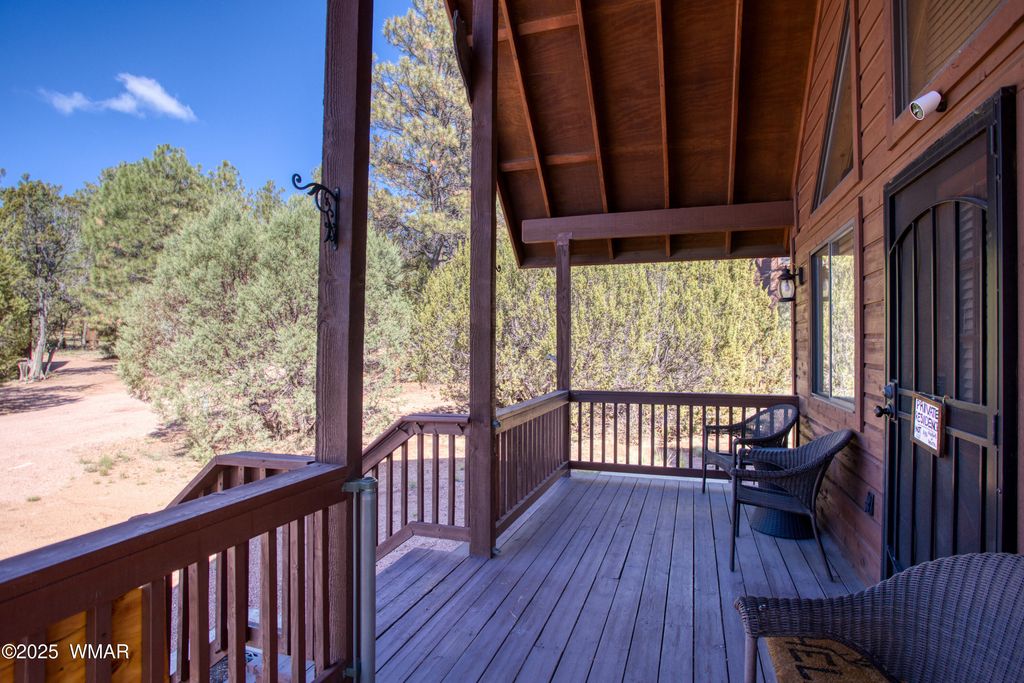 Fresh to the market and BACKING NATIONAL FOREST nestled on an oversized .19-acre lot, comes this charming two-story cabin that offers 922 sq. ft. of cozy living space with breathtaking panoramic views of the national forest. Enjoy the tranquility and privacy of having only one neighbor, while being surrounded by nature's beauty. The home features a spacious downstairs primary bedroom with a private, large bath and stunning tongue-and-groove ceilings. Upstairs, the loft is currently used as a bedroom and offers additional living space. The upgraded kitchen boasts sleek granite countertops, newer stainless steel appliances, and a welcoming stone fireplace in the great room to enjoy during cooler evenings. Step outside to your own outdoor oasis with THREE private ....(continued) ....covered decks to enjoy nature in every season. The upper deck offers panoramic forest views, while the lower spacious deck comes complete with a grill, patio furniture, and a table for entertaining. A front covered deck adds even more space for relaxation. Additional features include: 1.) Large storage shed with power for additional storage. 2.) Washer & dryer included 3.) Home is fully furnished, including kitchen items, bedding, and everything needed for turnkey living or renting 4.) One deck previously plumbed for a hot tub, awaiting your personal touch 5.) New water heater, baseboard heater, #2 portable AC units, grill, etc. Minutes from fine dining, shopping, and hiking trails, this property is ready for immediate enjoyment or to be rented out as a short-term investment. Don't miss this opportunity to own a beautiful retreat that combines modern upgrades with the serenity of nature!
