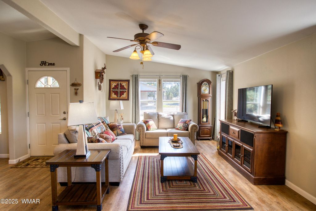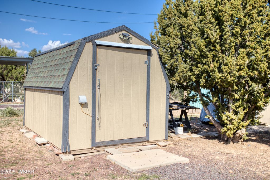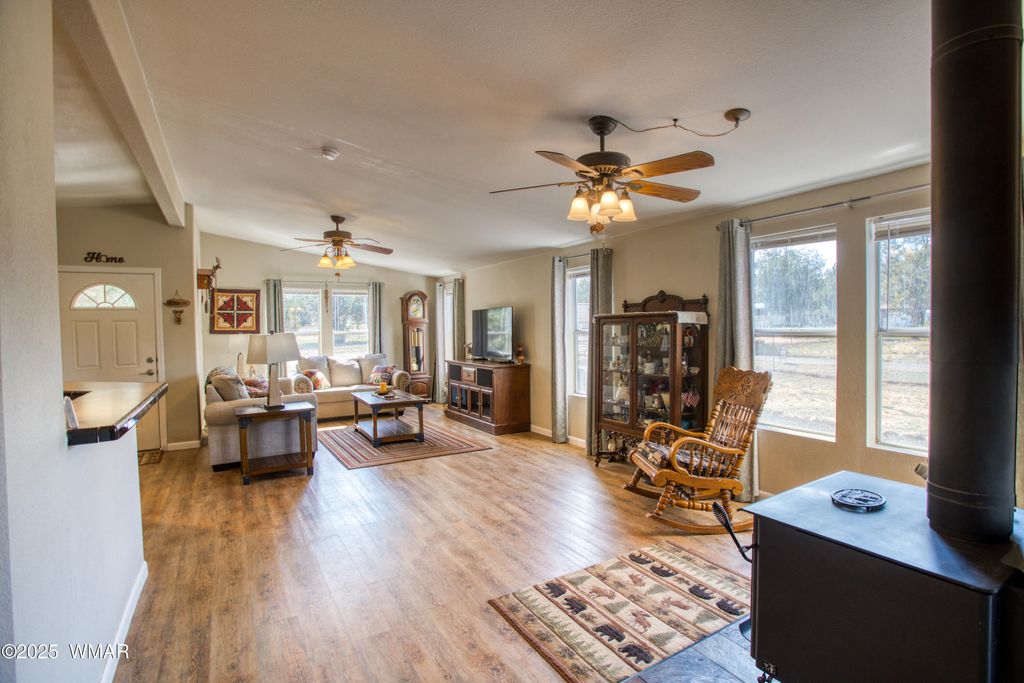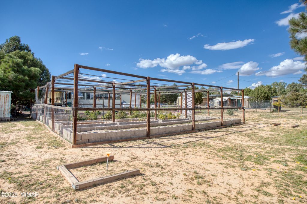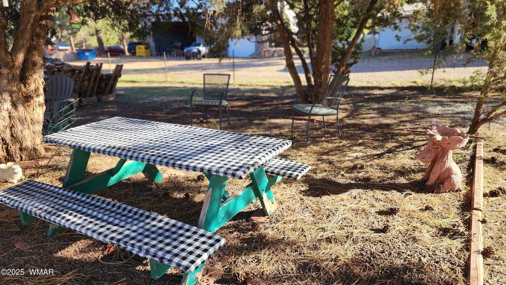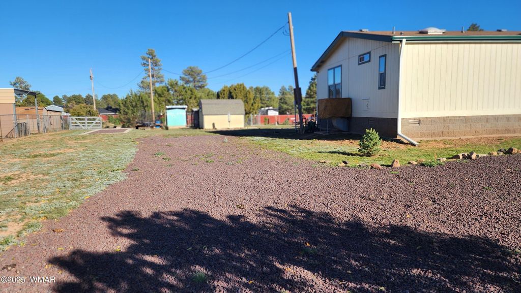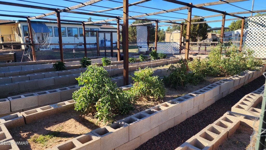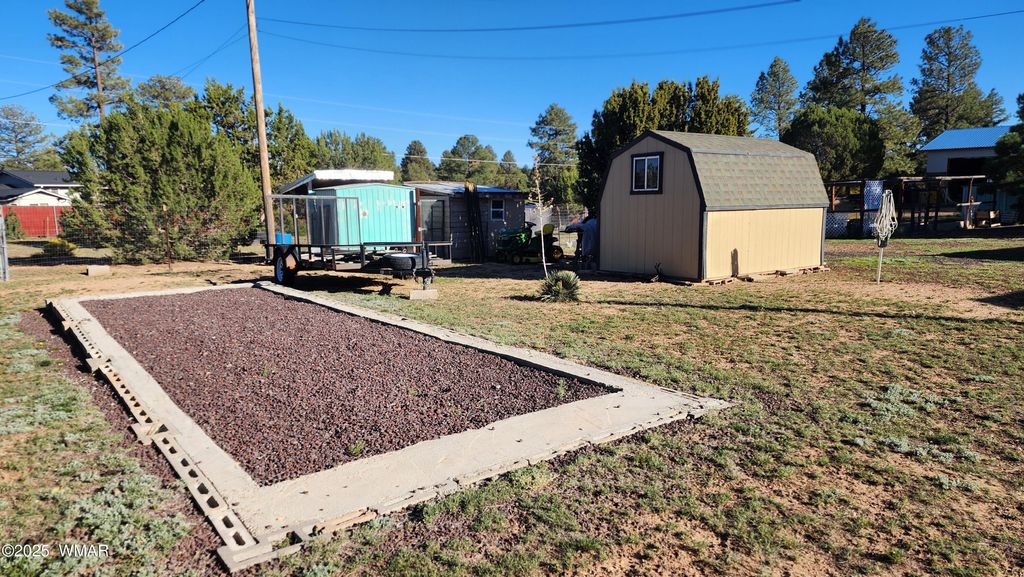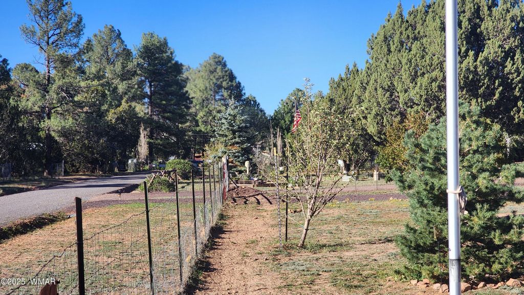Exceedingly well-maintained and spacious 3 bedroom 2 bath home in a quiet, beautiful area of tall pines! Interior features include a versatile, 500 s.f. Arizona room with plenty of windows and built-ins, a nicely appointed kitchen with an island and ample cabinet/counter space, and forced air gas heat plus a woodstove for comfy, economical warmth in winter. Situated on a level acre that would also work well for horses, goats, etc (plenty of room for corrals, no HOA!), the exterior features include a custom ramp to the front door, full perimeter fencing, multiple storage sheds (one has power to it) a chicken coop that has an electrically powered door that automatically closes and locks at night to protect your feathered friends, and an expansive area of raised garden beds .... CLICK HERE: ... (mostly enclosed to keep the critters out!) - that could also be easily transformed into a full greenhouse. A developed RV parking area & full hook-ups (30 amp service, water, & septic) would welcome guests or overflow, and there's a circular driveway for easy access to it all. All appliances can stay with the home, including a freezer, and the picnic table and gas grill can also convey. Peaceful, practical, and perfectly set up for country living!