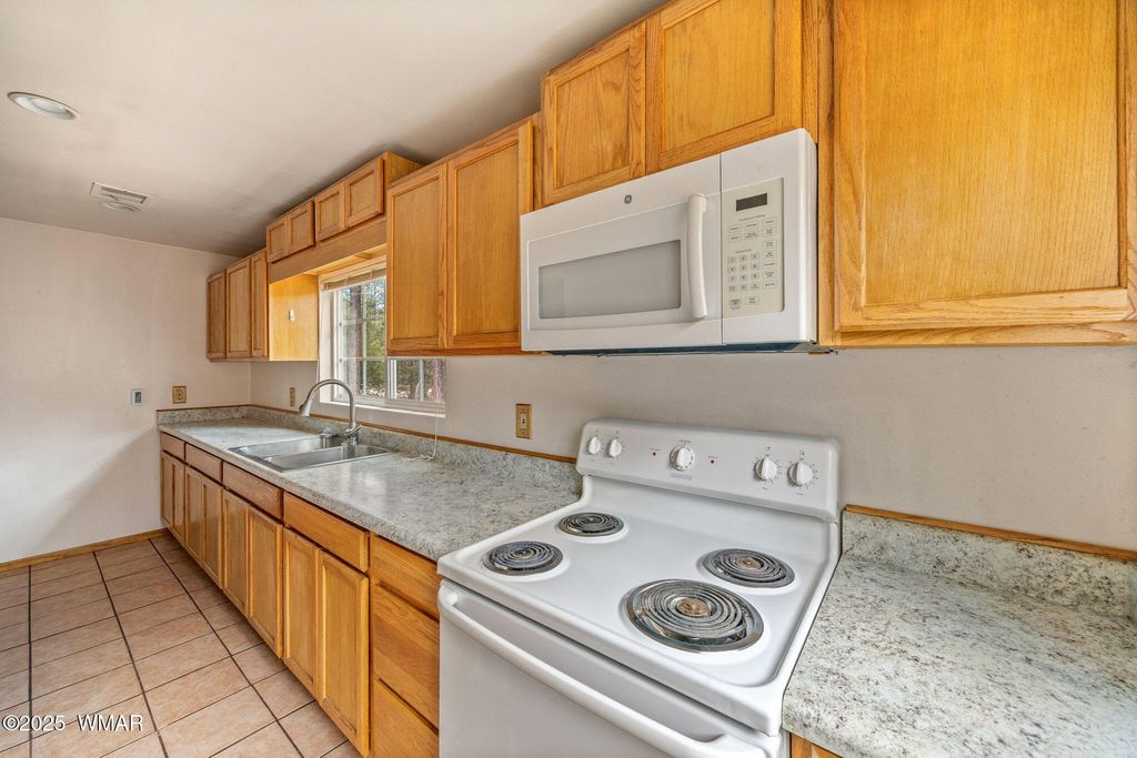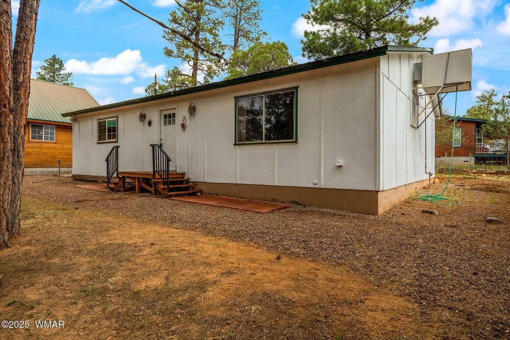 Discover this charming 3-bedroom mountain retreat where stunning floor-to-ceiling knotty pine paneling creates warm, rustic elegance throughout the main living areas. The stone hearth with freestanding wood stove becomes the heart of the home, perfect for cozy evenings in Arizona's high country. Extensive built-in storage throughout maximizes every inch of living space. The massive 1,344 sq ft pre-plumbed garage is truly a craftsman's paradise, featuring workshop space and multiple roll-up doors for ultimate flexibility. Set on a rare 0.6-acre corner lot surrounded by towering ponderosa pines, the property includes additional storage shed and ATV storage area. Located in peaceful Buckskin Acres subdivision.