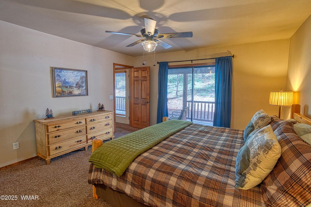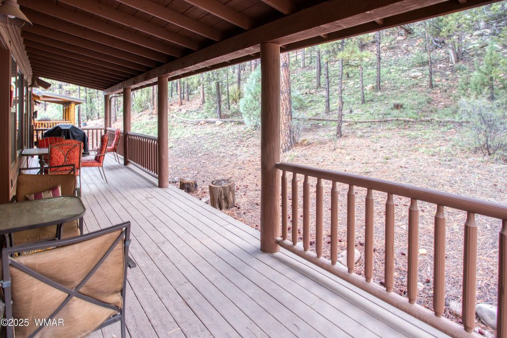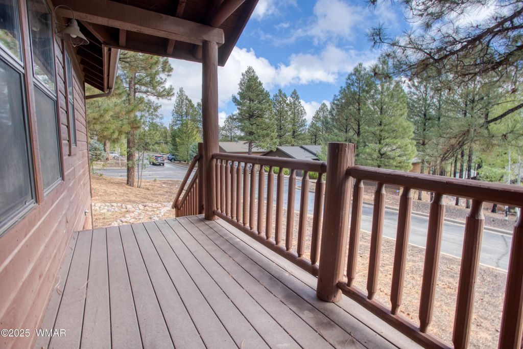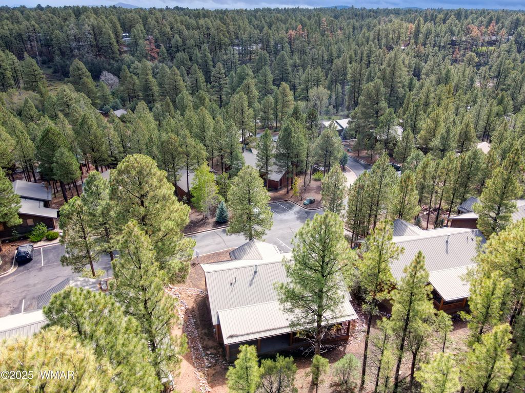 You'll fall in love with this adorable 2-bedroom, 2-bath cabin nestled among the tall pines in the highly desirable Bison Ridge neighborhood. This cozy retreat offers a split floor plan with spacious bedrooms and inviting living spaces perfect for relaxation or entertaining. Step inside to a beautiful great room featuring vaulted T & G ceilings and a stacked-stone gas fireplace that creates a warm and welcoming atmosphere. The primary suite includes double vanities, a private shower/water closet, and direct access to the extended covered back deck, the perfect spot to unwind or enjoy the sights and sounds of nature. The guest bedroom also opens to the deck, offering guests their own private retreat. HOA takes care of the landscaping and snow removal. As an added bonus there is private access to the National forest! Enjoy the serenity of mountain living while being close to everything; golf courses, hiking trails, Show Low Lake, shopping, restaurants, and even Sunrise Ski Resort for winter fun. This home is a fantastic rental, second home, or primary residence. Don't miss this opportunity to own your mountain getaway in one of Show Low's most popular communities!