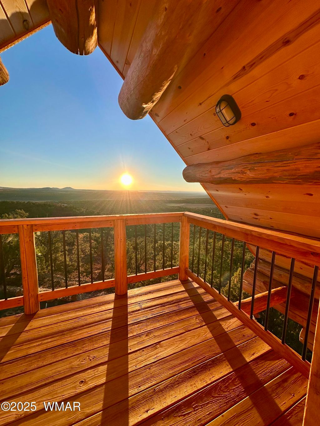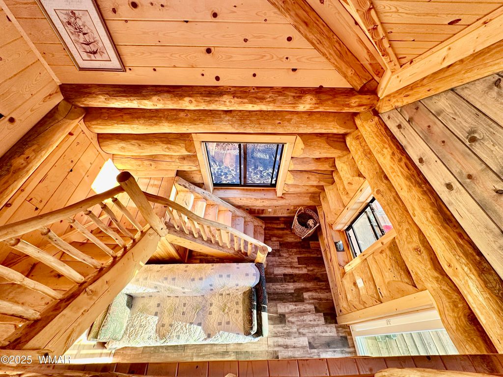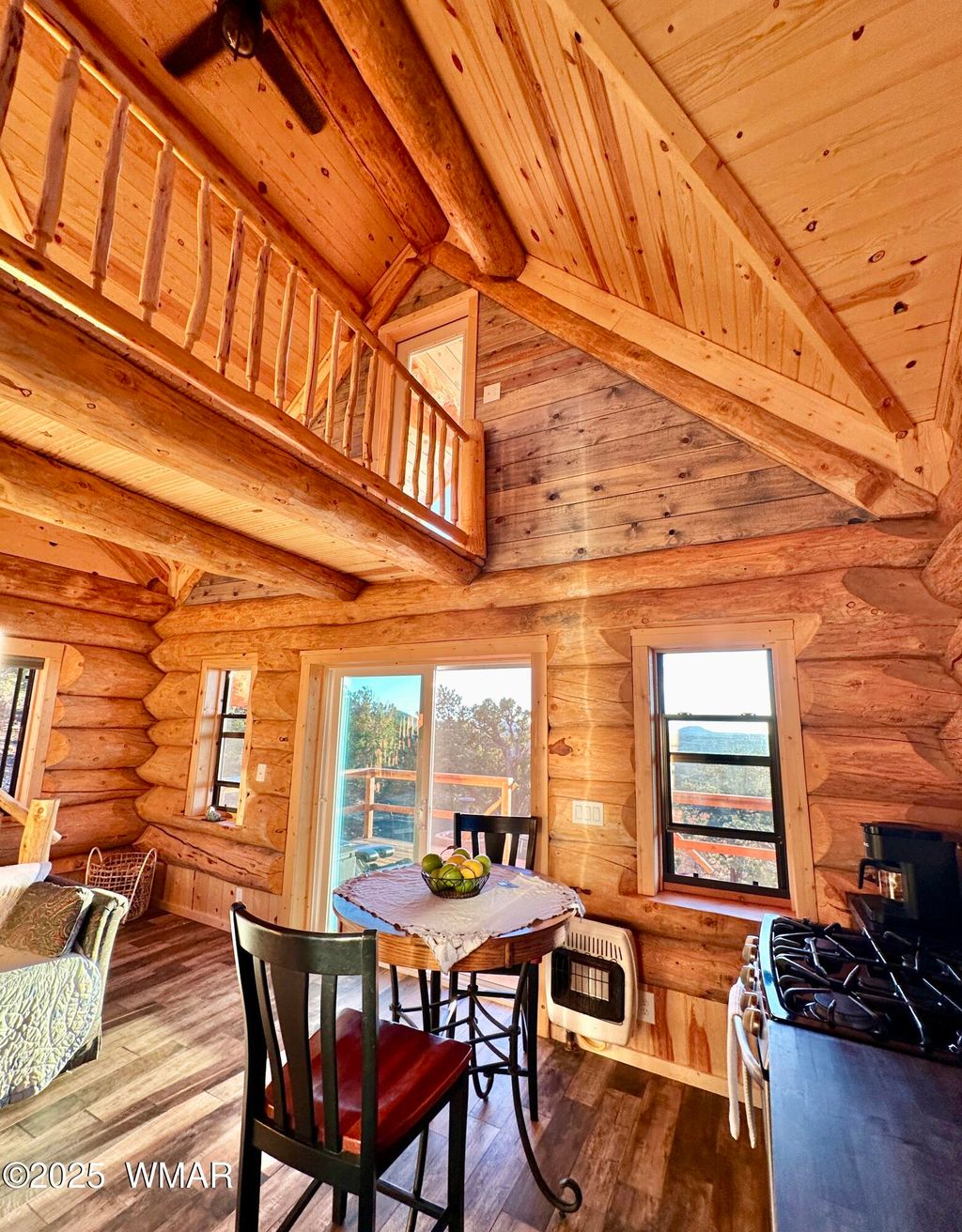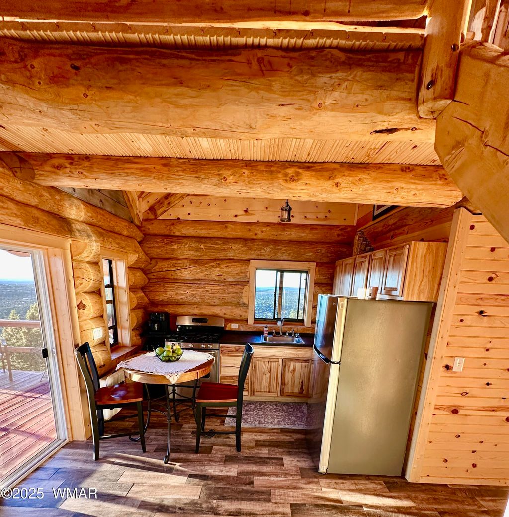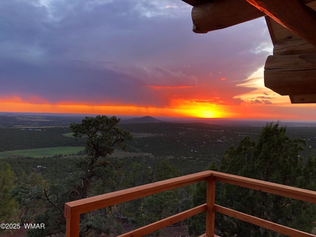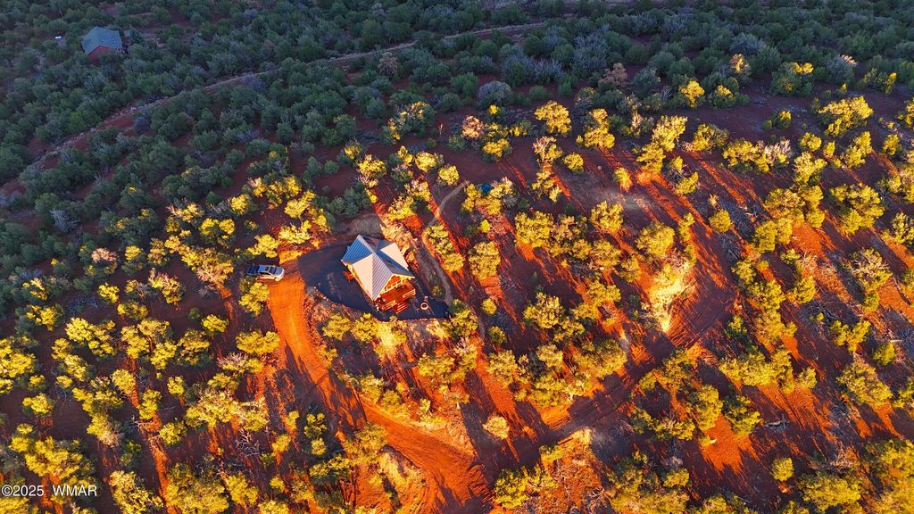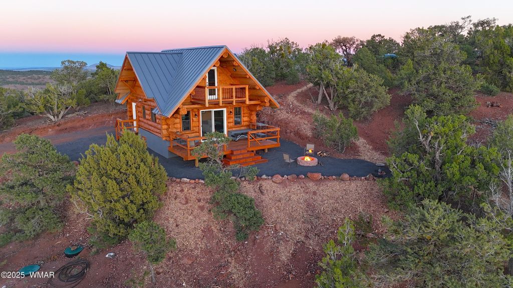 Experience refined mountain living at The Ridge, a handcrafted, 100% off-grid log retreat with panoramic views to the San Francisco Peaks. Perched across 3.5+ acres, this bespoke cabin blends artistry and sustainability with hickory cabinetry, porcelain tile, custom tile shower, and hand-peeled spruce logs. Solar power, propane heat, and a 1,500-gallon water system provide self-sufficiency in absolute comfort. Just minutes from Show Low and the Sitgreaves National Forest, this serene escape redefines elevated luxury living. Natural beauty, inside and out! Enjoy breathtaking sunrises and sunsets overlooking views all the way to the San Francisco Peaks from this custom-handcrafted, mountain-top retreat in the White Mountains. Designed and built by a master craftsman, this newly constructed, 100% off-grid, bespoke log cabin has everything required for sustainable living in a serene, tranquil setting. When you drive up the private road to the top of the mountain, the cabin's hand-peeled spruce logs harvested in and transported from Northern Minnesota seem to glow from within. The golden-cedar tone logs and the gray-green metal roof blend in with their surroundings while creating a striking contrast to the wide open sky. Welcome to The Ridge. Situated on 3.5 acres, you are on top of the world, at your own secluded retreat, 11 miles east of the beautiful mountain town of Show Low, and only 3 miles from the Sitgrieve National Forest. As you tear yourself away from the incredible vista and enter the cabin, you will see the natural beauty continues inside with hickory kitchen cabinets and black hardwood butcher block counters. Porcelain tile plank flooring in rich, earthy colors flows throughout the open floor-plan kitchen, dining, and living area and continues into the main-level, queen size bedroom and adjacent, fully-plumbed bathroom. The bathroom also boasts of a split-log vanity top, decorative bowl sink, a custom-made, tiled shower, and a water-saver toilet. Double-pane sliding glass doors lead onto a westerly facing, elevated back deck, where you can survey the valley below, revel in the quiet, and enjoy a spectacular sunset. Back inside, go up the hand-hewn staircase to find a spacious, open-loft bedroom with a hand-washed stained focal wall and buttery-soft, spruce tongue-and-groove flooring. Large enough for a queen bed and queen size futon, this room can be used as the main bedroom, a guest room for 4, or even a spacious library, craftroom, or office. However it is used, be prepared to be distracted: Another glass door leads to a balcony with even more breathtaking, panoramic views. This stunning retreat is off grid, but it is not lacking any of the comforts of home. Rooftop solar electric panels with battery storage provide all the power needed to run the entire house, including lighting, plenty of outlets, and a stainless steel refrigerator. Dual propane tanks fuel the stainless range and high-efficiency Rinnai propane heater. And a 1500-gallon water storage tank--with local delivery service--holds all water needed for clean, comfortable living. Whether you are looking for a full-time retreat or occasional get-away, for seclusion or proximity to adventures and exploring, The Ridge, at an elevation of 7200' and minutes from abundant trails throughout the largest ponderosa pine forest in the country, will not disappoint!