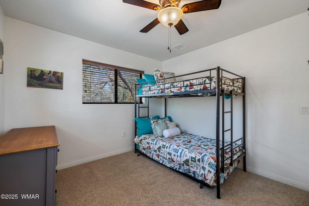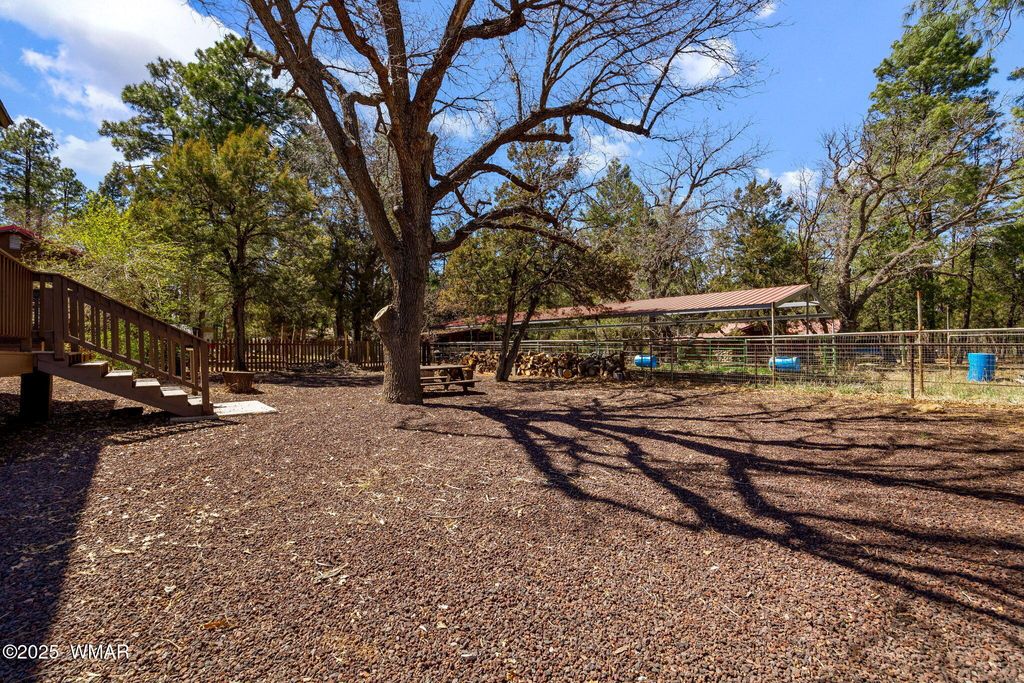 Charming 3-Bedroom, 2-Bath Home - Tucked Away Yet Centrally Located! Built in 2009 & meticulously maintained, this home features a primary bedroom downstairs w/bath, two bedrooms, & another full bath upstairs. Ceiling fans in all bedrooms. Bright & open with vaulted ceilings and abundant windows, the home is surrounded by mature trees for shade and charm. It's just a short walk to Rainbow Lake, perfect for relaxing or enjoying nature. Outside, there's a fire pit and a large detached shed/garage for storage, hobbies, or parking. Mostly furnished, this home has a new HVAC (2023), new roof (2025), fresh exterior paint (2024), & cinder gravel landscaping for low-maintenance living. Ideal as a primary residence, vacation retreat, or investment, this home combines comfort, charm, and location One of the Sellers holds an active real estate license in the state of AZ