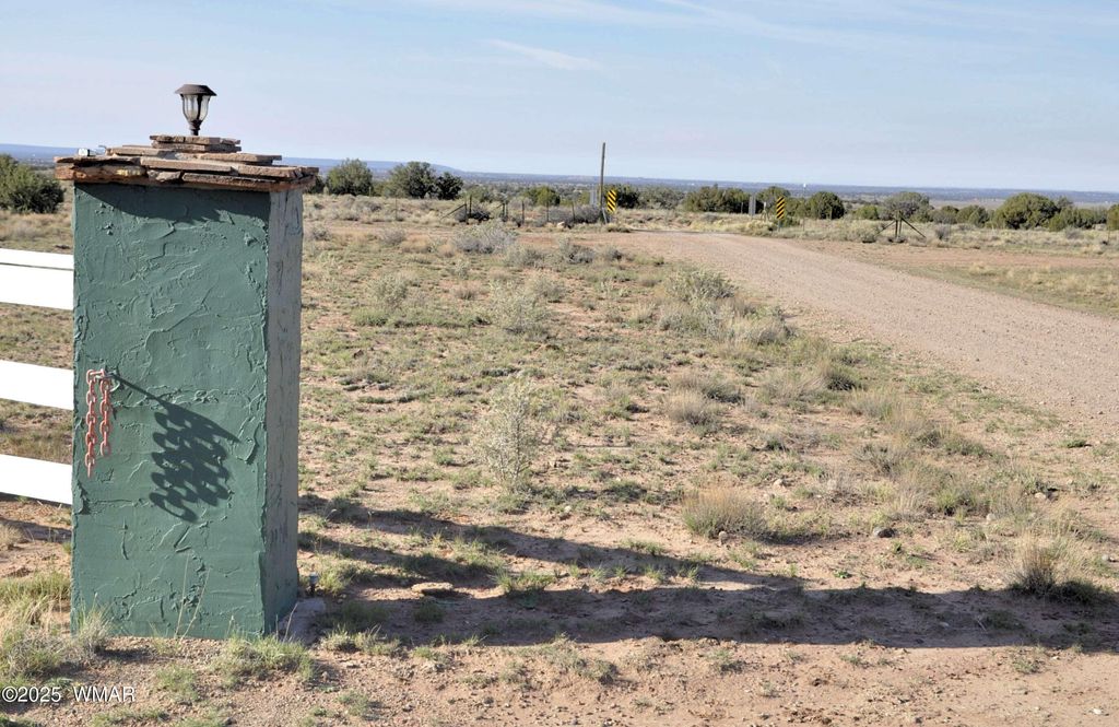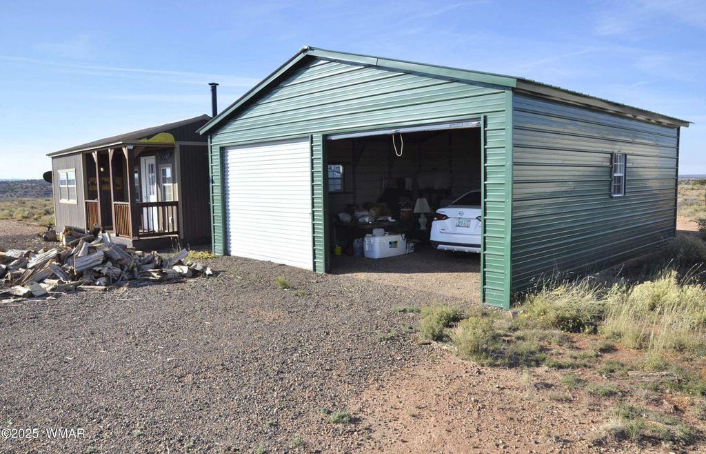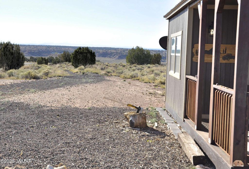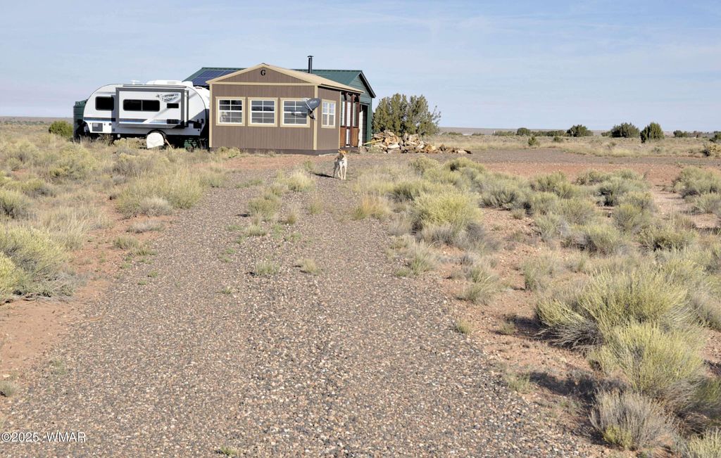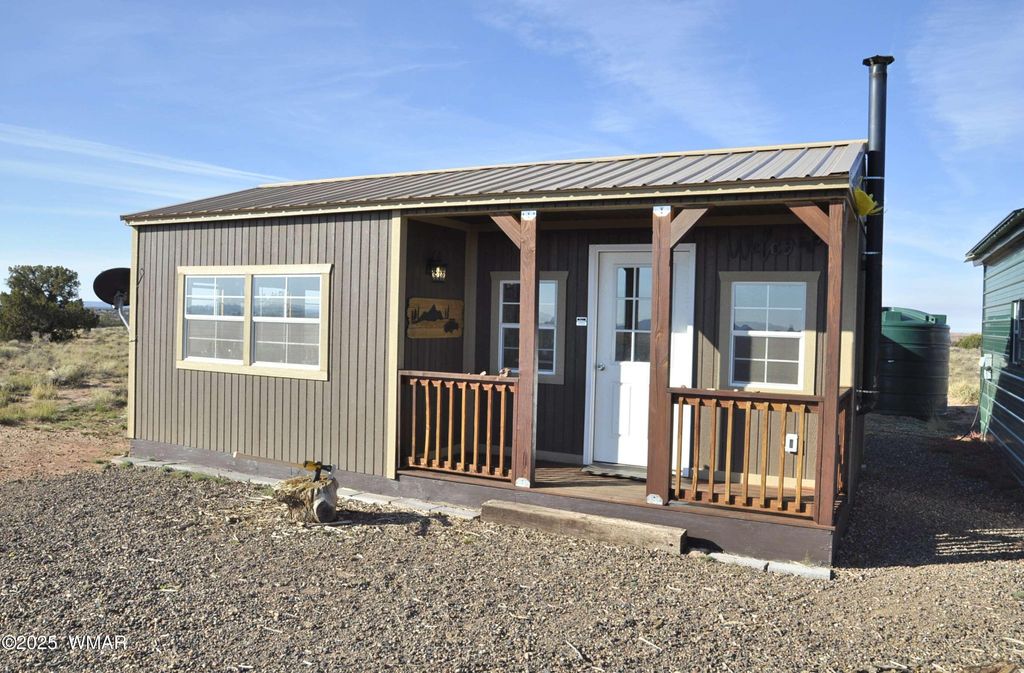 Small home with gorgeous views, on 5.74 fenced acres. Property right off the pavement for great access, and elevated, providing outstanding views of the White Mountains to the south. Live sustainably and self sufficiently on this off grid property, only 14 mi to Concho, and approx 45 mi to Show Low. 24x24 metal garage, plus 10x12 and 8x12 storage sheds, providing a lot of storage space. 2 water holding tanks (2000 & 1000 gal's) for water delivery or hauling. Solar system (owned) contains ten 250 watt panels, providing ample power to the property. Wood burning stove keeps home toasty warm during the cooler months. Driveway is graveled, with very easy access off Hwy 180. Property sits over Coconino Aquifer which would provide great water if well drilled. Photos were taken during hazy (cont) (prescribed forest burning) so mountains to the south are very faint...but usually clear and beautiful. Owner may carry, depending on offer and terms.