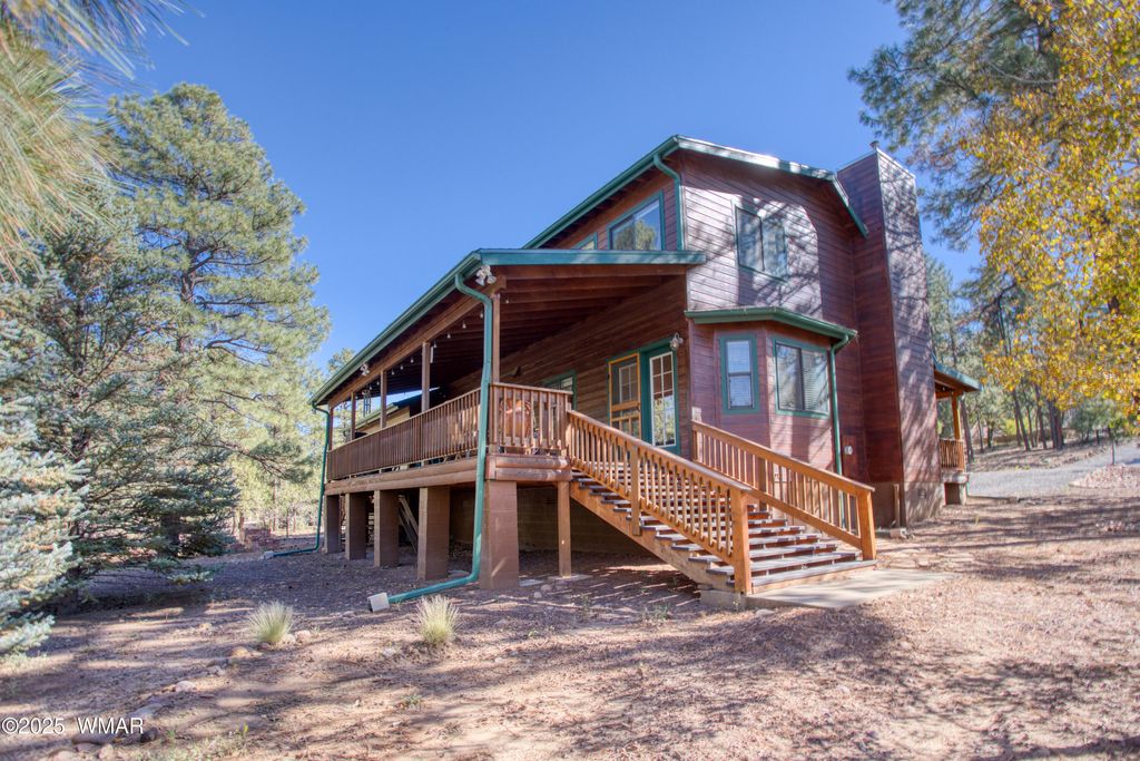 Nestled in the tall pines of Show Low, this stunning cabin offers serene mountain living with modern comfort. A flowing tile floor welcomes you into the light-filled great room, where a floor-to-ceiling rock fireplace anchors the open layout. Tongue-and-groove ceilings with skylights add rustic charm and natural brightness. The spacious kitchen features peninsula bar seating and abundant light, seamlessly connected to a cozy bay-window dining nook. A large pantry leads to the expansive covered back deck"”perfect for entertaining or relaxing in the fresh mountain air. The main-level primary suite boasts a generous ensuite with double vanity, walk-in shower, and even a bidet. Upstairs, a beautiful staircase leads to an open loft with built-in desks, ideal for a home office. Read 'more' The kitchen was remodeled with beautiful granite and under cabinet lighting. Two additional bedrooms and a well-appointed guest bath complete the upper level. Set on a wooded lot in one of Show Low's most desirable areas, this home is a true retreat in the pines. Ideally situated just minutes from the heart of Show Low, this cabin offers the perfect blend of peaceful seclusion and everyday convenience. Enjoy quick access to shopping, dining, and essential services including the hospital all while being tucked away in a tranquil, wooded setting. Outdoor enthusiasts will love being just a short drive from scenic Show Low Lake, where fishing, kayaking, and lakeside picnics await. Whether you're seeking adventure or amenities, this location delivers the best of both worlds. Imagine living in the White Mountains of Arizona where you have 4 beautiful seasons and where you can breathe in the fresh mountain air and enjoy the 40 lakes and over 600 miles of rivers and streams. In addition to the amazing fishing, this area has one of the most extensive trail systems in the southwest for hiking, biking, horseback riding, quadding and more. Sunrise Ski Resort is also just 50 minutes away with 3 beautiful mountains to ski, snow board or sled. If shopping is your interest, you will love the antique stores and the multitude of arts and craft shows that happen in the summer. The music festivals have something to fit everyone's enjoyment. Do you love to golf? There are 7 amazing golf courses, 3 that are public. The White Mountains, where this home/cabin is the best kept secret of Arizona! Come and explore and enhance your living! Pinetop-Lakeside was also voted 'Best Cabin Region in the U.S"... Embrace the MAGIC!