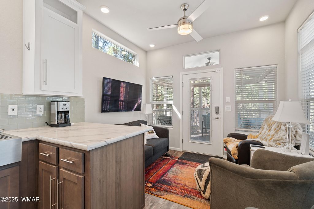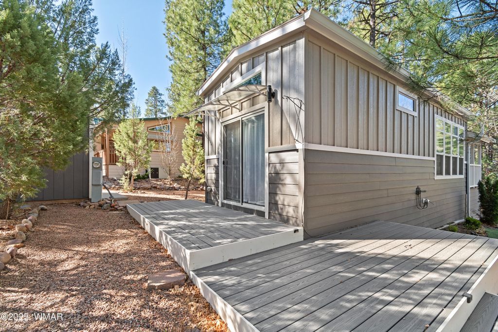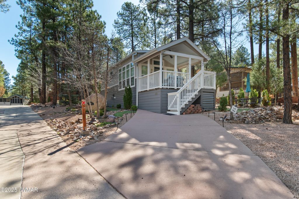 Discover this stunning park model at White Mountain Vacation Village, designed for both comfort and style. Boasting numerous upgrades, this home is the perfect blend of modern convenience and cozy retreat. The large, covered front porch is ideal for year-round enjoyment, whether you're savoring a morning coffee or relaxing in the mountain air. Inside, the inviting living space features durable LVP flooring and an updated kitchen with ample counter space, custom cabinetry, and sleek stone counters. With a gas range, stainless steel appliances, and a charming apron sink, this kitchen is as functional as it is stylish. The light and bright interior is enhanced by high ceilings that welcome in an abundance of natural light, creating an airy and open ambiance. The oversized bedroom offers excellent storage solutions, including updated closet space and chic custom barn doors. The bathroom is equally impressive, featuring a large shower, a double vanity with stone counters, and modernized lighting to complete the luxurious feel. Truly a gem, this park model combines comfort, practicality, and beauty in one exceptional package. Don't miss your chance to call this mountain escape your own! White Mountain Vacation Village is a charming community located in Show Low, Arizona, offering a unique blend of mountain living and modern amenities. Situated at an elevation of 6,500 feet, this planned unit development (PUD) is designed with families in mind and provides a variety of activities and features for residents. The community boasts a clubhouse and outdoor pavilion where residents can enjoy activities like line dancing, crafts, bocce ball, and potlucks. The serene environment is complemented by the natural beauty of the area, making it an ideal spot for those seeking a peaceful retreat or a vibrant social atmosphere.