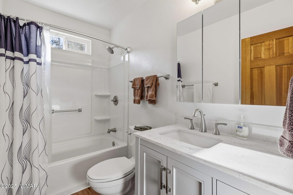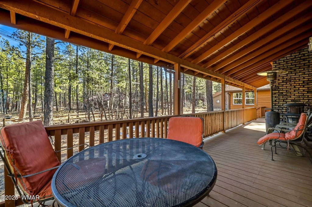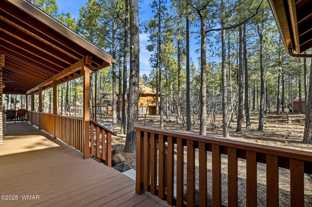 Nestled in the sought-after Pinetop Lakes Country Club, this inviting mountain cabin blends rustic charm with modern comfort. Rich wood accents and soaring vaulted ceilings with exposed beams create a warm, welcoming atmosphere, complemented by hardwood floors in the great room. The home offers four bedrooms and two-and-a-half baths, including updated bathrooms.Situated on an expansive 0.53-acre lot, the property features a massive circular driveway, new wraparound covered decks ideal for outdoor entertaining, and a large two-car garage. A newer roof adds peace of mind. Ownership includes membership to the nearby recreation center"”within walking distance"”offering a pool, spa, pickleball courts, and fitness facility.Ideally located near the national forest with direct access to hiking trails, and just minutes from golf courses and fishing lakes, with a ski resort only 30 minutes away. This is mountain living at its finest.