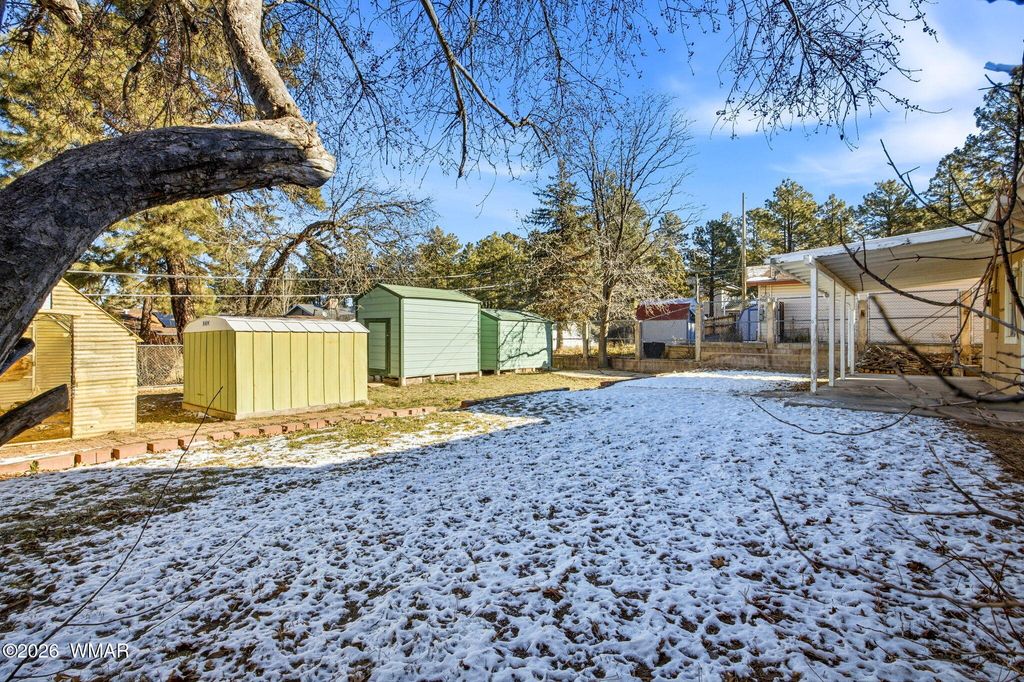 Affordable 3-bedroom, 2-bath home for sale in Show Low, AZ, located directly across the street from the park and just minutes from Safeway, shopping, dining, and local amenities. This home is a great option for a first-time home buyer, vacation getaway, or investment property in the White Mountains. Inside, you'll find a woodstove that provides efficient heat during cooler mountain seasons. The fully fenced backyard includes multiple storage sheds and a greenhouse with power, offering space for storage, hobbies, or gardening. The front of the property has room to park an RV, trailer, or additional vehicles"”hard to find this close to town. With a central Show Low location, easy access to parks, stores, and year-round outdoor recreation, this property offers convenience, functionality and value. Whether you're looking for a full-time residence, weekend cabin, or short-term rental opportunity, this home is worth a look.