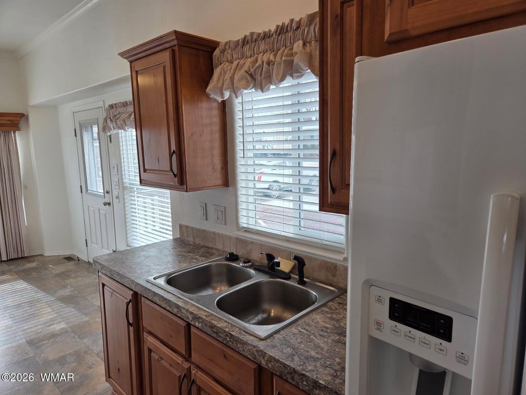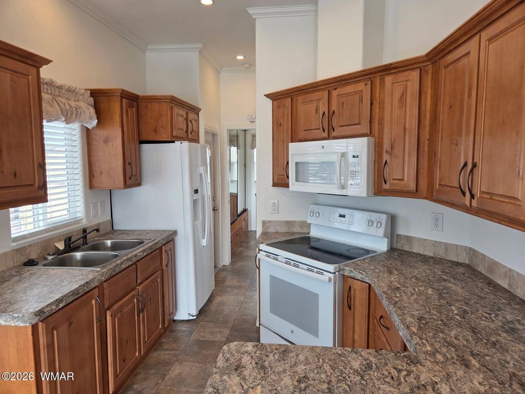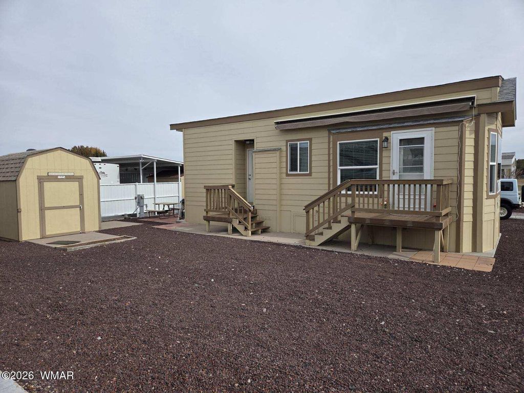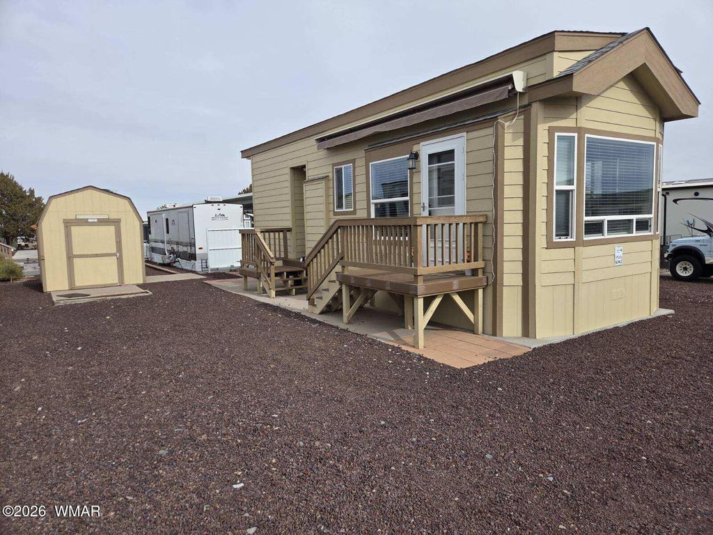 This beautifully maintained park model at Juniper Ridge Resort shows like a model home. The warm honey-toned wood cabinetry creates an inviting atmosphere throughout, complemented by attractive stone-look countertops in both the kitchen and bathroom. The kitchen is a standout feature with its thoughtful layout, ample cabinet space, tile backsplash, and all white appliances included. The bedroom comfortably accommodates a king-size bed, with generous storage solutions built throughout the home. The bathroom continues the quality finishes with coordinating counters, modern black fixtures, and matching wood cabinetry. Step outside to your covered deck with remote-controlled awning - perfect for enjoying Show Low's four-season climate. The property includes a substantial storage building with built-in shelving, providing plenty of room for outdoor gear and seasonal items. Resort living at its finest - Juniper Ridge offers an active lifestyle with a swimming pool, relaxing spa, workout equipment, game hall, craft activities, community events, and so much more. Your HOA fees cover water, sewer, trash, and common area maintenance (electric and internet are separate).
