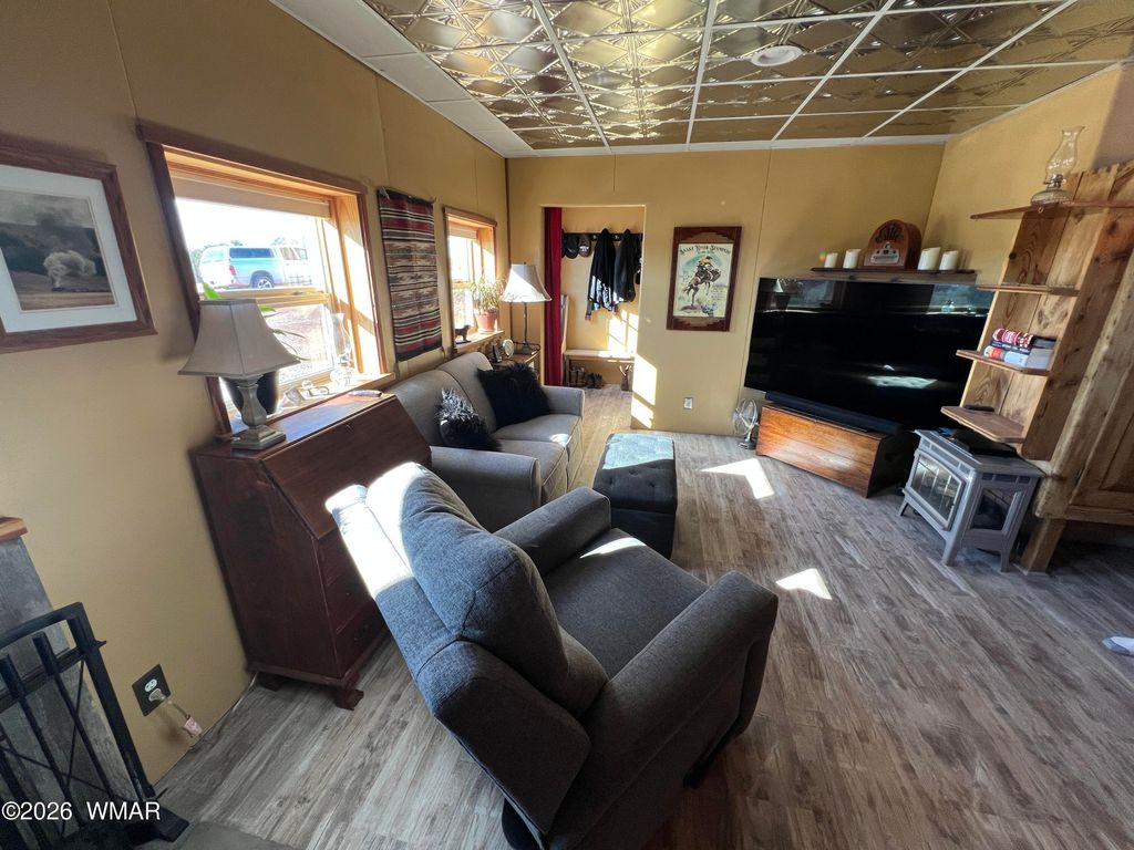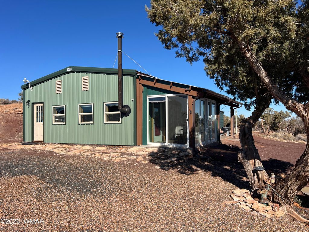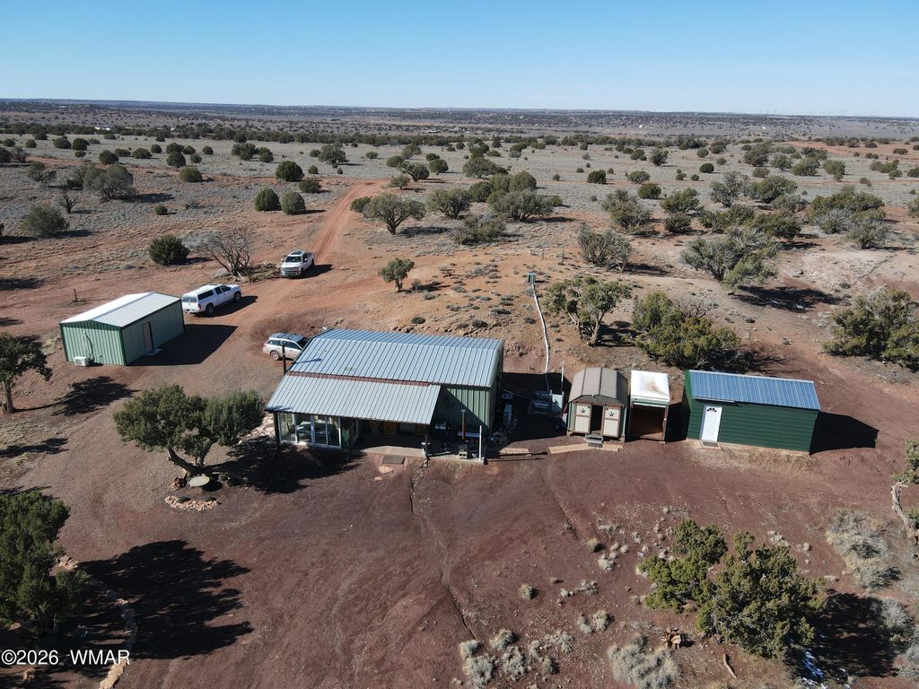 40 acre property with a beautiful home, with two shops and two storage buildings located in the Snowflake area. This property is a must see. Quiet location with views of the white mountains. APS underground electricity, private well and secluded private location. All metal no maintenance structure, with hot and cold air split system. Arizona room with views of the mountains. Deep well with brand new water filtration system and excellent pressure and abundant water. RV Hook up, numerous fruit trees and outdoor spaces. This property was originally built for an owner who had electromagnetic hypersensitivity. Inside the home you will find numerous upgrades and custom features. Farmhouse sink with custom backsplash, custom granite and wood butcher block countertops, stainless appliances. Custom fit wood stove. 2 bedrooms 2 bathrooms with large living and kitchen area and separate office room. Well built cozy and comfortable with low maintenance design. Total permeant structure Square feet = 1,440.
