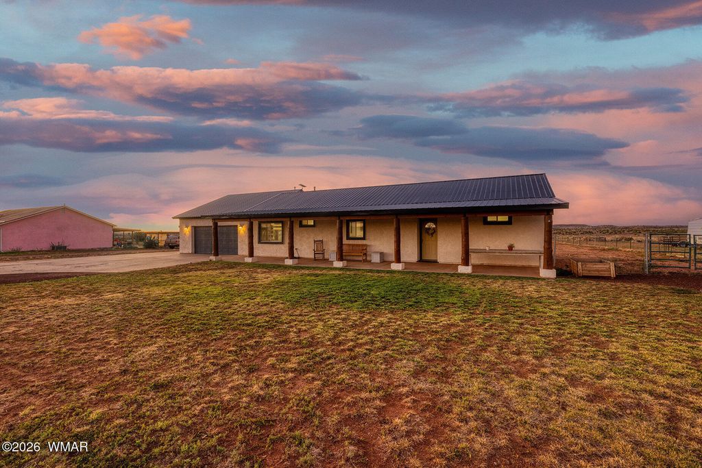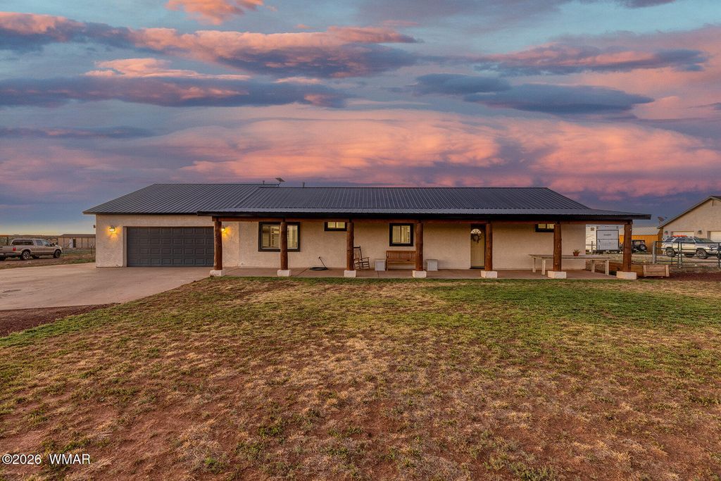 Welcome to peaceful small-town living! This move-in ready 3 bed 2 bath home sits on 1.18 acres of horse property with sunset views, full-length covered porches. Exterior features a newer metal roof, completely enclosed backyard Inside features vaulted ceilings, custom kitchen cabinetry, updated appliances, & a spacious primary suite with walk-in closet. Thoughtful touches include built-in bunk & loft beds, French doors, an outdoor-access laundry room with chalkboard wall, & a huge 25×8 storage room. The oversized 25×25 garage includes built-in shelving & a monitor for the hardwired security system. Fully fenced yard with 3 large gates, circular drive, RV parking with 2 hookups, apple trees, a rose bush, & Starlink internet. Country charm meets modern convenience. Your dream home is ready