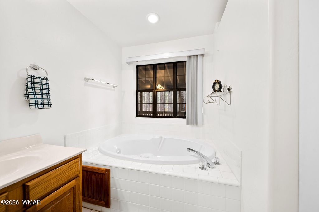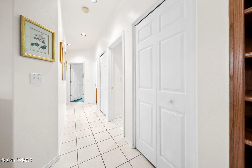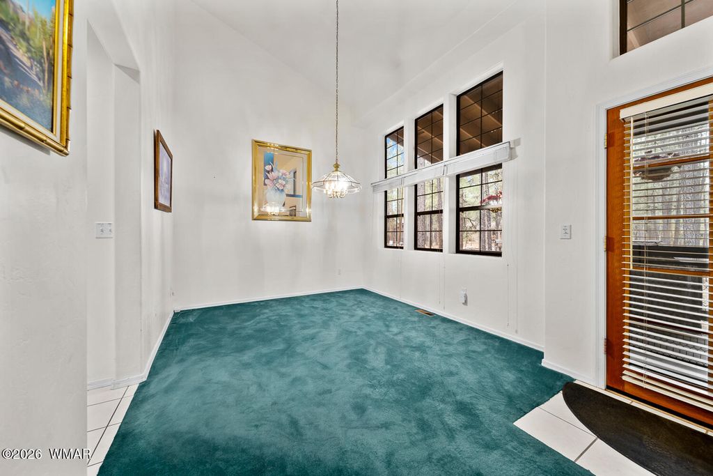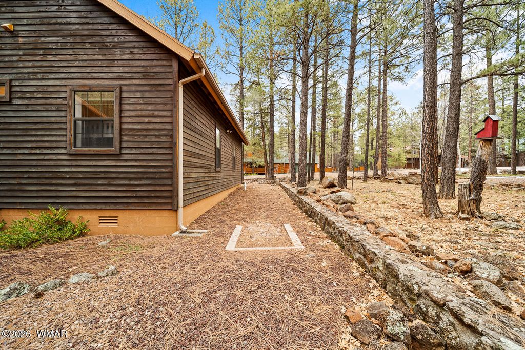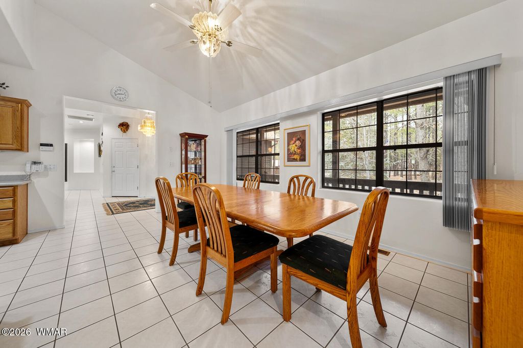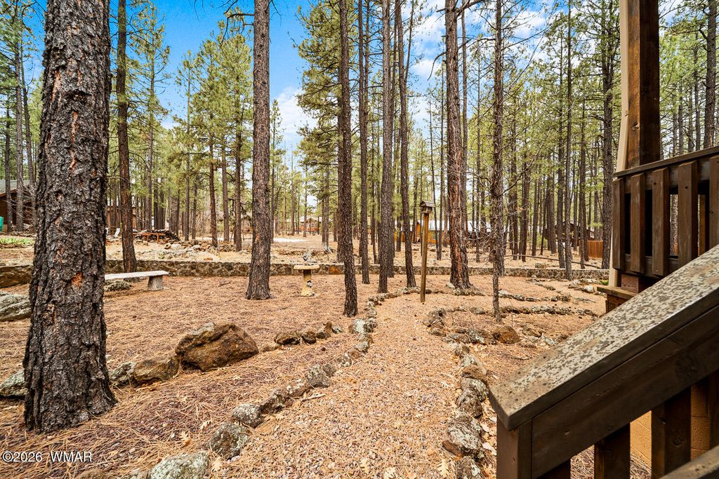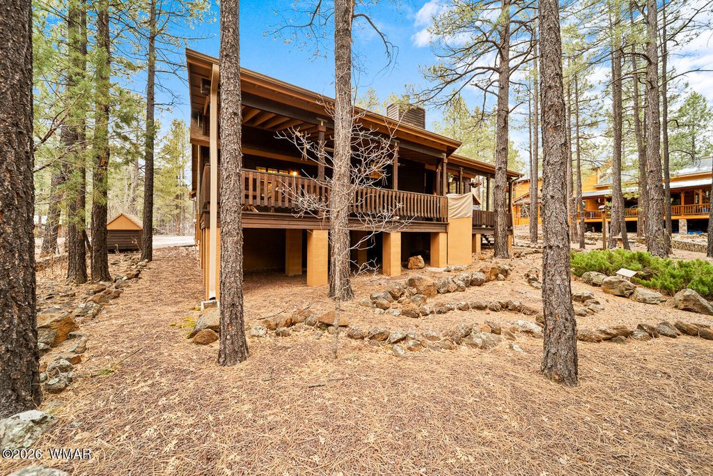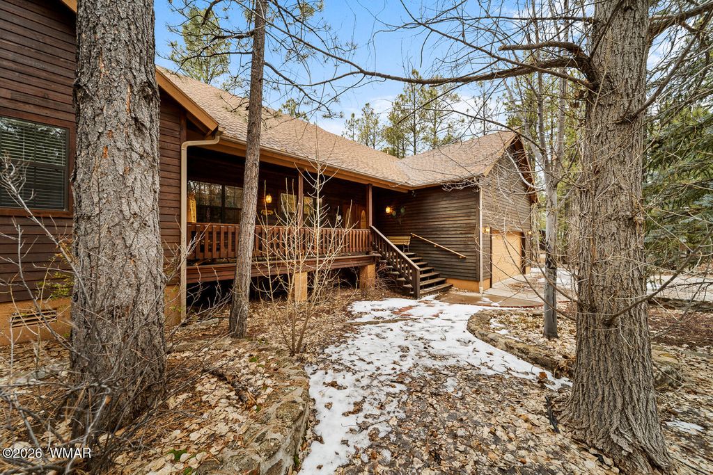 Located deep in a quiet area of the highly desirable Pinetop Country Club area, this beautiful property offers privacy, space, and comfort just minutes from town. A large easement area between neighbors adds to the peaceful, secluded setting surrounded by trees and views. This beautiful 4-bedroom, 2.5-bath home features high vaulted ceilings and a welcoming entry that opens into a spacious living room. The kitchen, separate dining room, and three bedrooms are thoughtfully arranged to the left side of the home, creating an ideal layout for functionality and flow. To the right, the oversized owner's suite provides a private retreat with a very large walk-in closet and direct access to the back deck. Outdoor living is a highlight, with a serene front porch and an enormous covered back porch.
