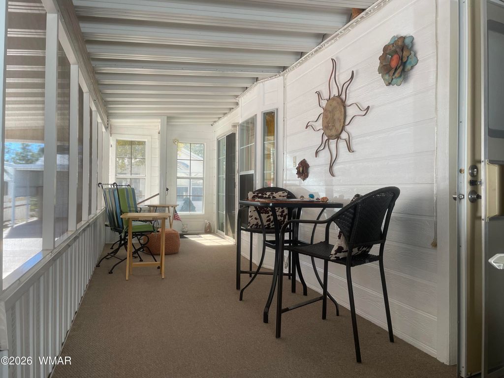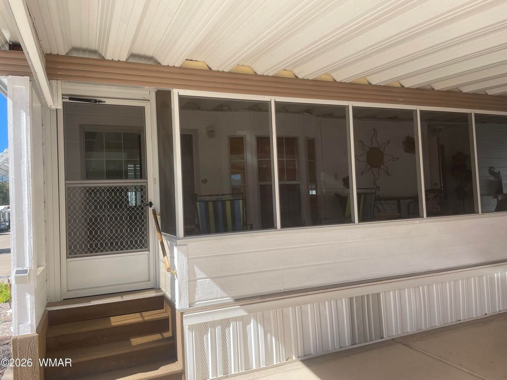This 1-bedroom, 1-bath home is located in Venture In, nestled in the White Mountains. The home offers a well-sized kitchen and comes fully furnished. The primary bedroom features a mirrored closet. Additional space includes a large screened-in porch, an Arizona room, an enclosed back area, and a utility room with washer and dryer. Venture In is a 55+ community open from May 1 through October 31. The annual park lease is $6,216, which includes water and garbage. The home is personal property on leased land managed by Venture In.