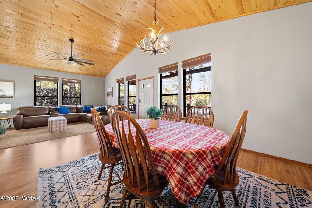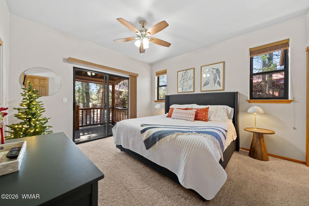 Enjoy all Torreon has to offer in this very private home located in Cardinal Landing. Wooded property with Tall Pines, nicely landscaped. Large covered front deck. Back patio with Privacy Wall that invites outdoor living, grilling and stargazing under clear mountain skies. Inside the floor plan is designed for ease and comfort with vaulted ceilings, natural light, and a beautiful floor to ceiling stone fireplace. Large dining area and breakfast bar offers room for everyone. The primary bedroom is spacious with its own private covered deck to enjoy the fresh air. Laminate flooring in dining, kitchen and hall. Carpet in living room and bedrooms. Cardinal Landing is a gated neighborhood within Torreon which offers amenities galore. Family Center, Pool/Spa, Fitness Center, Pickle Ball