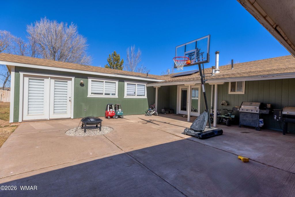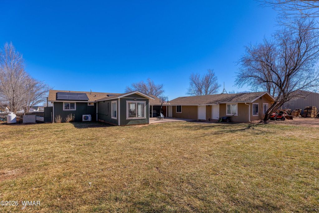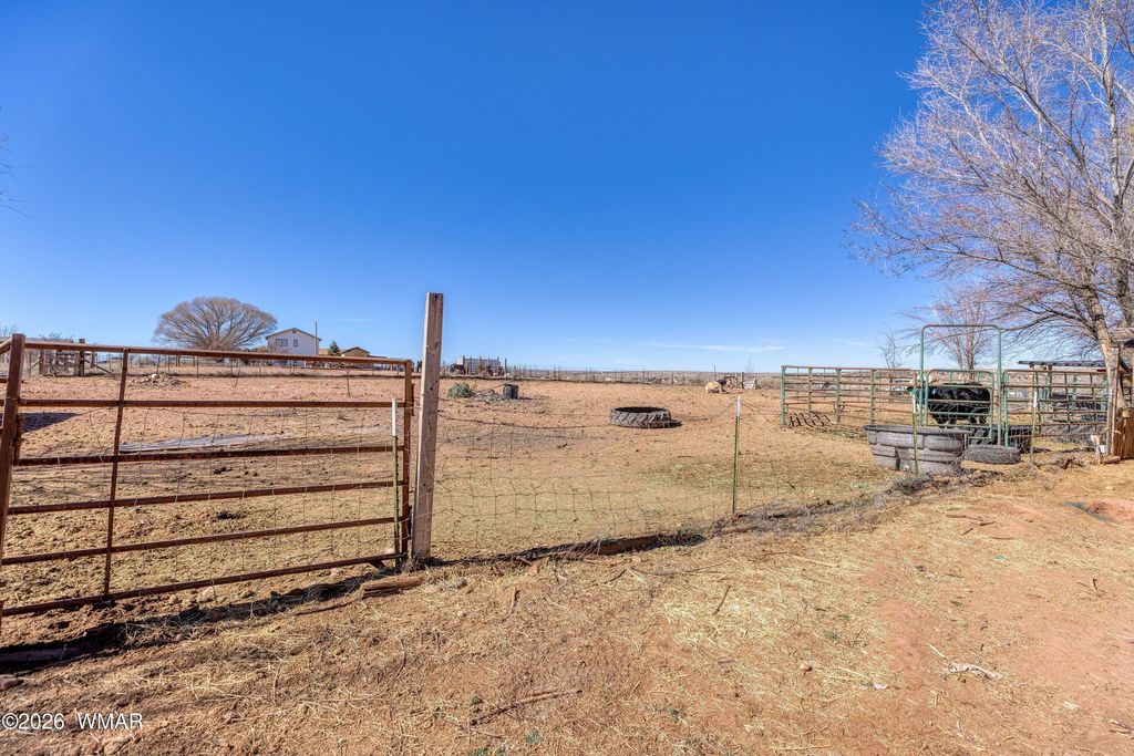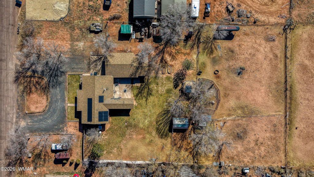 Rare opportunity on 1.17 fully usable acres offering space, function, & long-term flexibility. Property is thoughtfully laid out w/separate fencing for horses or livestock, sprinkler-irrigated yard, mature shade and fruit trees, garden area, chicken coop, storage shed, & an RV gate w/rear access. Home features 3 bedrooms and 2 bathrooms w/split-bedroom floorplan & comfortable flow. A sun-filled galley kitchen provides abundant counter space, solid cabinetry, & a window-lined dining area. Recent improvements include dual blinds, mini-splits, & fresh exterior paint. An oversized 2-car garage offers shop capability. A finished flex room adjacent to the garage, currently used as a gym, provides office or hobby space, & possible 4th bedroom. Complete with porches and circle driveway.