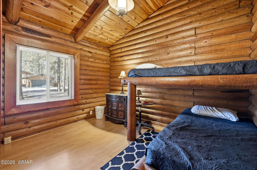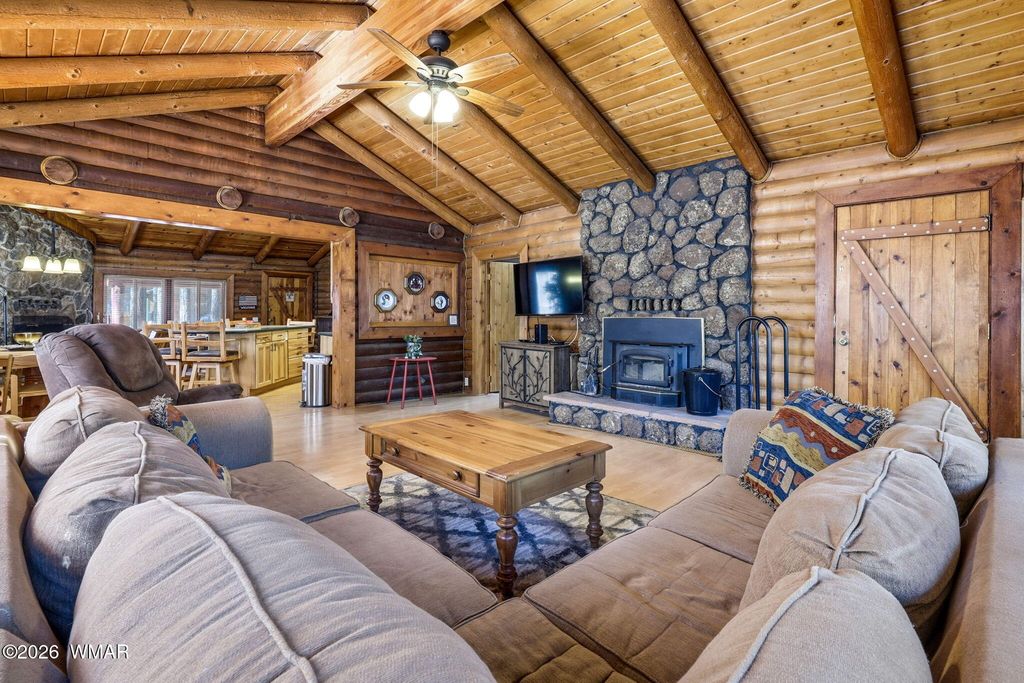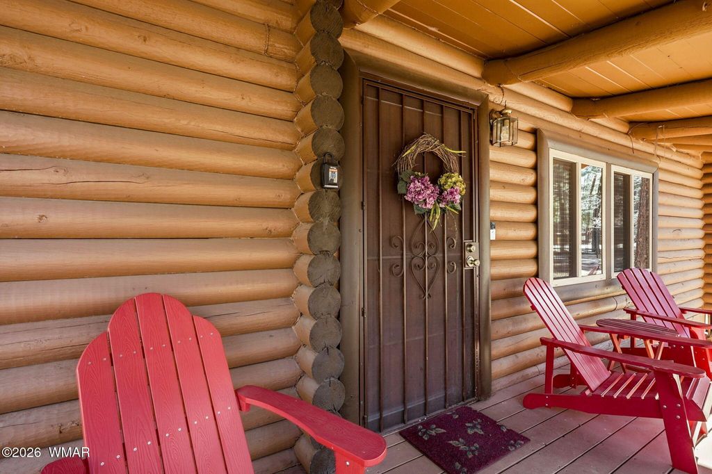 Tucked in the highly desirable Pinetop Country Club, this 3 bedroom, 2 bathroom log cabin delivers the true mountain escape buyers dream about- privacy, towering pines, and direct access to miles of adventure right out your back door. Step outside and take in the expansive USFS land behind the property, creating that rare ''nothing but woods'' backdrop that's getting harder and harder to find. Whether it's morning coffee with birdsong, evening wildlife sightings, or spontaneous trail exploring, this setting brings the outdoors to you. Even better, a Forest Service road sits right next door, making it effortless to bring the side-by-sides, quads, and outdoor toys. No trailering across town required! Inside, the cabin experience shines with warm wood tones and a huge statement fireplace... that anchors the living space. The kind of place you'll naturally gather around on snowy evenings or slow mornings with a hot cup of coffee. It's cozy without feeling cramped and perfectly suited for both quiet weekends and hosting friends after a day outside. The 0.37-acre lot offers space to breathe, and the fully fenced backyard adds flexibility for pets, kids, or simply enjoying your own private retreat. A 1-car garage provides valuable storage for gear, tools, and mountain essentials. Location-wise, this one is hard to beat. You're a quick ~40 minutes from the base of Sunrise Ski Resort for winter skiing and summer mountain fun. Close to the Hon-Dah Casino. Surrounded by lakes, hiking trails, and endless outdoor recreation. Minutes from dining, shopping, and local favorites in Pinetop, including spots for live music and patio dining in the warmer months. Whether you're looking for a full-time mountain home, a seasonal getaway, or a STR investment, this cabin delivers in every aspect. Call and schedule your showing today!!