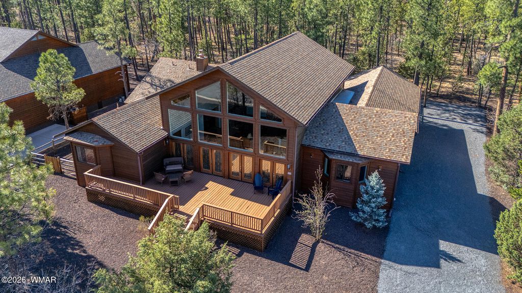 An Elevated Mountain Sanctuary in the Heart of Pinetop! Welcome to a one-of-a-kind, FULLY FURNISHED luxury retreat where refined elegance meets the soul-soothing beauty of the White Mountains. Nestled among towering pines on a beautifully landscaped 0.33-acre homesite w/ an open lot behind, this 3,531-square-foot masterpiece offers privacy, presence, & an unforgettable mountain lifestyle. From the moment you arrive, the home invites you to slow down, breathe deeper, & settle into mountain time. Step inside to a breathtaking great room defined by soaring vaulted T&G ceilings w/ ambient backlighting, walls of glass that flood the space w/ natural light, & a stunning slate fireplace that anchors the room w/ warmth & sophistication. Imagine snow falling outside while you cozy up by the fire. Designed with entertaining in mind, this home effortlessly hosts everything from intimate wine nights to lively holiday gatherings. The expansive layout flows beautifully between the great room, family room, kitchen, loft, and oversized deck, allowing guests to gather, mingle, and relax in multiple inviting spaces. The chef's kitchen is the heart of the home, featuring a striking stone island with bar seating, custom cabinetry, abundant counter space, and a layout that keeps the host at the center of the action. Whether you're preparing a gourmet dinner, hosting Sunday brunch, or serving appetizers after a day on the trails, this space was created for connection. The additional fireplace separating the great room and family room creates dual gathering areas, perfect for conversations by the fire, movie nights, or quiet moments away from the crowd. Upstairs, the iron spiral staircase leads to a dramatic loft retreat with its own walkout landing; ideal as a private lounge, creative studio, or executive-style home office overlooking the grand living space below. The main-level primary suite is a true sanctuary. Vaulted ceilings, natural light, and generous space create a peaceful escape, while the spa-inspired ensuite bath offers dual vanities, custom cabinetry, a walk-in shower, and your very own cedar sauna - bringing the luxury of a mountain resort directly into your daily life. Guests will feel equally pampered with a private-entry ensuite bedroom and a third spacious bedroom and bath, ensuring comfort and privacy for family and friends. Outside, the oversized wood deck becomes an extension of your living space, perfect for summer evenings under the stars, morning coffee surrounded by pines, or aprĂƒÂ¨s-ski gatherings with laughter echoing through the trees. Additional features include: " New roof (2023) " Two furnaces & two A/C units for year-round comfort " Side-entry garage " Open lot behind for enhanced privacy " No rentals allowed, preserving the integrity and exclusivity of the community What Mountain Living Truly Means Here As a full-time residence, this home offers daily tranquility, four-season beauty, cooler summers, and the peace of waking up surrounded by forest. As a part-time retreat, it becomes your private escape from the desert heat; a place to unplug, recharge, and reconnect. Spend your days hiking, golfing, fishing, skiing, or exploring the White Mountains, then return home to fireside evenings and crisp mountain air. This is more than a cabin. It's a gathering place. A holiday home. A sanctuary. An entertainer's dream. A legacy property where memories are made for generations. Luxury, warmth, privacy, and lifestyle - all in the heart of Pinetop. Discover the White Mountains of Arizona - where adventure, beauty, and fresh mountain air come together. Enjoy four stunning seasons, 40 lakes, and 600+ miles of rivers and streams, perfect for fishing, kayaking, and exploring. Hit the trails on one of the largest trail systems in the Southwest, or spend winter days at Sunrise Ski Resort, just 40 minutes away with three mountains of skiing, snowboarding, and sledding. Love shopping or culture; wander through antique sh