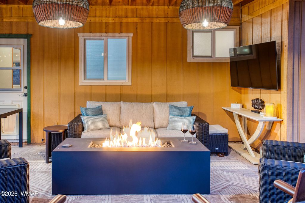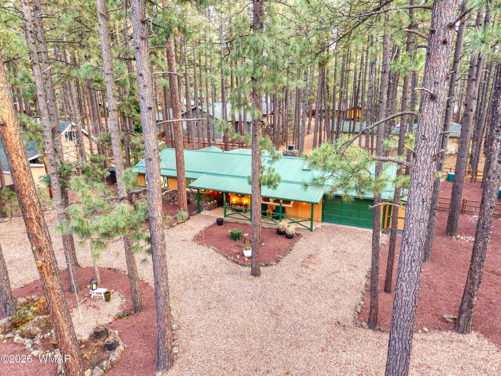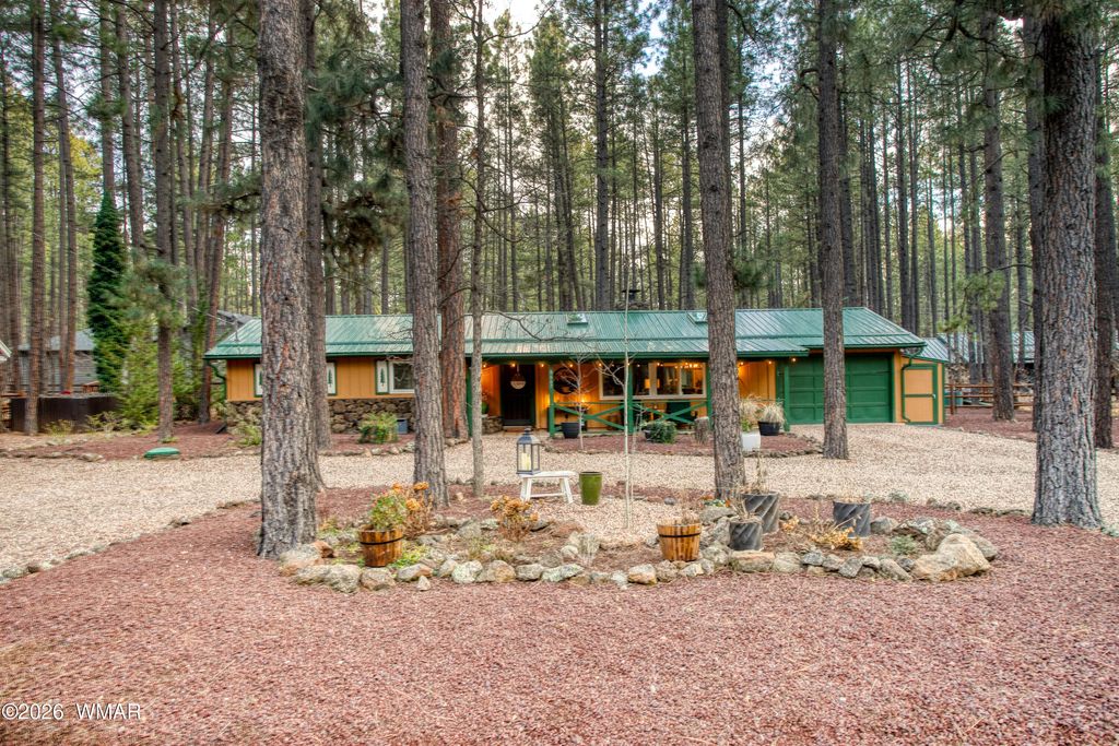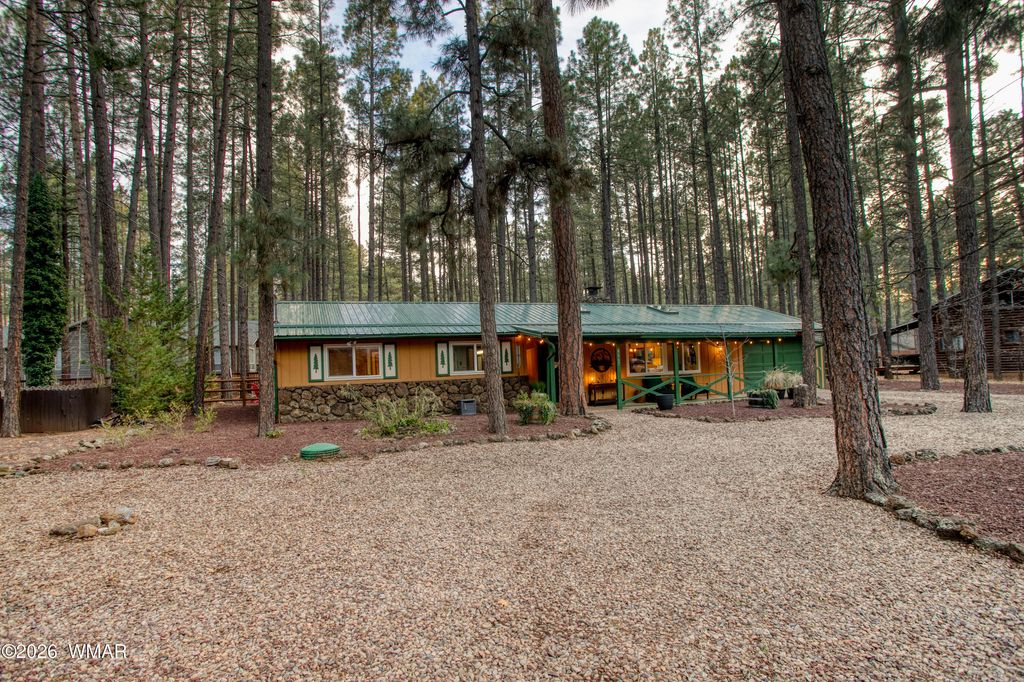 Tucked among the pines in Pinetop Country Club, this charming mountain cabin offers the perfect blend of rustic warmth and thoughtful updates, ideal as a full-time residence or a part-time getaway with excellent Airbnb potential. The inviting great room features vaulted ceilings with exposed beams and a cozy wood-burning fireplace with Heatilator. Additional features include a metal roof, updated kitchen with hickory cabinets, granite countertops, renovated bathrooms, and durable wood plank flooring throughout. With three bedrooms and two full bathrooms, the home provides comfortable living and abundant storage, including a one-car garage with cabinets, storage closet and an additional storage shed. Enjoy outdoor living on the newly constructed expansive covered paver patio with custom lighting, overlooking a beautifully designed yard complete with extended pavers, artificial turf, and charming split-rail fencing.