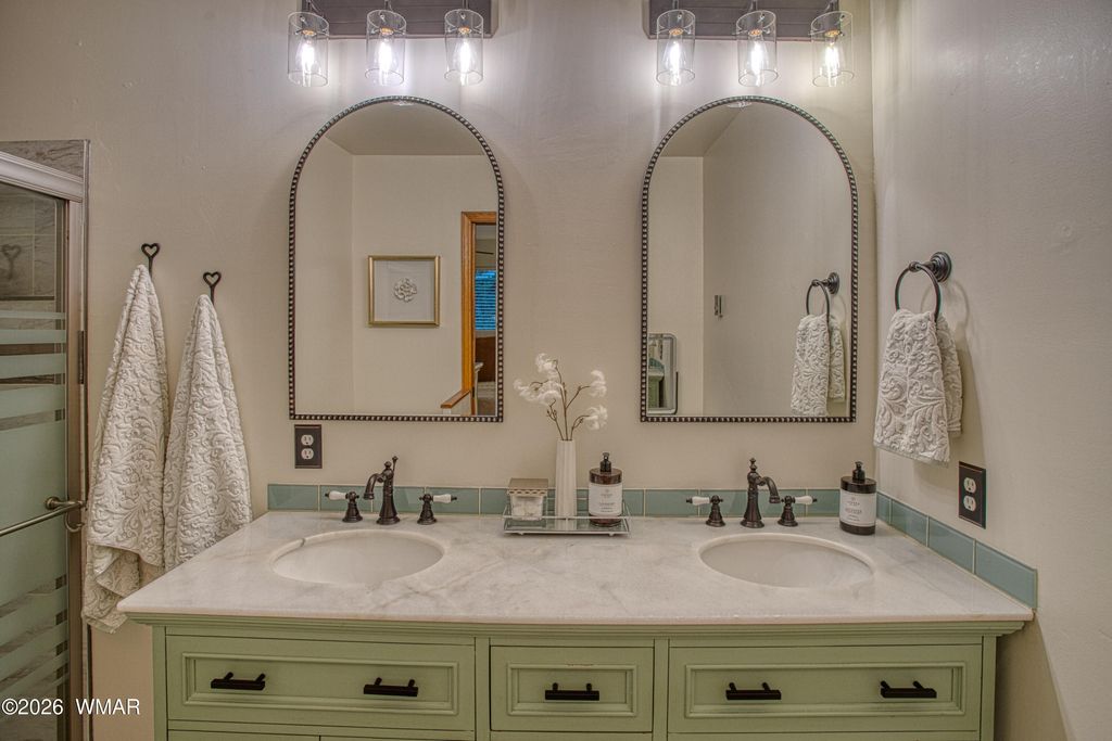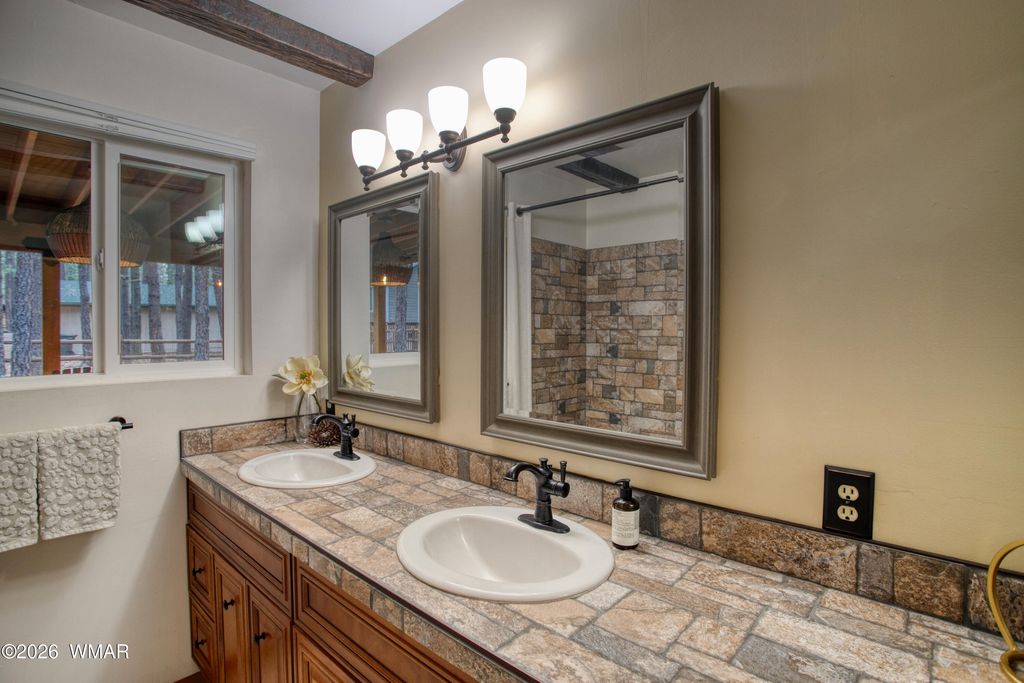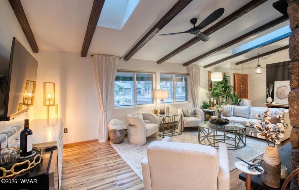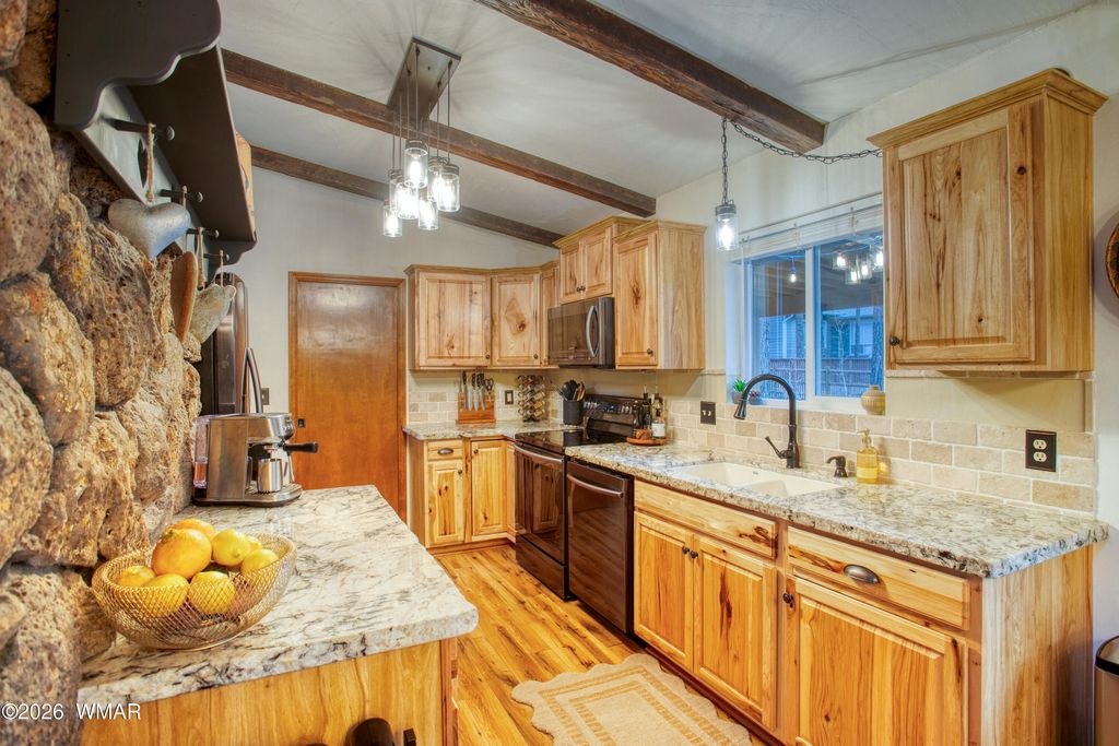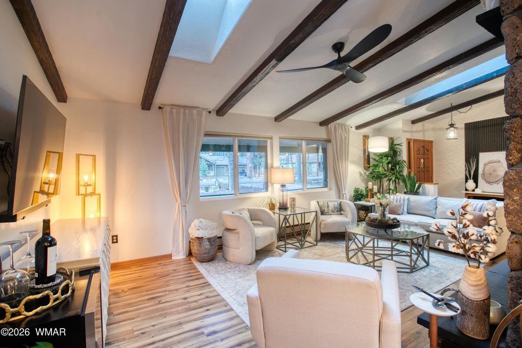 Tucked among the pines in Pinetop Country Club, this charming mountain cabin offers the perfect blend of rustic warmth and thoughtful updates, ideal as a full-time residence or a part-time getaway with excellent Airbnb potential. The inviting great room features vaulted ceilings with exposed beams and a cozy wood-burning fireplace with Heatilator. Additional features include a metal roof, updated kitchen with hickory cabinets, granite countertops, renovated bathrooms, and durable wood plank flooring throughout. With three bedrooms and two full bathrooms, the home provides comfortable living and abundant storage, including a one-car garage with cabinets, storage closet and an additional storage shed. Enjoy outdoor living on the newly constructed expansive covered paver patio with custom lighting, overlooking a beautifully designed yard complete with extended pavers, artificial turf, and charming split-rail fencing.