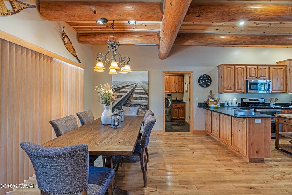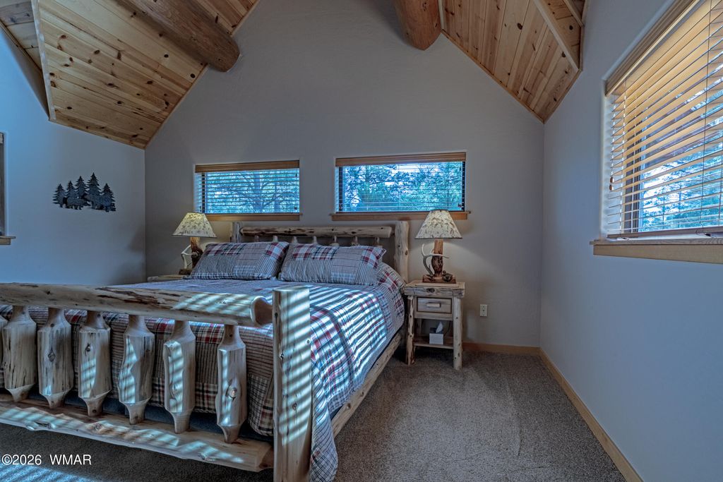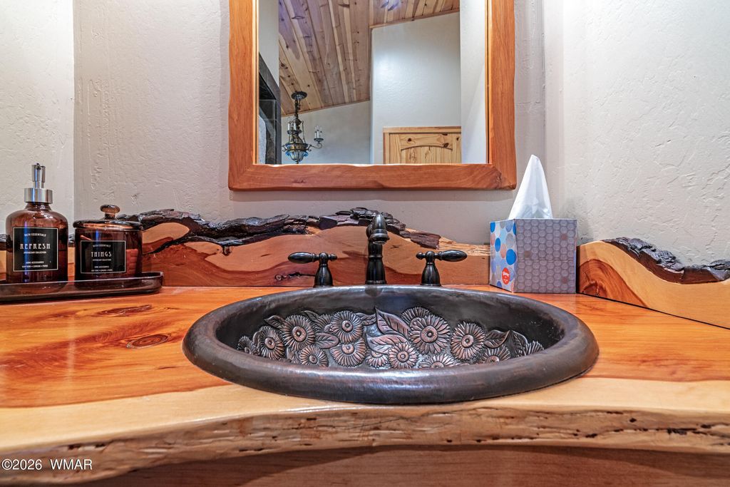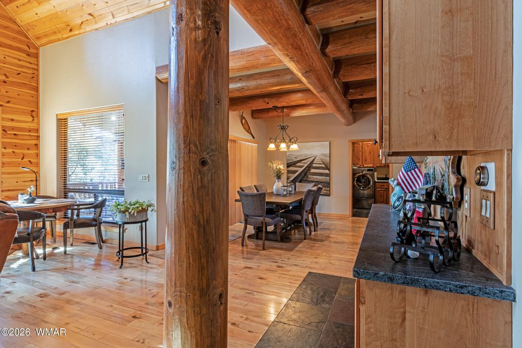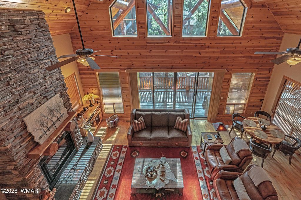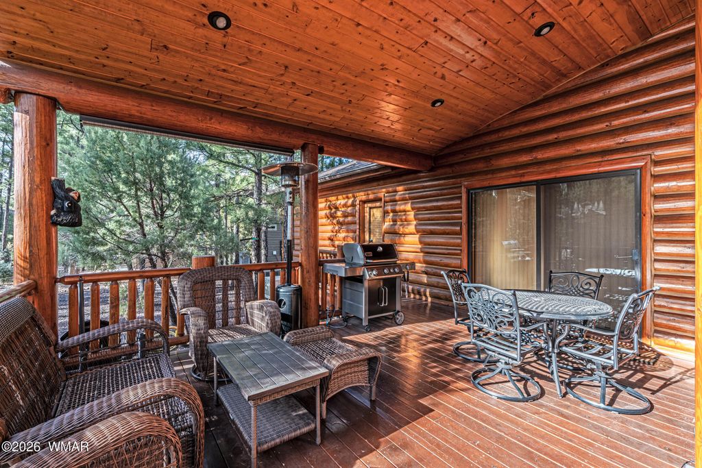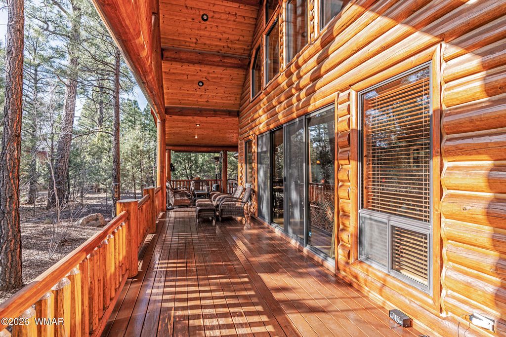 Oversized logs and beautifully designed landscaping create the perfect mountain retreat feel in this stunning home. Step through the custom wood and screened entry door and be welcomed by expansive windows that bring the outdoors in. The Great Room offers generous space for both comfortable living and a study area, while rich hickory floors beautifully complement the slate tile accents. The dining area and kitchen are ideal for entertaining, featuring a breakfast bar with ample seating and direct access through a sliding door to an inviting outdoor living space. Enjoy gatherings on the oversized front and back decks, perfect for relaxing or hosting guests. Upstairs features a split-bedroom layout with a full bath, with heated floors, showcasing a custom sink, tile, and cabinetry. The primary suite is conveniently located on the main level, complete with a sliding door to a private sitting area, a walk-in closet, and a well-appointed bath with the features you expect in a true primary retreat. The extended garage provides flexible space for a workshop or parking an ATV or golf cart and features a durable epoxy floor. The home is equipped with a backup generator, recirculating hot water and timer on water heater. Located in the desirable community of Torreon, residents enjoy a premier environment for golfers and families alike. Amenities include a year-round children's recreation center, fitness center, pool, and access to golf. This home truly reflects pride of ownership and offers the best of mountain living.