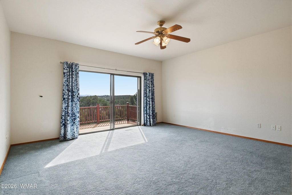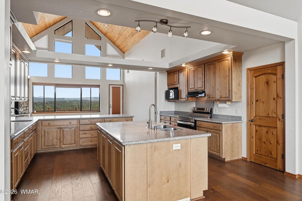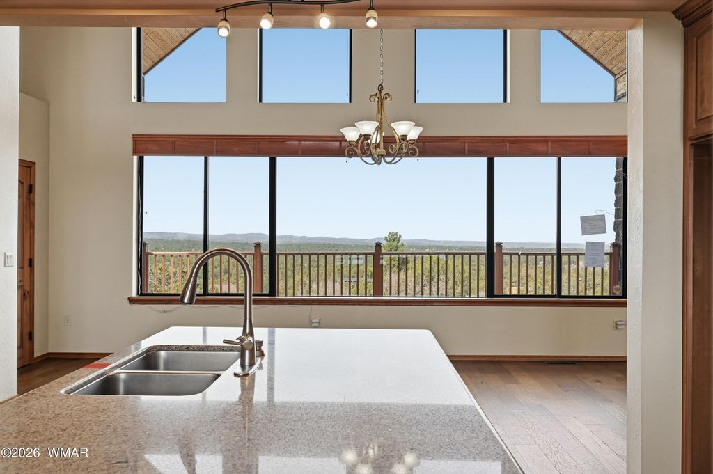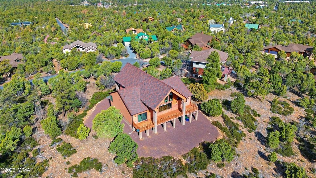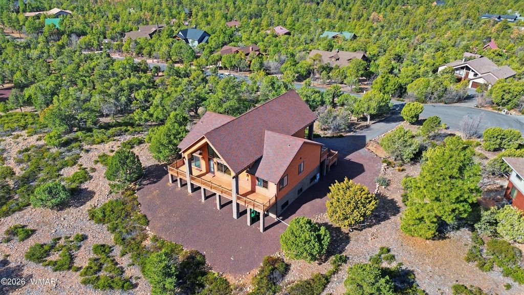 Nestled among the tall pines in the established Sierra Pines area of Show Low, 1561 S Canyon Ridge Trail offers mountain views, flexible living space, and over an acre of land in one of the community's well-known custom home neighborhoods. Set on approximately 1.03 acres, the property provides a spacious setting while remaining within convenient distance of local shopping, dining, medical services, and the many recreational opportunities found throughout the White Mountains. The main residence features over 2,500 square feet with 3 bedrooms and 2 bathrooms, designed to capture surrounding views and natural light. Expansive decking creates additional outdoor living space and provides a place to take in the forested setting and mountain landscape. The lower level adds significant versa versatility, offering approximately 1,632 square feet of garage and workshop space along with an additional 877 square feet of finished living area. This level includes a full kitchen, two bedrooms, a bathroom, and living area, creating options for guest quarters, extended living arrangements, or other flexible uses. An elevator connects the upper and lower levels, providing convenient access throughout the home. The Sierra Pines area is known for its larger parcels and custom homes, contributing to a more open residential environment within the Show Low area. With its combination of acreage, mountain views, multiple living spaces, and workshop/garage capacity, this property presents a unique opportunity for buyers seeking space and flexibility in the White Mountains.