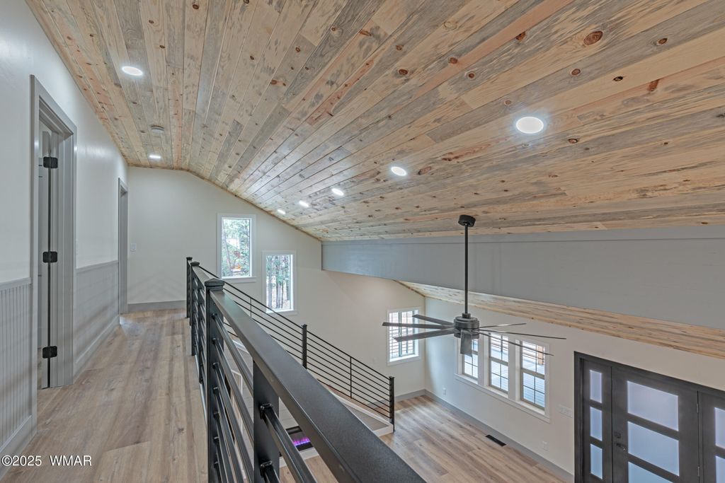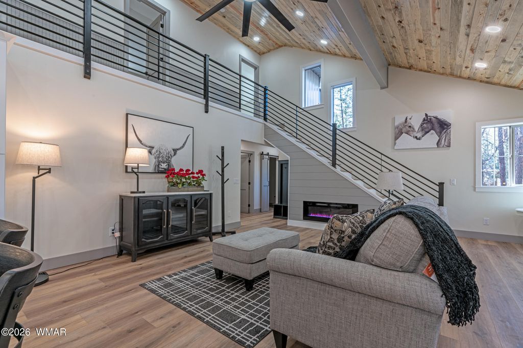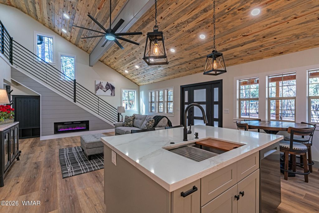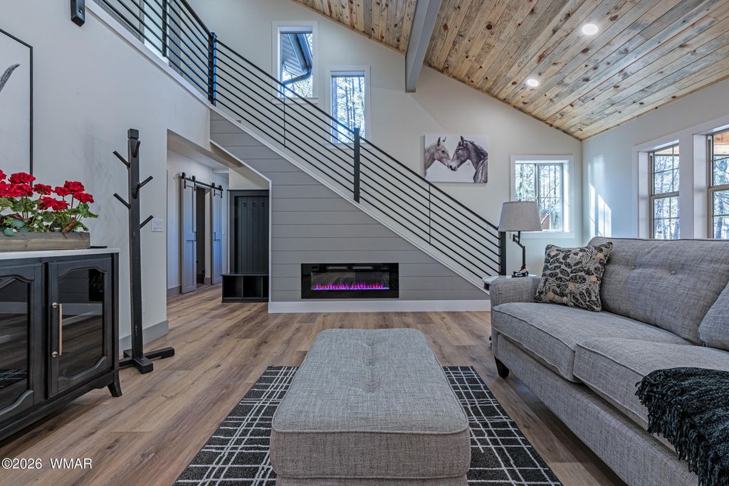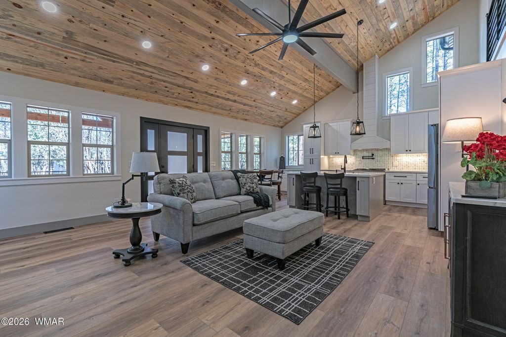 Enjoy essentially a brand-new home on a 1/2 ACRE lot tucked away in the pines near Woodland Lake. Fully renovated from the studs in. No HOA, no CCRs. NEW Firewise metal roof, siding, soffits and gutters. HUGE TREX deck with tongue & groove blue pine ceiling, custom powder coated steel railings & a 8 ft ceiling fan. No Expense spared w/NEW spray foam insulation, HVAC/furnace, solid core shaker doors, tankless water heater, ship lap accents, luxury vinyl plank floors & a redesigned layout with 4 bedrooms. The kitchen boasts quartz counters, 4x6 island, high-end appliances, pot filler, coffee bar, & two cabinet pantries. Spa-like bathrooms with tile surrounds, rain shower, & designer finishes. Milgard windows, fresh rock driveway, new septic & much more. Owner is a licensed AZ realtor.