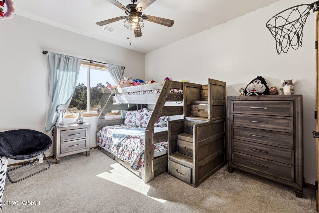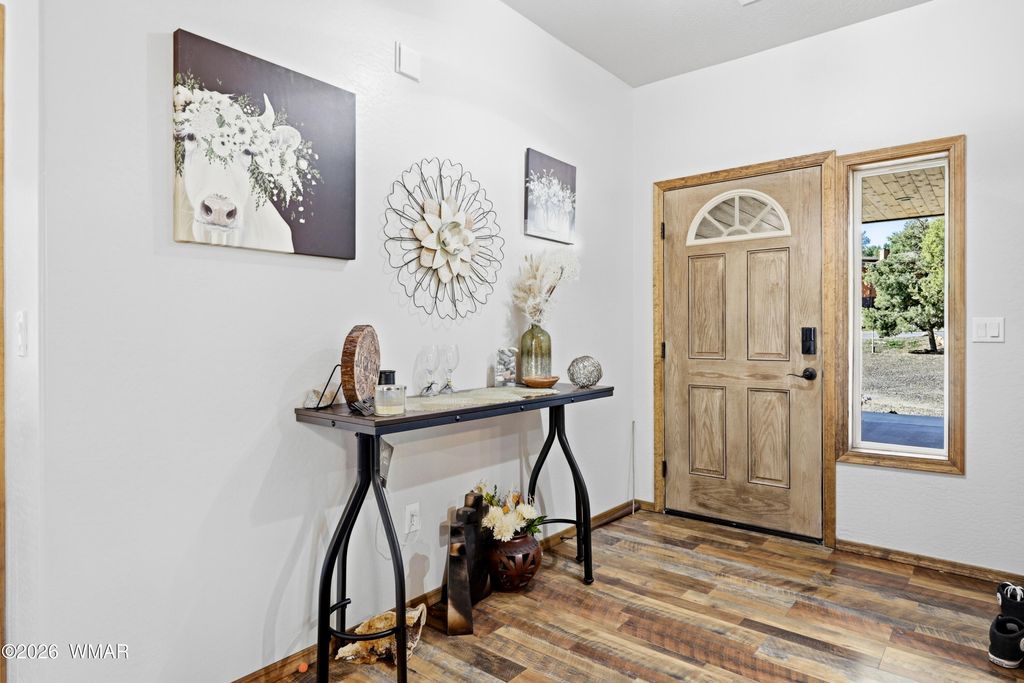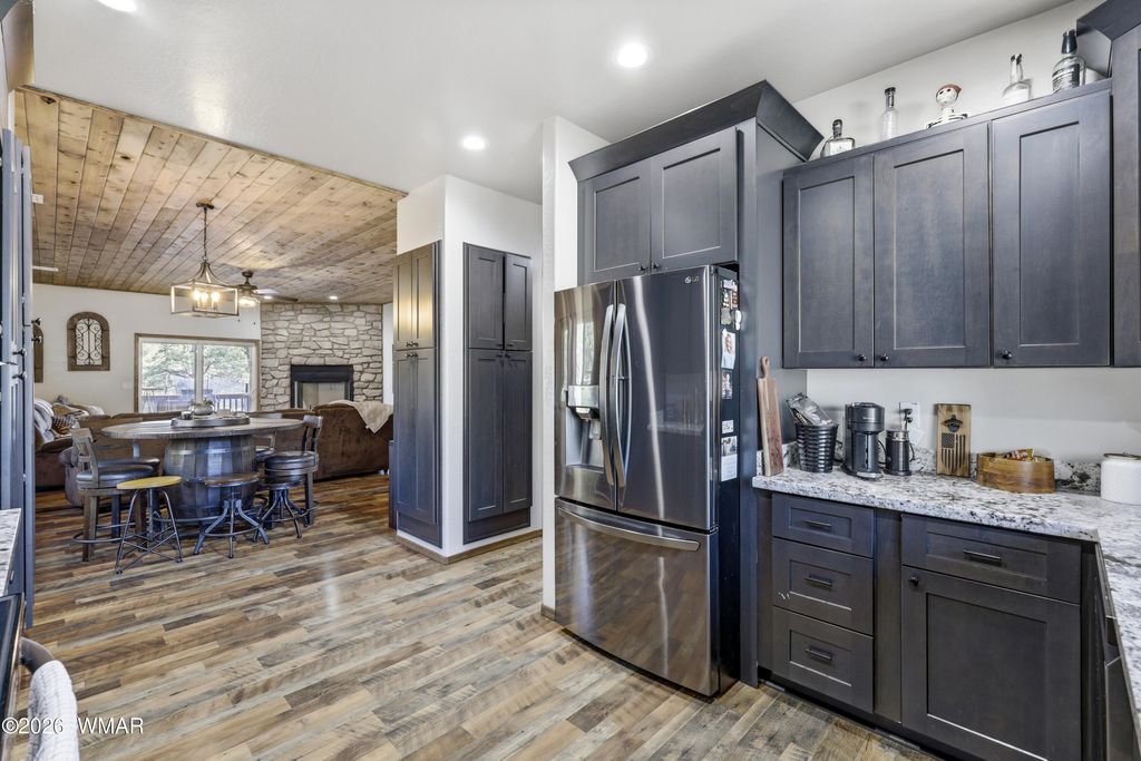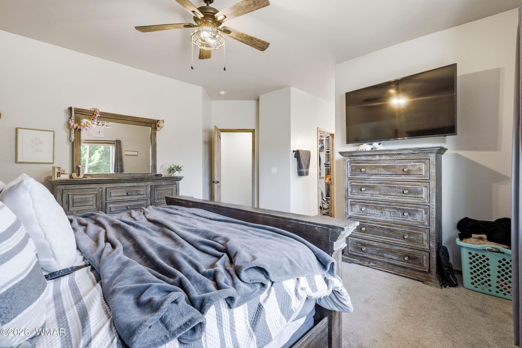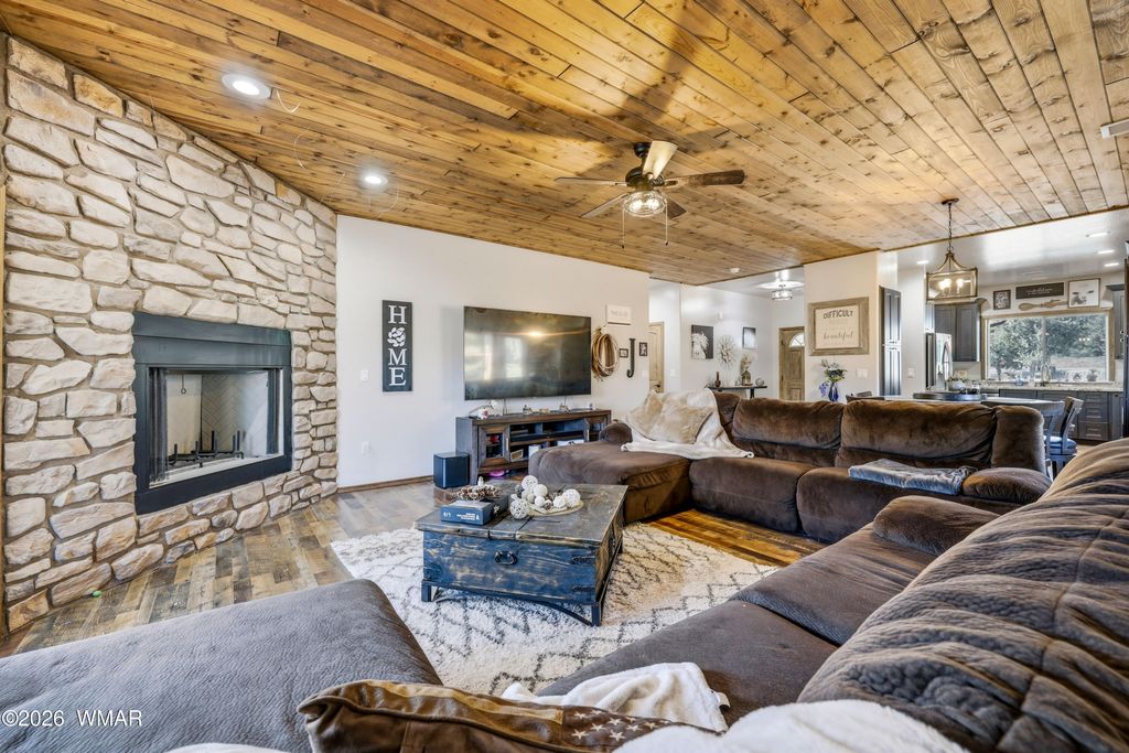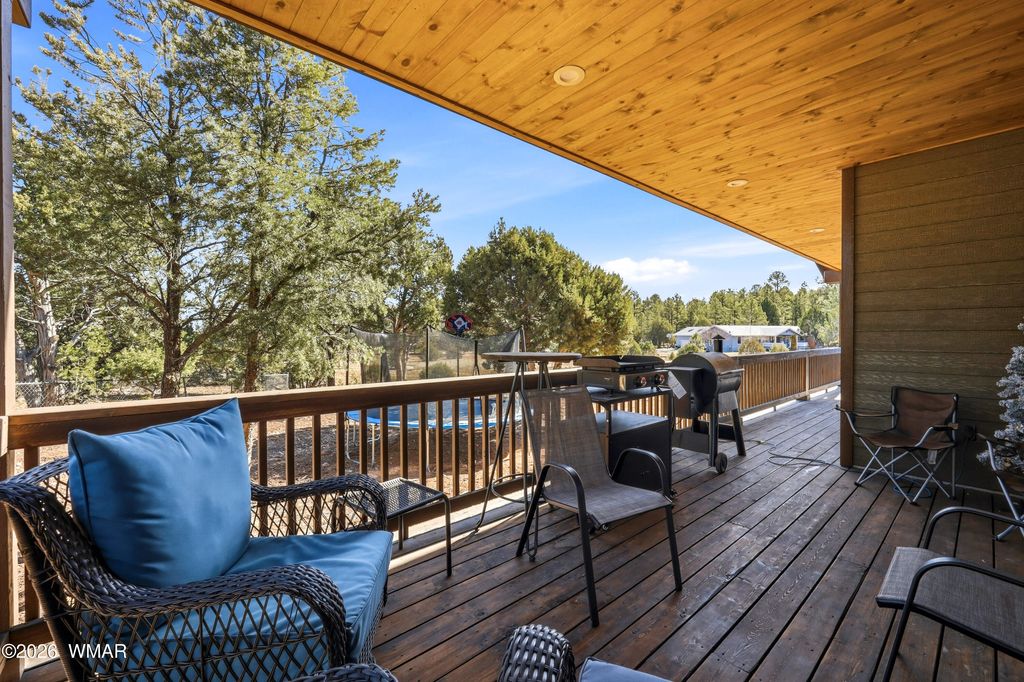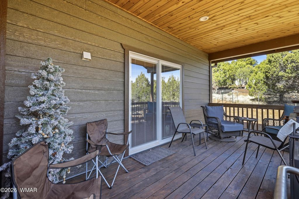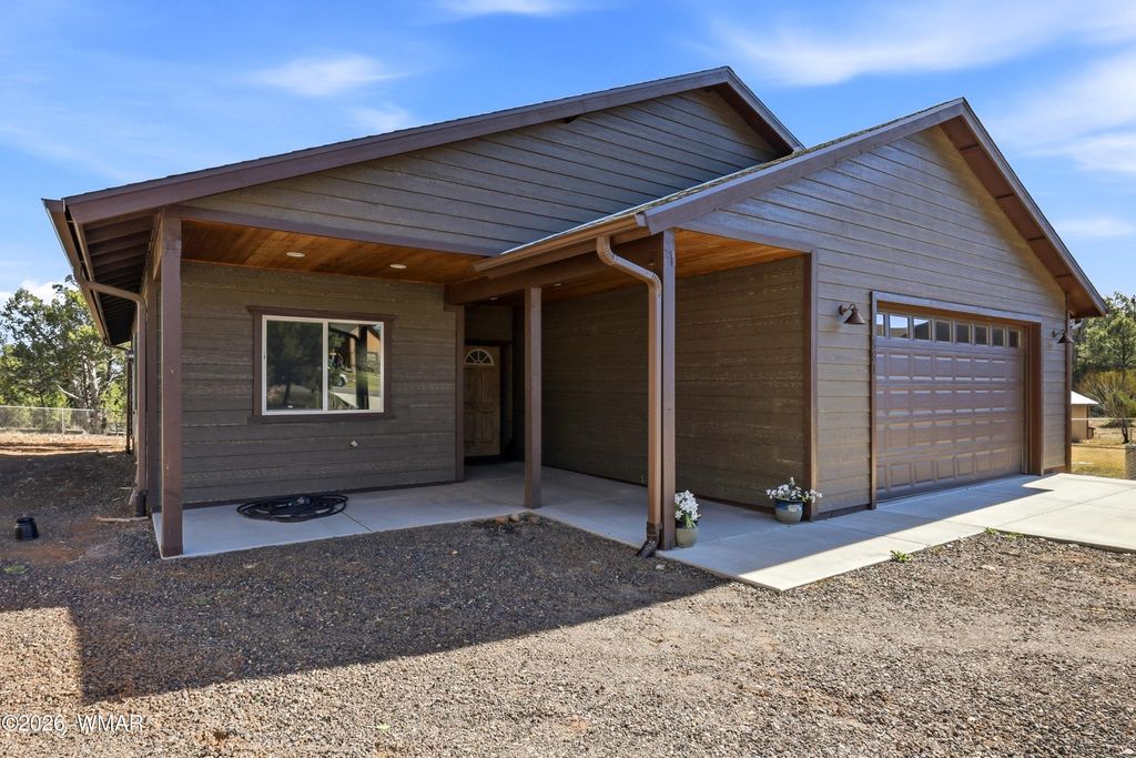 Vista views of elk in the meadow can be admired from the spacious covered rear deck of this mountain cabin located in the heart of Show Low. Remote atmosphere, yet moments away from shopping, dining and recreation. This newer (2022) built cabin style home sports a flow through interior offering elegance from the kitchen to dining area and into the living room, complete with fireplace and access to back deck. The primary bedroom, which includes views of the rear deck and meadow, offers a large private bathroom, double vanity, and large walk-in shower. The additional 2 bedrooms and full guest bathroom complete the interior. Access to the double car garage is through the laundry room for convenience and storage. The home sitting at the back of a cul-de-sac provides privacy from traffic.