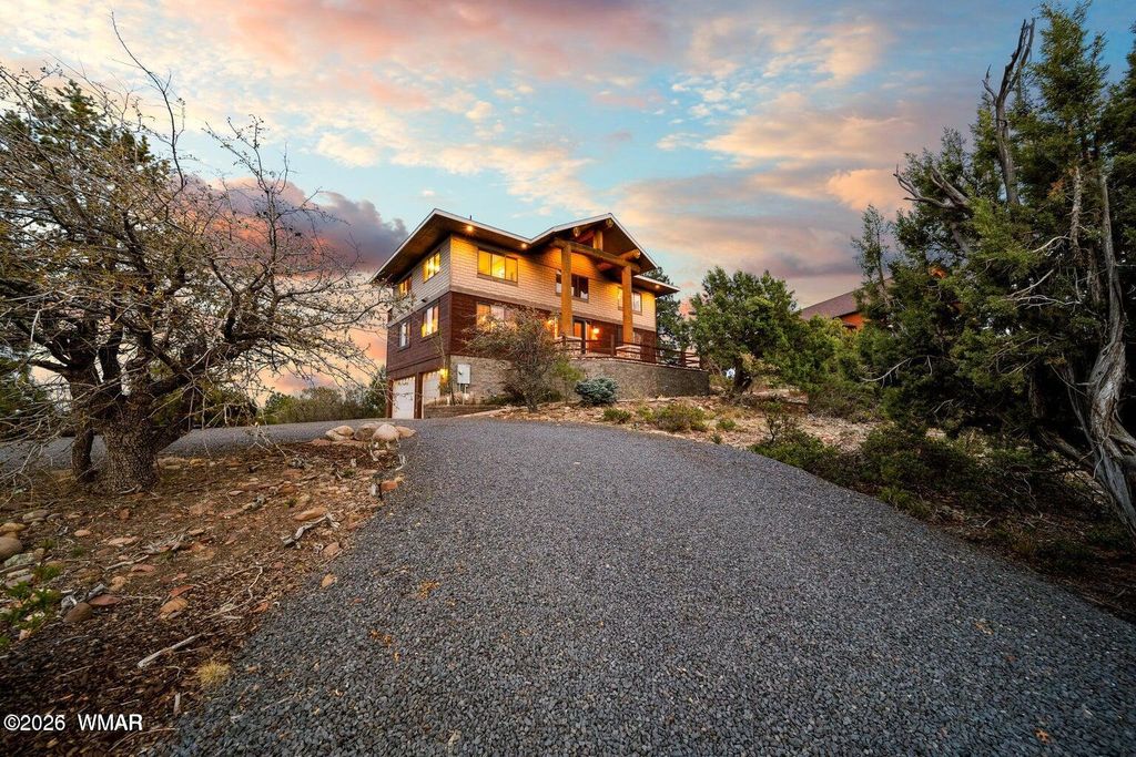 VIEWS, VIEWS & MORE VIEWS - The High Point of Show Low Perched at the top of Show Low, this architect-designed custom home captures some of the most breathtaking panoramic views in the White Mountains. On crisp winter days, you can see all the way to the San Francisco Peaks in Flagstaff. To the north, enjoy sweeping views of the forest, the town of Show Low, and even the wind turbines beyond Snowflake. From the expansive back deck, take in stunning vistas of Porter Mountain, Mount Baldy, Blue Peak, and surrounding White Mountain ranges. Designed with three levels to maximize the scenery, this thoughtfully crafted home blends comfort, craftsmanship, and functionality. MAIN LEVEL The main floor features an open-concept kitchen with custom maple cabinetry, a 10-foot granite island, perfect for entertaining or everyday cooking. A new LG combination oven/microwave includes a dividable oven that allows for three separate baking temperatures at once. Two cabinet-depth French-door refrigerators sit side-by-side, offering exceptional storage space. The kitchen and dining area flow into a dramatic great room with soaring 20-foot ceilings, walls of glass, and a stunning elk antler chandelier. A stone fireplace with gas logs and thermostat control is crowned by a massive juniper log mantel and framed by custom built-in maple bookshelves. Also on this level is a spacious study/den featuring a second stone fireplace with a juniper mantel, creating a warm and inviting retreat. The two-story entry foyer welcomes guests with a beautiful whitetail antler chandelier, celebrating the deer and elk that frequent the 1.11-acre property. A stylish powder room completes the main level with a custom Michael Hays vessel sink, granite countertop, Antelope Ranch lighting fixture, and David Marsh mirror. UPPER LEVEL Upstairs are three bedrooms with spectacular views, plus a full guest bath featuring a Jacuzzi soaking tub. The primary suite is positioned for privacy and comfort and includes a Vermont Castings wood stove with gas logs and thermostat, perfect for cozy mountain evenings. The ensuite bath offers a two-person Jacuzzi whirlpool tub with built-in heater, glass-enclosed shower, dual vanities, a private toilet room, and a spacious walk-in closet. The entire upper floor and staircase feature new carpet with premium padding, while both bathrooms showcase new wood flooring with waterproof polymer backing. A conveniently located laundry closet with Maytag stacked washer and dryer sits just outside the primary suite. LOWER LEVEL The walk-out lower level includes a three-car garage with extensive shelving, along with a large living or recreation room and a fourth bedroom with its own half bath and oversized walk-in closet with built-in cabinetry. An additional flex room offers excellent potential as a workshop, hobby space, or kitchenette for a future mother-in-law suite. It already includes cabinetry, a stainless-steel sink, and multiple power outlets, with plumbing roughed-in to expand the bedroom bath with a shower if desired. The home has two full baths and 2 half baths ( half baths could be converted to full. Additional Features This home is equipped with numerous thoughtful upgrades including: Rinnai on-demand tankless water heater with circulation system, controllable via smartphone Hybrid water softener with whole-house charcoal filtration system Lightning protection system installed by a Lightning Institute of America-certified company Whole-house surge protector Hardwired monitored security system with smoke/heat detection and cellular dial-out Gas hookup on the back deck for a barbecue Unforgettable Setting On the Fourth of July, this home becomes one of the best vantage points in town for the Show Low fireworks show. Skip the crowds and enjoy the celebration from your own elevated deck with family and friends while taking in the incredible panoramic scenery. A truly one-of-a-kind mountain property combining stunning views