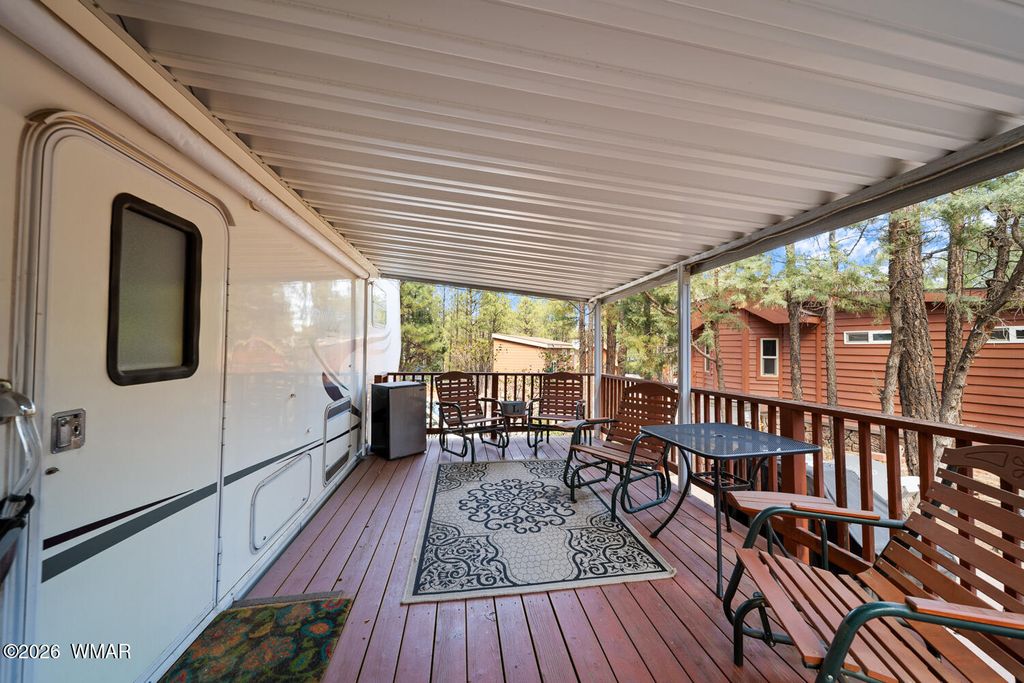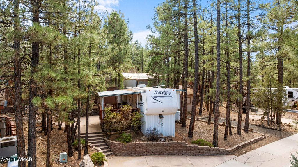 Welcome to White Mountain Vacation Village Discover the charm of mountain living in the highly desirable White Mountain Vacation Village, one of the most sought-after RV and park model communities in the beautiful White Mountains. This inviting property features a concrete driveway, attractive castlestone wall, and a spacious covered deck--perfect for relaxing and enjoying the cool mountain air. The property includes a Travel Ease RV that will convey with the sale, and the home is well-maintained and in good condition for its age. Property also include a storage shed and additional driveway. Mature trees and paved streets throughout the neighborhood create a peaceful and welcoming setting. Residents of White Mountain Vacation Village enjoy excellent community amenities, including a beautiful clubhouse with a billiards room, a clean and convenient laundry facility, and a large pavilion gathering area ideal for social events. The community also features bocce ball courts, scenic pathways, and walking trails that make it easy to enjoy nature right outside your door. The HOA covers most utilities and services, leaving you responsible only for electric and internet, making for simple and low-maintenance living. Situated at approximately 6,300 feet in elevation, the area offers cool, comfortable summers and all four beautiful seasons, making it a perfect getaway or full-time residence. Don't miss this opportunity to own a place in one of the nicest RV/park model subdivisions in the White Mountains and start enjoying everything mountain living has to offer.