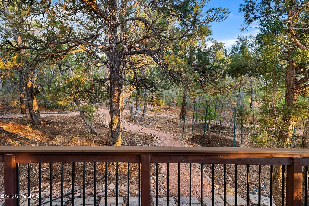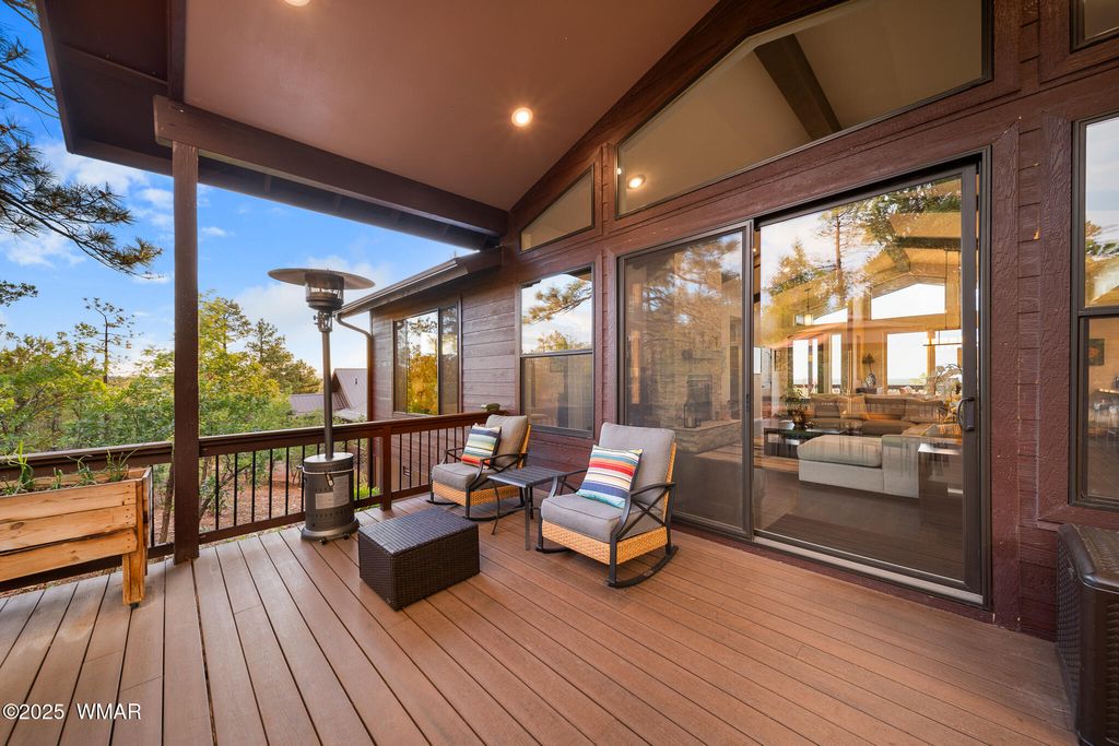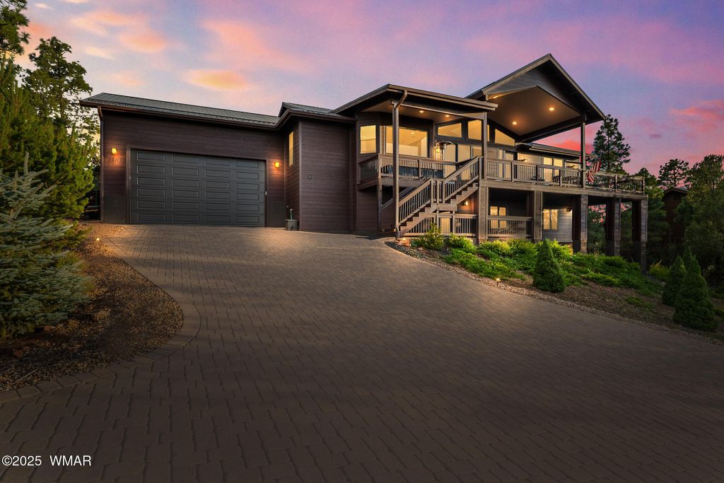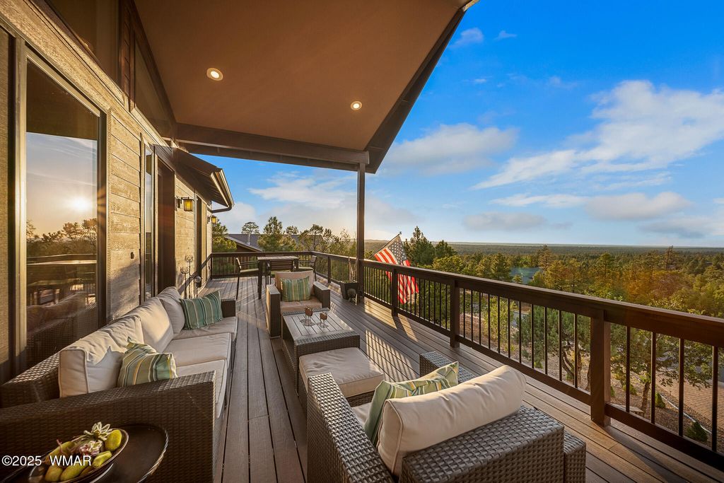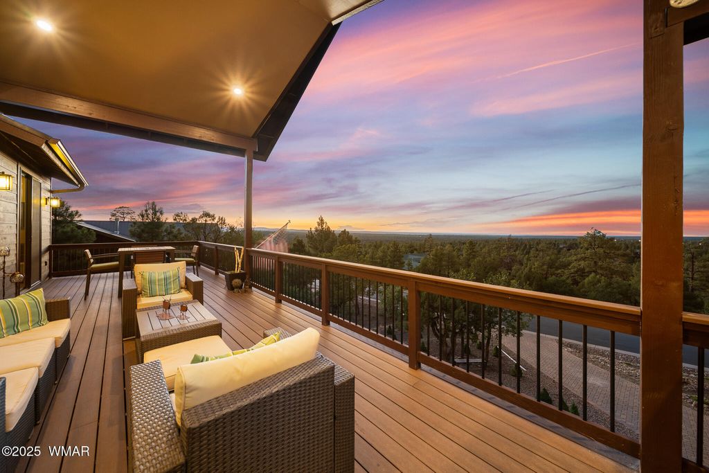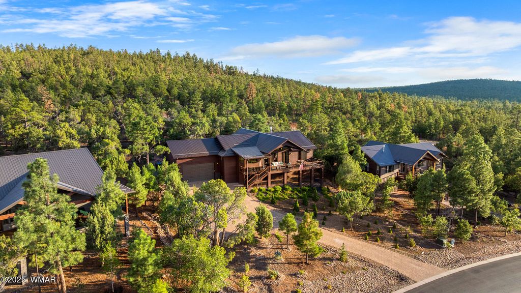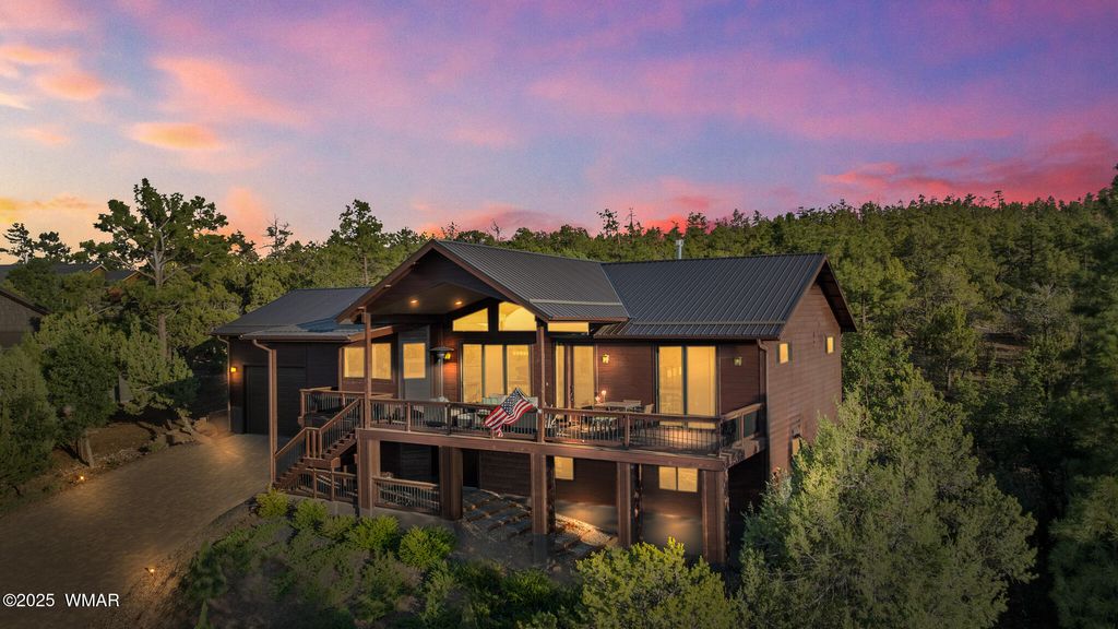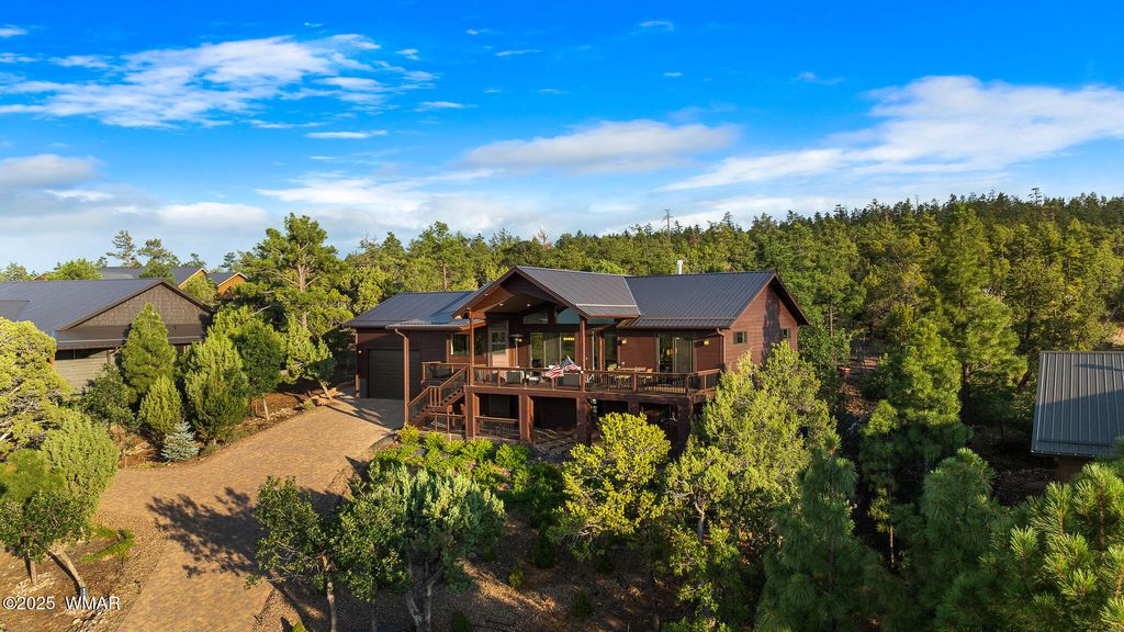 Unrivaled Views & Elegant Living in Snow Creek's Most Coveted Home.... Welcome to one of the most spectacular homes in the highly sought-after Snow Creek, a prestigious gated community nestled above Show low's finest amenities--just minutes from shopping, scenic trails, top-rated restaurants, a library, and the aquatic center. This exceptional residence offers unobstructed panoramic views stretching over 30 miles on a clear day, encompassing treetops, and dramatic sunrises and sunsets. Perched high above street level, the property provides a rare combination of expansive vistas and ultimate privacy. The main home is masterfully designed with oversized windows throughout, including grand trapezoid glass accents and an abundance of natural light A spacious custom 689 sq. ft. front deck was intentionally built with an open-air section to maximize stargazing and sky views. Sliding glass doors in both the dining area and the front bedroom offer direct access to this elevated retreat. The 600 sq. ft. rear deck which 400 sq ft is uncovered and is perfect for quiet moments or entertaining guests with stunning scenery all around. A fully integrated guest quarters approximately 950 sq. ft. is located below the main home and features two generous bedrooms, a full bathroom, a spacious living area, additional storage, and its own private paver patio with sweeping long-range views. The guest suite is seamlessly connected to the home's upgraded central heating and cooling systems, ensuring comfort year-round. Inside the main home, the oversized kitchen boasts premium KitchenAid appliances, including an electric induction stove, convection microwave/oven, dishwasher, refrigerator, and a dedicated wine fridge. For culinary purists, a gas stub is also available. Quartz countertops, a 7-stage reverse osmosis water filtration system, and a tankless water heater with softener elevate the home's efficiency and luxury. The primary bathroom is a designer's dream with dual sinks, a custom tiled shower with two shower heads, and rich finishes. A separate Jack and Jill bathroom includes a bathtub with a glass enclosure and designer tile surround. Closets are custom-built, and the utility room is outfitted with a sink and smart design. Additional features include: " Oversized garage (276 sq. ft. larger than standard) with a 9-ft door, a sink, three white storage cabinets, and dual-tier steel shelving. BRAND NEW KITCHEN AID DISHWASHER. " Expansive paver driveway with ample guest parking. " 13 fenced fruit trees, raised garden beds, and private walking trails with benches on your own property. " Gas lines on both decks for easy BBQ installation. " Enclosed garbage receptacle, designer landscaping, and mature trees for low-maintenance beauty. " Custom walkways, enhanced water pressure system, and a quiet sense of retreat throughout. From peaceful mornings to golden sunsets, this home offers an experience like no other. Whether you're entertaining guests, relaxing in nature, or simply enjoying the ever-changing skyline, this residence brings together the very best of luxury, privacy, and breathtaking natural beauty.