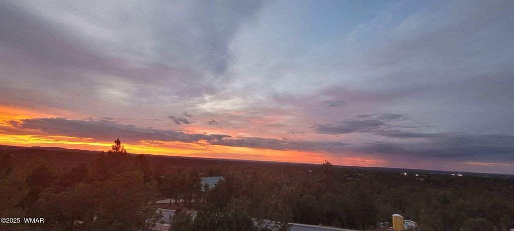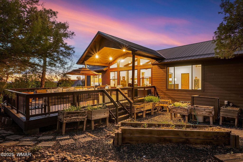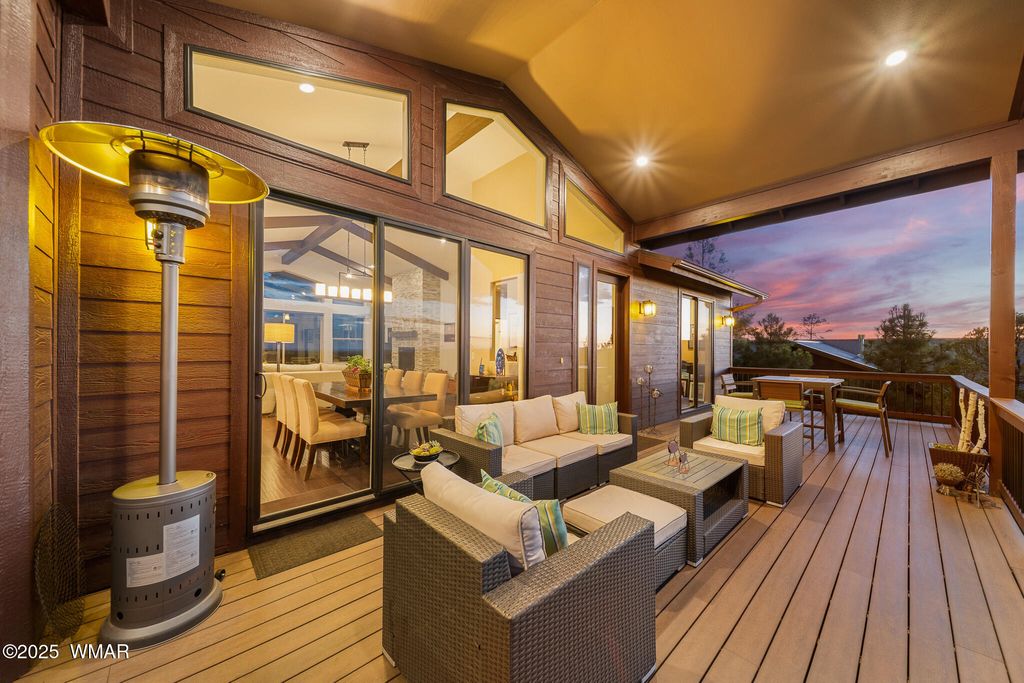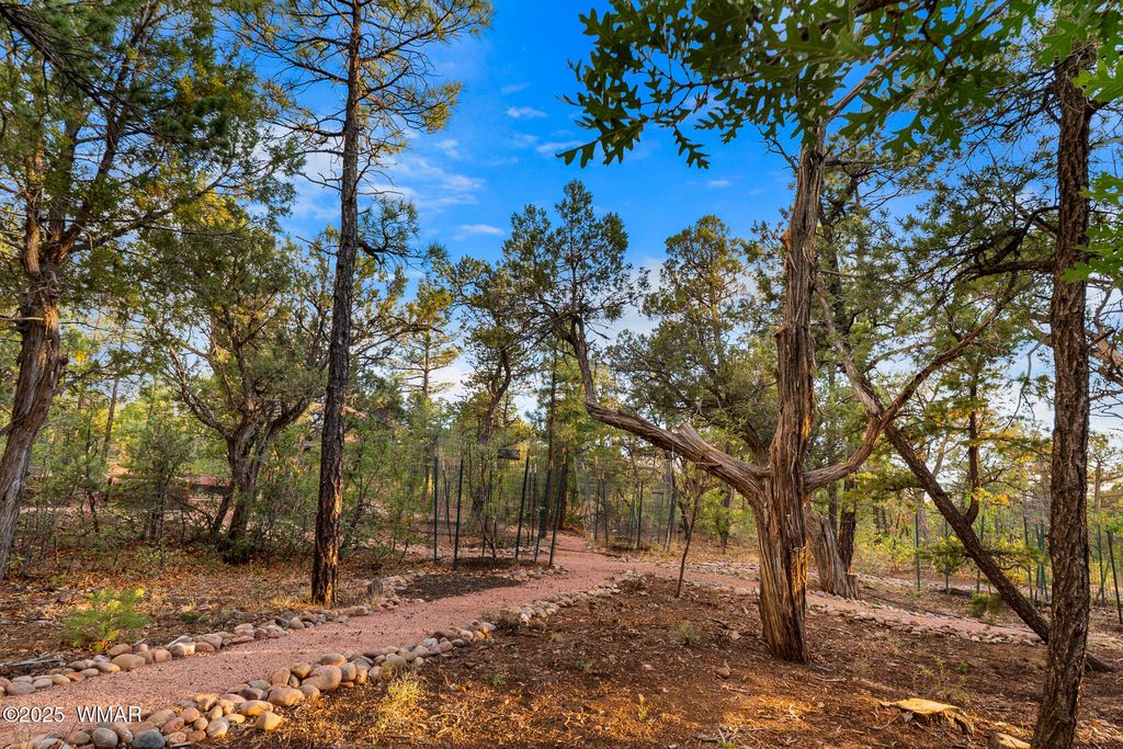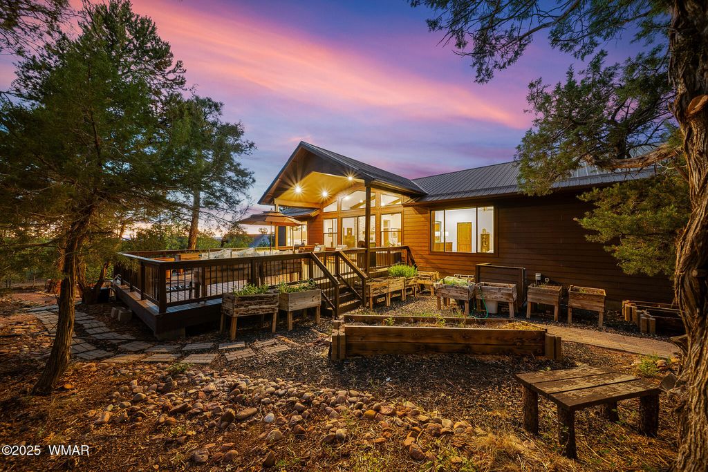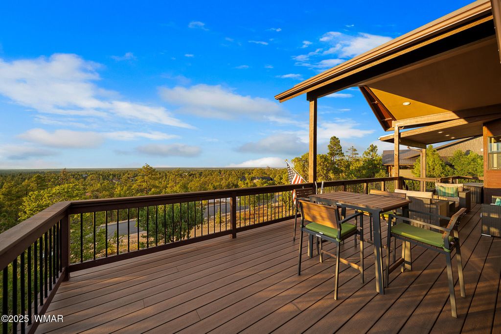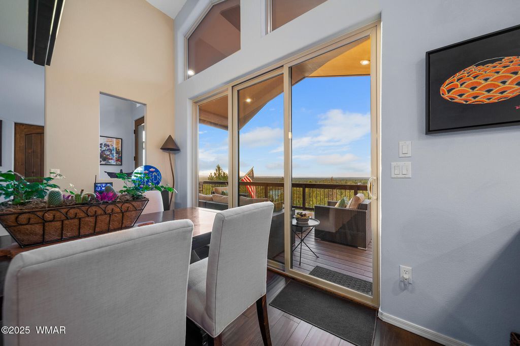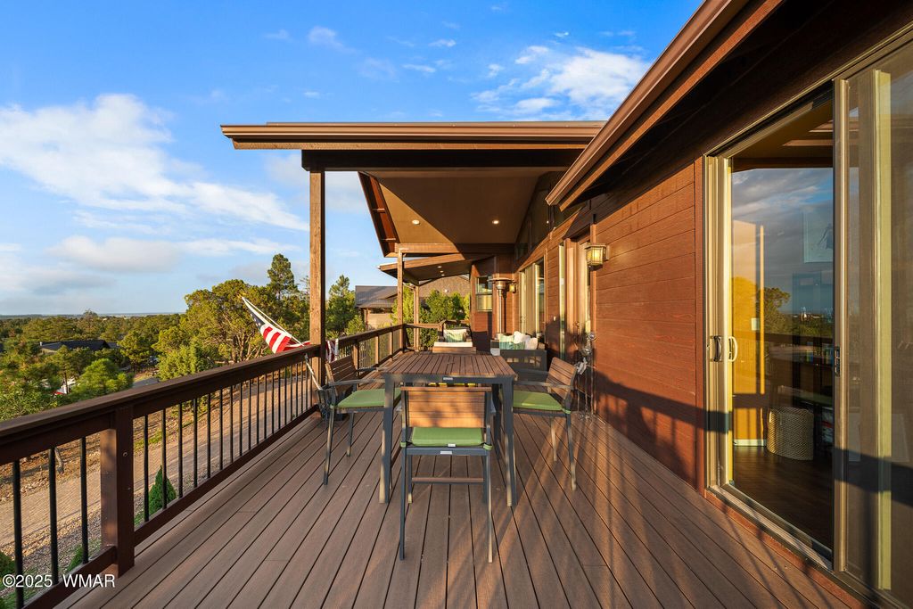 Unrivaled Views & Elegant Living in Snow Creek's Most Coveted Home.... Welcome to one of the most spectacular homes in the highly sought-after Snow Creek, a prestigious gated community nestled above Show low's finest amenities--just minutes from shopping, scenic trails, top-rated restaurants, a library, and the aquatic center. This exceptional residence offers unobstructed panoramic views stretching over 30 miles on a clear day, encompassing treetops, and dramatic sunrises and sunsets. Perched high above street level, the property provides a rare combination of expansive vistas and ultimate privacy. The main home is masterfully designed with oversized windows throughout, including grand trapezoid glass accents and an abundance of natural light A spacious custom 689 sq. ft. front deck was intentionally built with an open-air section to maximize stargazing and sky views. Sliding glass doors in both the dining area and the front bedroom offer direct access to this elevated retreat. The 600 sq. ft. rear deck which 400 sq ft is uncovered and is perfect for quiet moments or entertaining guests with stunning scenery all around. A fully integrated guest quarters approximately 950 sq. ft. is located below the main home and features two generous bedrooms, a full bathroom, a spacious living area, additional storage, and its own private paver patio with sweeping long-range views. The guest suite is seamlessly connected to the home's upgraded central heating and cooling systems, ensuring comfort year-round. Inside the main home, the oversized kitchen boasts premium KitchenAid appliances, including an electric induction stove, convection microwave/oven, dishwasher, refrigerator, and a dedicated wine fridge. For culinary purists, a gas stub is also available. Quartz countertops, a 7-stage reverse osmosis water filtration system, and a tankless water heater with softener elevate the home's efficiency and luxury. The primary bathroom is a designer's dream with dual sinks, a custom tiled shower with two shower heads, and rich finishes. A separate Jack and Jill bathroom includes a bathtub with a glass enclosure and designer tile surround. Closets are custom-built, and the utility room is outfitted with a sink and smart design. Additional features include: " Oversized garage (276 sq. ft. larger than standard) with a 9-ft door, a sink, three white storage cabinets, and dual-tier steel shelving. BRAND NEW KITCHEN AID DISHWASHER. " Expansive paver driveway with ample guest parking. " 13 fenced fruit trees, raised garden beds, and private walking trails with benches on your own property. " Gas lines on both decks for easy BBQ installation. " Enclosed garbage receptacle, designer landscaping, and mature trees for low-maintenance beauty. " Custom walkways, enhanced water pressure system, and a quiet sense of retreat throughout. From peaceful mornings to golden sunsets, this home offers an experience like no other. Whether you're entertaining guests, relaxing in nature, or simply enjoying the ever-changing skyline, this residence brings together the very best of luxury, privacy, and breathtaking natural beauty.