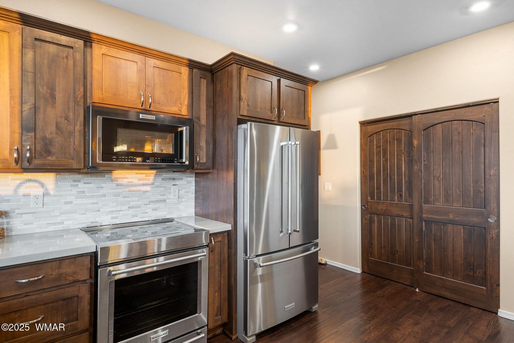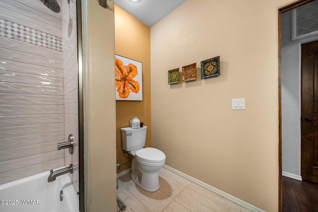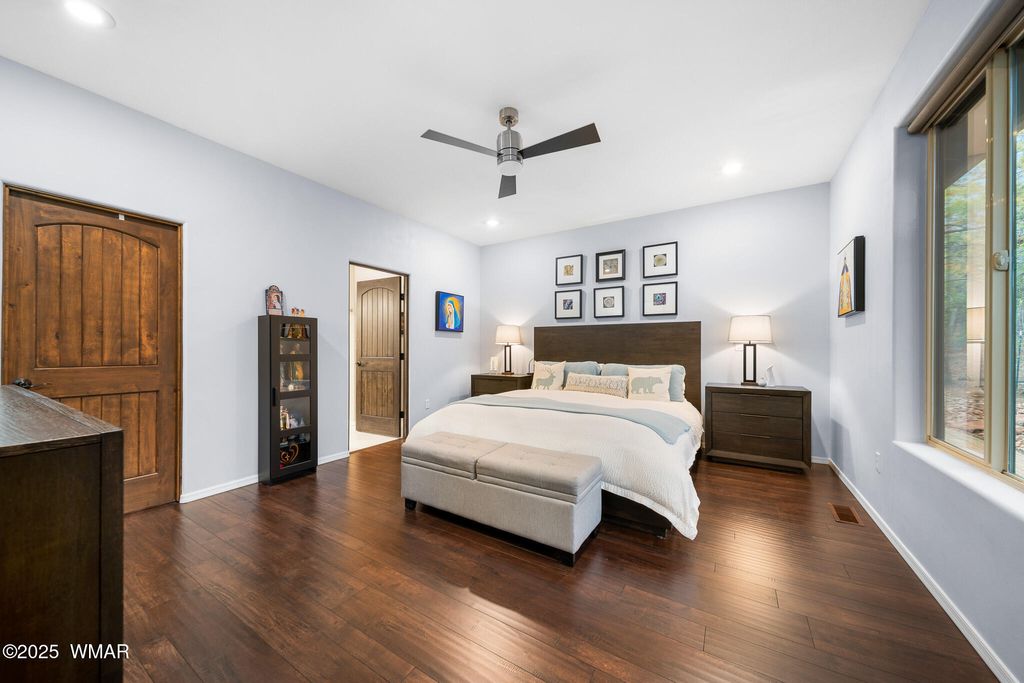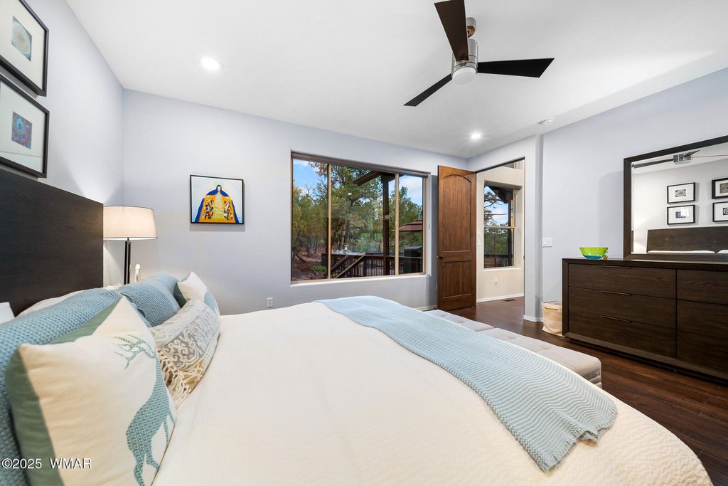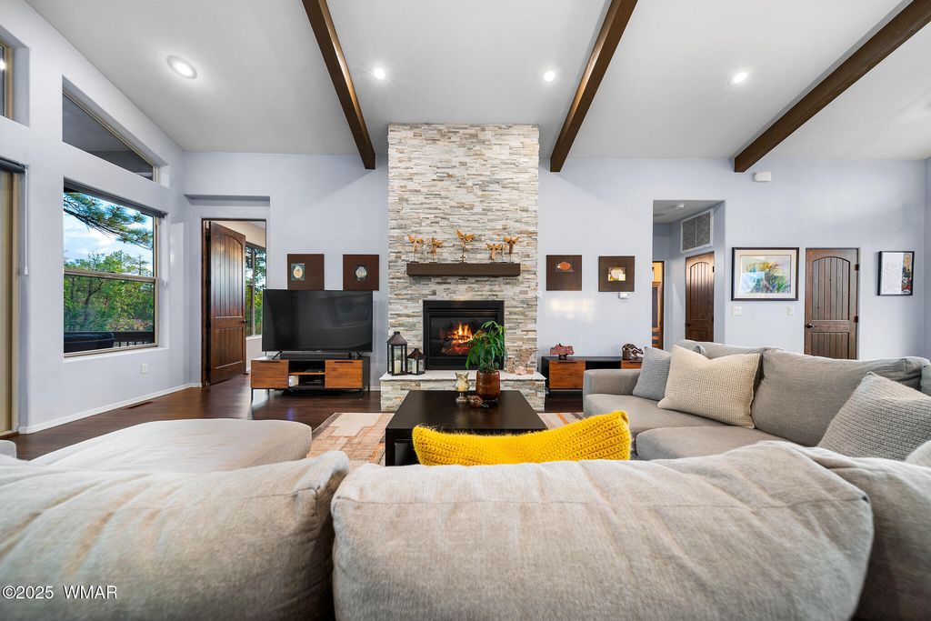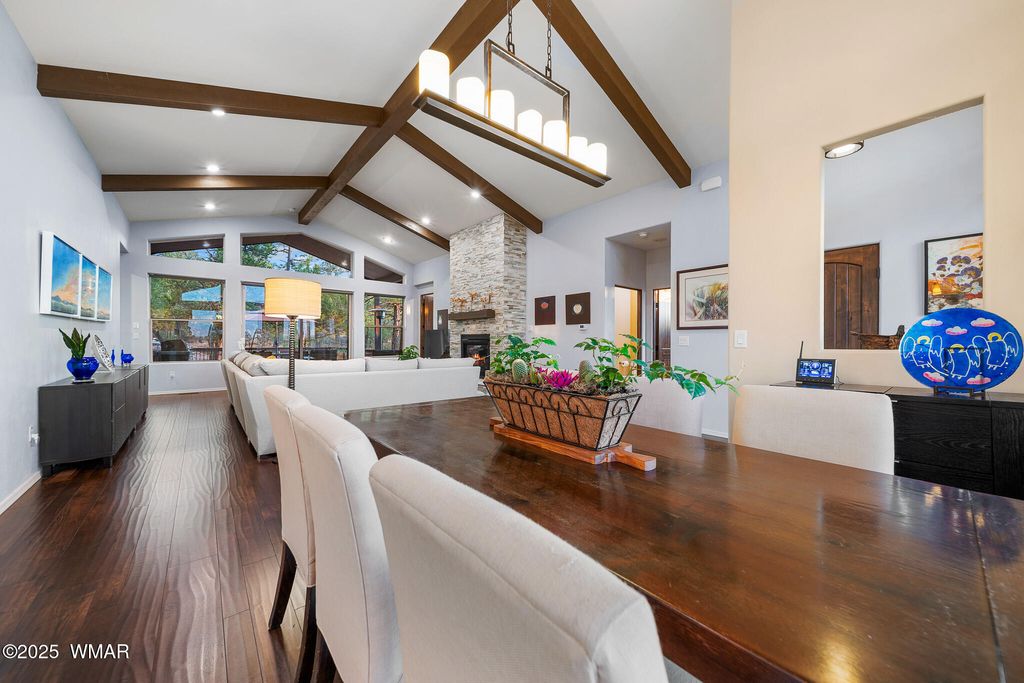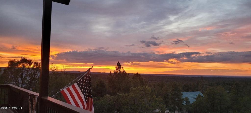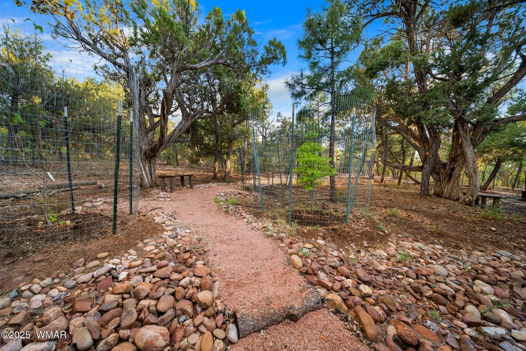 Unrivaled Views & Elegant Living in Snow Creek's Most Coveted Home.... Welcome to one of the most spectacular homes in the highly sought-after Snow Creek, a prestigious gated community nestled above Show low's finest amenities--just minutes from shopping, scenic trails, top-rated restaurants, a library, and the aquatic center. This exceptional residence offers unobstructed panoramic views stretching over 30 miles on a clear day, encompassing treetops, and dramatic sunrises and sunsets. Perched high above street level, the property provides a rare combination of expansive vistas and ultimate privacy. The main home is masterfully designed with oversized windows throughout, including grand trapezoid glass accents and an abundance of natural light A spacious custom 689 sq. ft. front deck was intentionally built with an open-air section to maximize stargazing and sky views. Sliding glass doors in both the dining area and the front bedroom offer direct access to this elevated retreat. The 600 sq. ft. rear deck which 400 sq ft is uncovered and is perfect for quiet moments or entertaining guests with stunning scenery all around. A fully integrated guest quarters approximately 950 sq. ft. is located below the main home and features two generous bedrooms, a full bathroom, a spacious living area, additional storage, and its own private paver patio with sweeping long-range views. The guest suite is seamlessly connected to the home's upgraded central heating and cooling systems, ensuring comfort year-round. Inside the main home, the oversized kitchen boasts premium KitchenAid appliances, including an electric induction stove, convection microwave/oven, dishwasher, refrigerator, and a dedicated wine fridge. For culinary purists, a gas stub is also available. Quartz countertops, a 7-stage reverse osmosis water filtration system, and a tankless water heater with softener elevate the home's efficiency and luxury. The primary bathroom is a designer's dream with dual sinks, a custom tiled shower with two shower heads, and rich finishes. A separate Jack and Jill bathroom includes a bathtub with a glass enclosure and designer tile surround. Closets are custom-built, and the utility room is outfitted with a sink and smart design. Additional features include: " Oversized garage (276 sq. ft. larger than standard) with a 9-ft door, a sink, three white storage cabinets, and dual-tier steel shelving. BRAND NEW KITCHEN AID DISHWASHER. " Expansive paver driveway with ample guest parking. " 13 fenced fruit trees, raised garden beds, and private walking trails with benches on your own property. " Gas lines on both decks for easy BBQ installation. " Enclosed garbage receptacle, designer landscaping, and mature trees for low-maintenance beauty. " Custom walkways, enhanced water pressure system, and a quiet sense of retreat throughout. From peaceful mornings to golden sunsets, this home offers an experience like no other. Whether you're entertaining guests, relaxing in nature, or simply enjoying the ever-changing skyline, this residence brings together the very best of luxury, privacy, and breathtaking natural beauty.