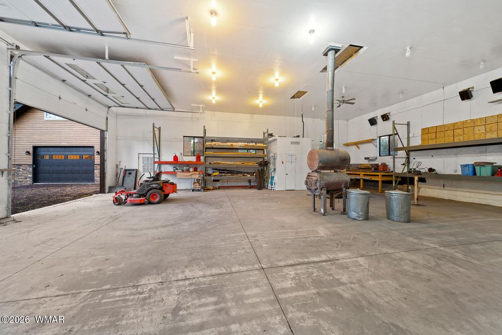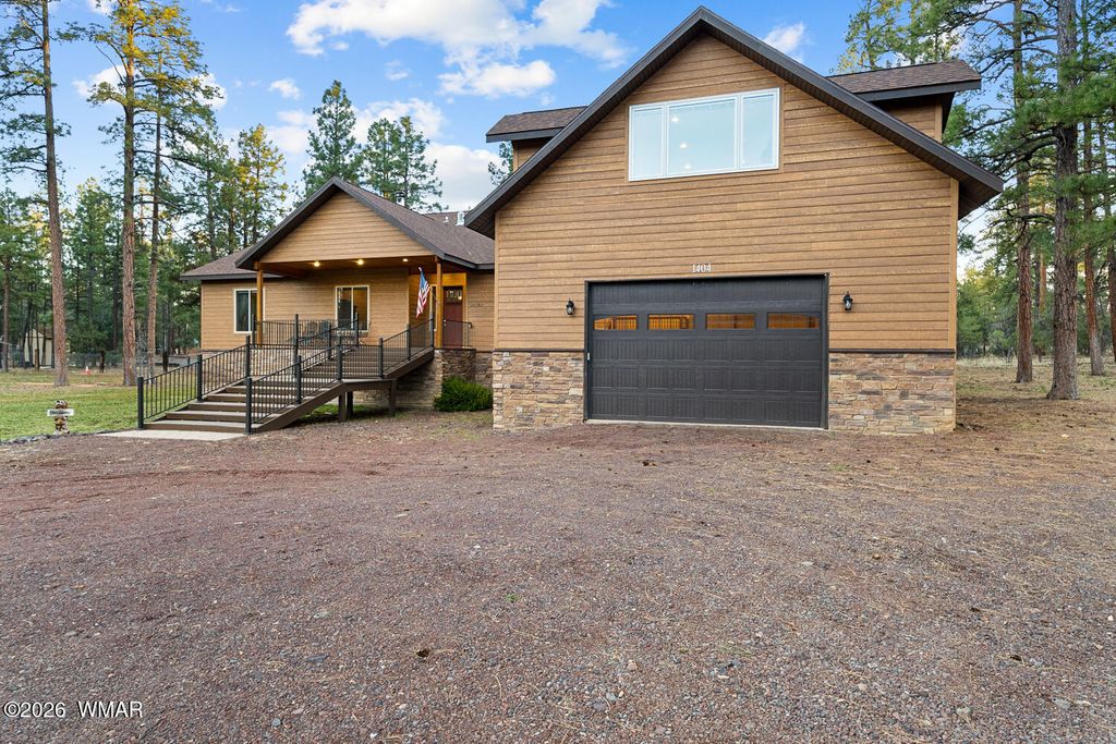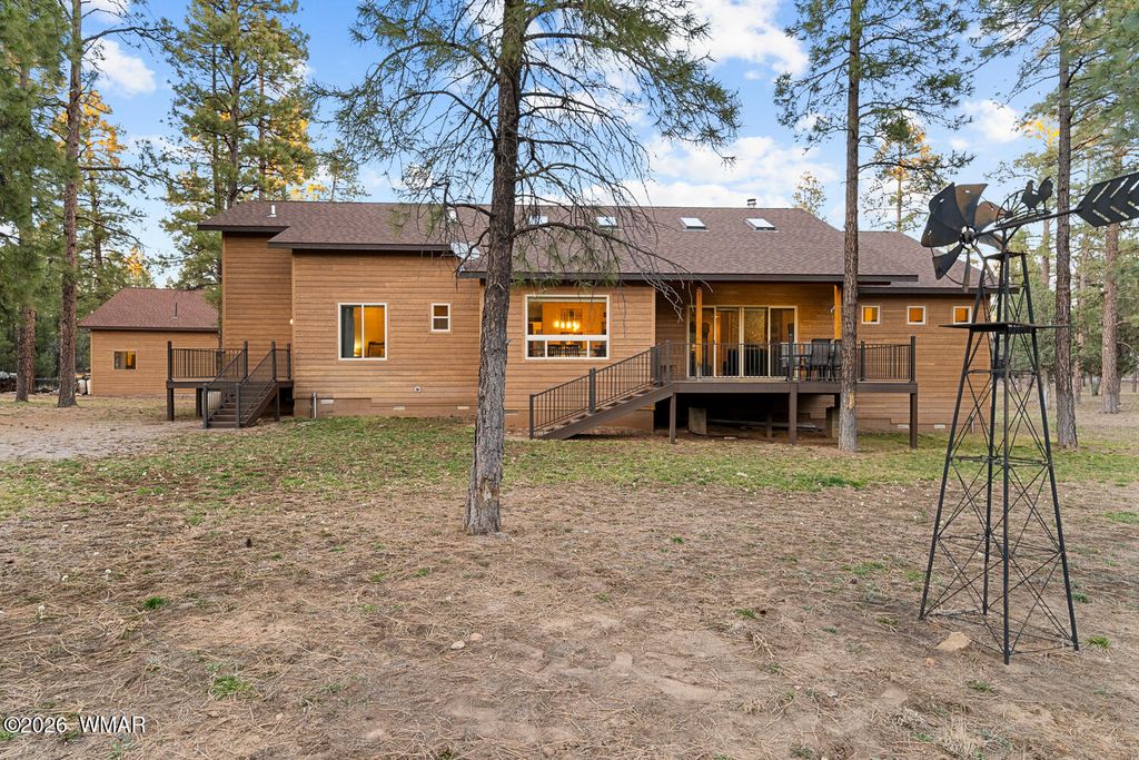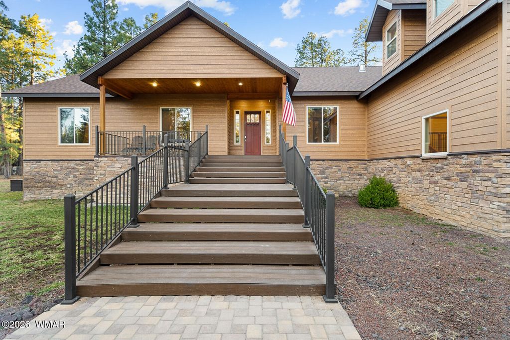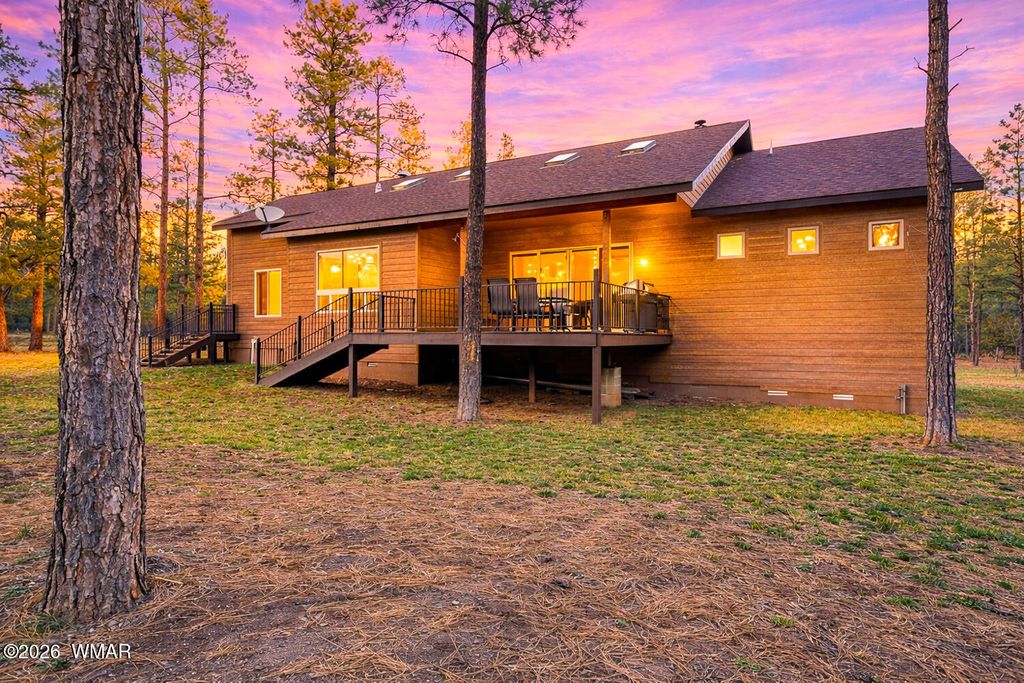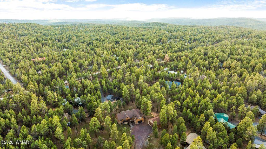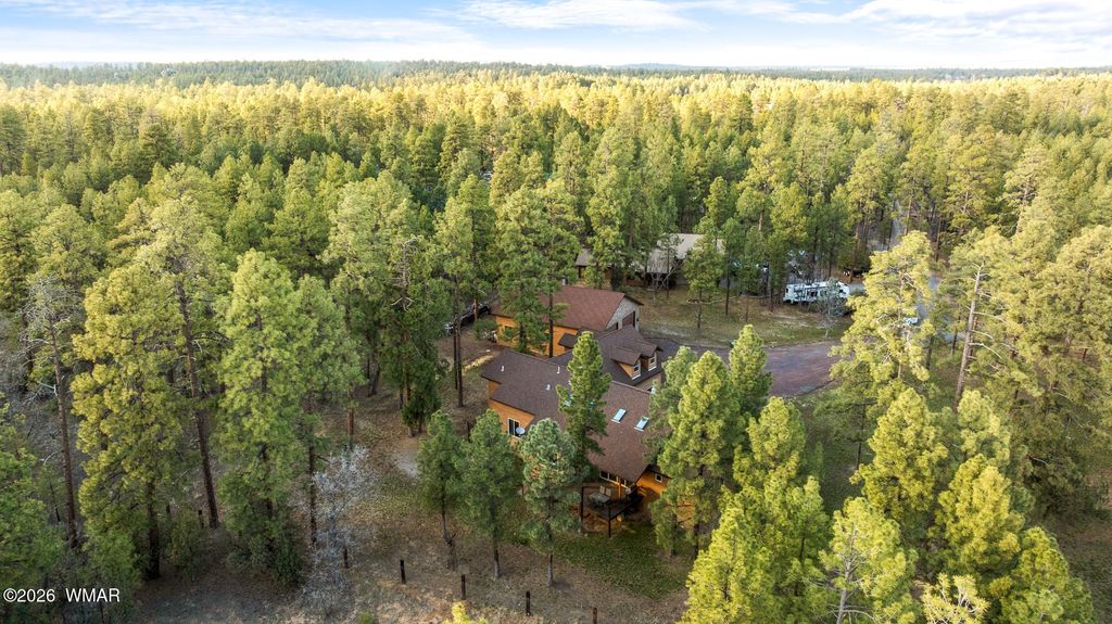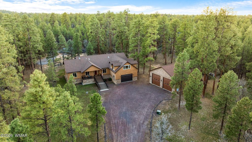 The'' PERFECT MOUNTAIN ESTATE'' awaits in the beautiful White Mountains of Arizona. Located in the charming community of Lakeside Arizona. This FULLY FURNISHED custom home offers approximately 3,600 square feet of refined living space and showcases exceptional craftsmanship, thoughtful design, and true mountain elegance. The heart of the home is a gourmet chef's kitchen featuring high-end commercial range with custom hood, pot filler, granite countertops, gorgeous tile backsplash, and an expansive black walnut island perfect for gathering and entertaining. Additional highlights include: custom cabinetry, crown molding, hardwood floors & a large walk-in pantry, all designed with both beauty and function in mind. The spacious great room features soaring 10+ foot ceilings, abundant natural light, and a stunning stone wood-burning fireplace that creates the perfect centerpiece for cozy mountain evenings. Large windows and sliders lead to the back deck, offering beautiful views of the surrounding towering pines. This home offers four spacious bedrooms and 4.5 bathrooms, with every bedroom featuring its own private en-suite, ensuring comfort and privacy for family and guests. The primary suite is a luxurious retreat with dual vanities, a jetted Jacuzzi soaking tub, a large custom tile walk-in shower, and a spacious walk-in closet with custom built-ins. One of the guest suites even features its own private deck, creating a peaceful retreat for visitors. Above the garage, a large flex room provides endless possibilities--perfect for a home office, game room, media room, exercise space, hobby room, or additional sleeping area. Situated on nearly 2 acres of flat usable land with its own PRIVATE WELL (800 feet deep) at the end of a Cul-De-Sac. The property features lush grass with a sprinkler system, towering pines, providing both beauty and privacy. The exterior is designed for easy maintenance with SmartSide siding, beautiful stone accents, and durable Trex-style decking on both the front and back of the home. In addition to the oversized two-car garage, the property includes an impressive 40' x 50' detached site-built RV garage/workshop complete with 14+ foot ceilings, 14-foot roll-up doors, concrete floors, a wood-burning stove, and a half bath. This incredible space is ideal for RV storage, a car collector's garage, workshop, mechanic's dream space, or hobby shop. With no HOA, breathtaking surroundings, and exceptional quality throughout, this one-of-a-kind mountain estate truly has it all. Living in the beautiful White Mountains, Arizona means access to year-round recreation including nearby lakes, national forest trails, rivers, golf courses, horseback riding, biking, fishing, and skiing, making this property not only a home but a true mountain lifestyle retreat.