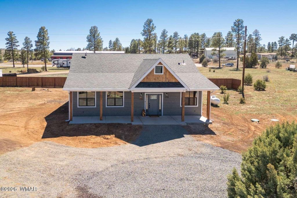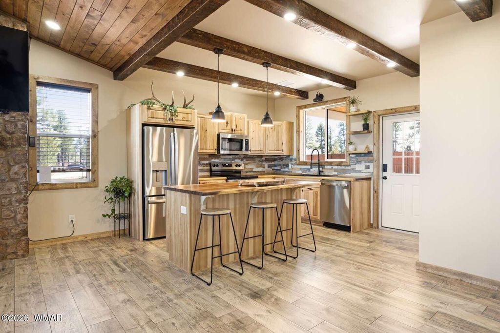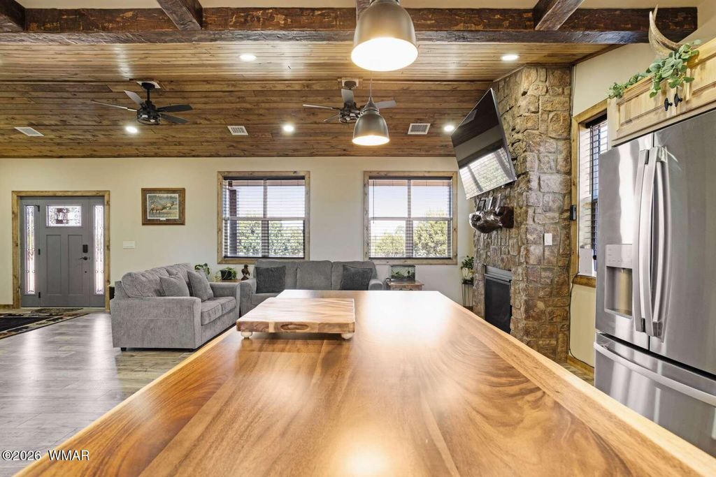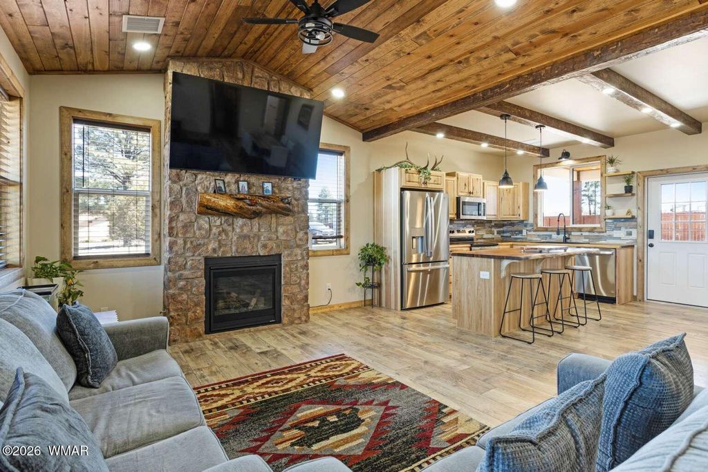 Welcome to your perfect mountain escape! Newly constructed in 2025, this quality-built 3bd rm, 2-bath sits on 0.7 acres and offers 1371 sq ft of inviting living space filled with natural light. The vaulted T&G ceiling and gas fireplace with a beautiful stone surround and juniper mantle create a warm, rustic feel in the living room. the kitchen features rich hickory cabinetry paired with wood countertops, and rustic looking beams. while solid wood doors carry the cabin-style charm throughout the home. the primary suite includes a walk-in shower with tile to the ceiling with a window for natural light, and walk-in closet, and a spacious laundry room adds everyday convenience. Step outside to enjoy large, covered front and rear patios-perfect for morning coffee and relaxation, designed with comfort and craftmanship in mind, this home offers both style and durability in a peaceful setting. Located in a quite small town with fresh mountain air and close proximity to the national forest.