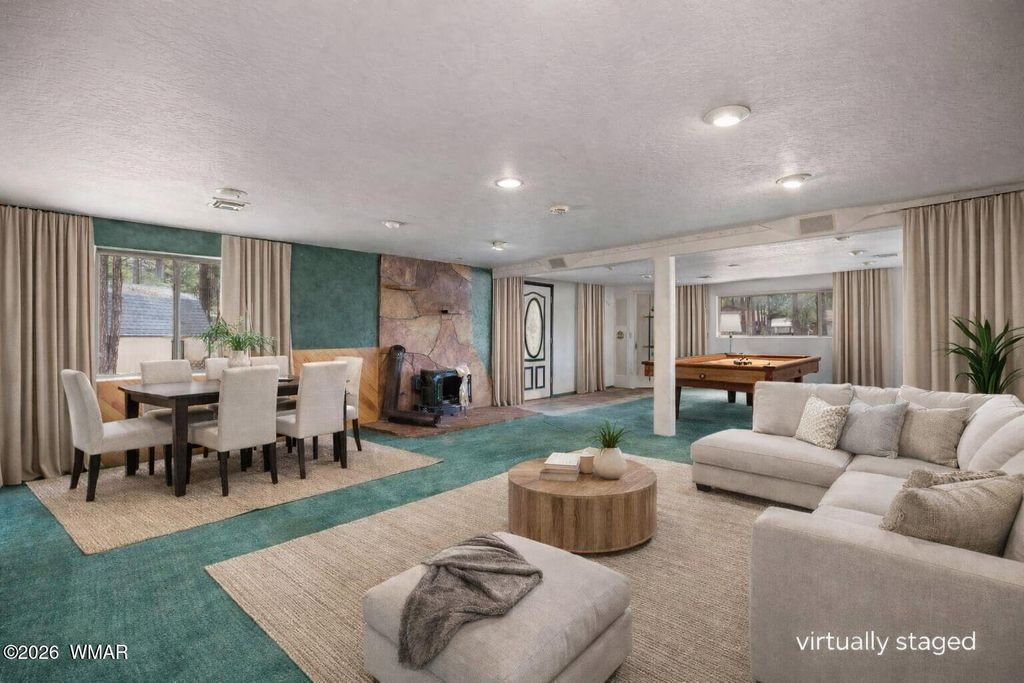 Tucked within the sought-after Woodland Estates, this rare property sits directly across from Woodland Lake, offering easy access to outdoor recreation. Set on 1.15 acres, it features horse privileges--an uncommon find in Pinetop--with space for a corral or even a future guest home.The home offers two spacious living areas, ideal for entertaining or expanding. The property also includes a detached utility building and two outdoor wooden sheds. With no HOA, this property presents excellent potential as a primary residence, vacation retreat, or long- or short-term rental investment. needed updates, this is a unique opportunity to own acreage in a prime, highly desirable location. Listing photos have been VIRTUALLY STAGED.