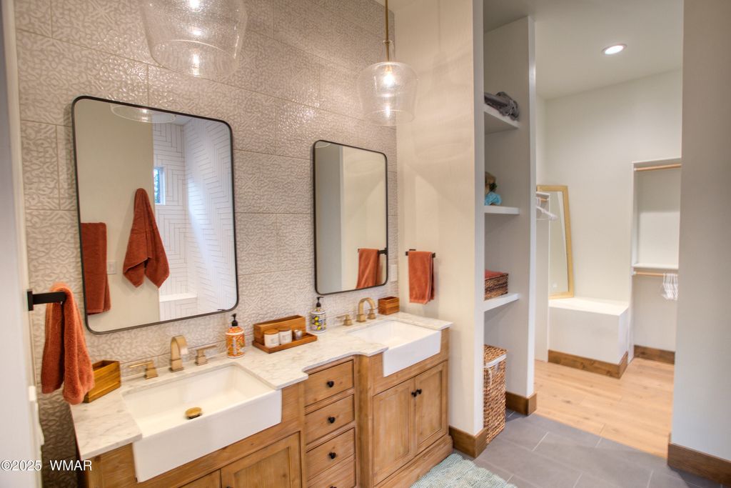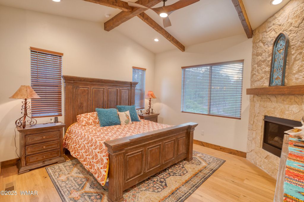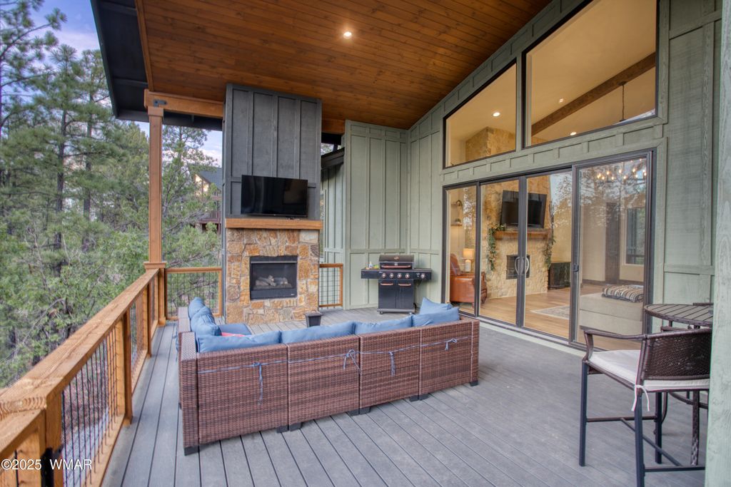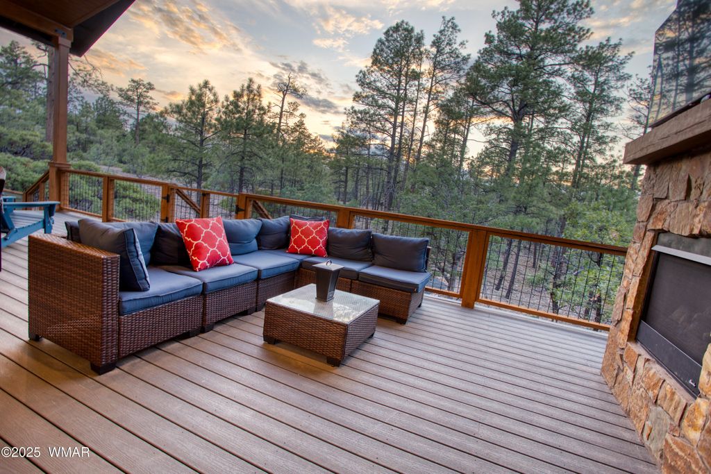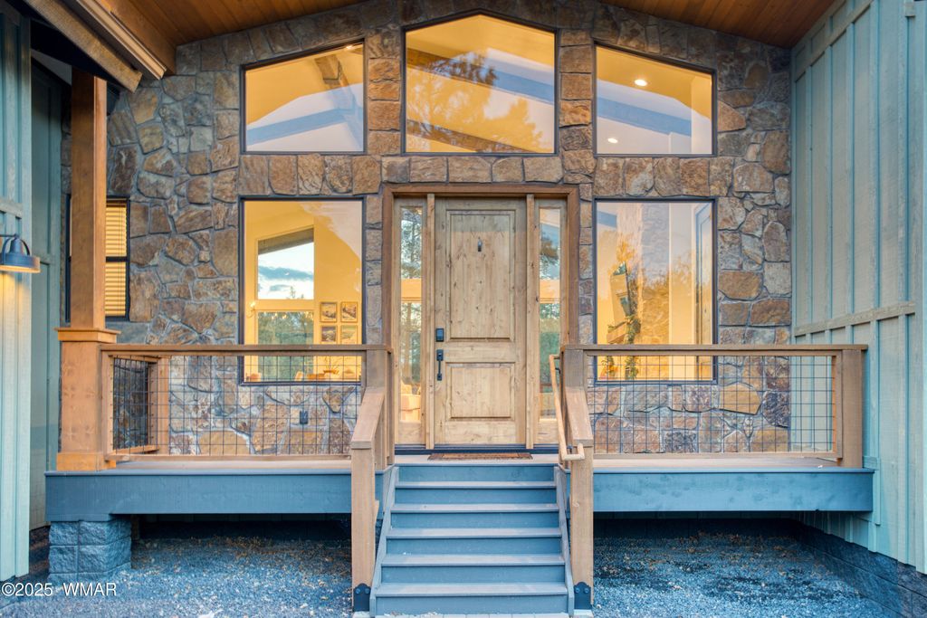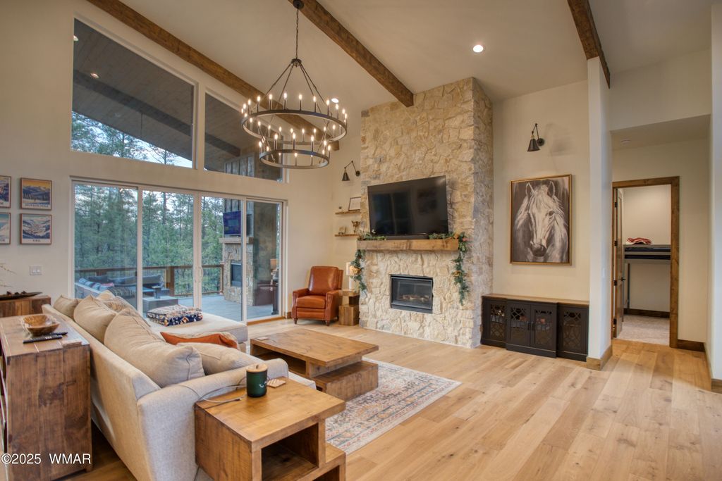 Welcome to your dream mountain retreat in the heart of Torreon! This stunning custom home combines modern luxury with rustic charm, offering a warm and inviting space to relax, entertain, and enjoy The White Mountains four-season beauty. Step inside and be greeted by soaring vaulted ceiling with striking beams, expansive windows that flood the home with natural light, and an open floor plan that seamlessly connects the kitchen, dining and living areas. the living room boats a striking stone fireplace and oversized chandelier, creating the perfect focal point for cozy nights by the fire. . The gourmet kitchen is a chef's delight, featuring high-end stainless steel appliances, a gas range, a massive quartz island with seating for four, custom cabinetry, and designer lighting.