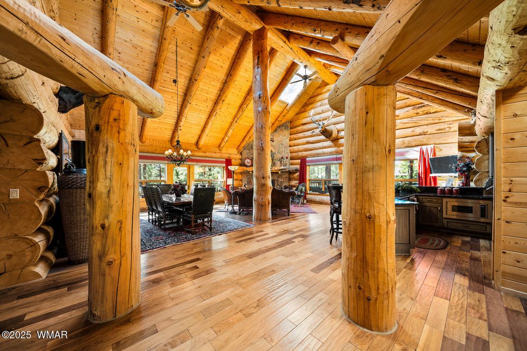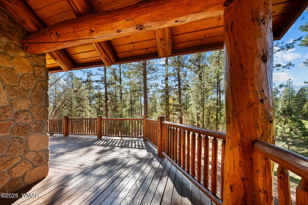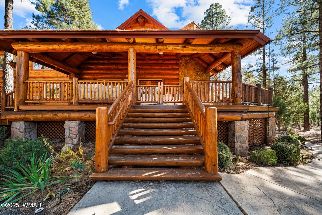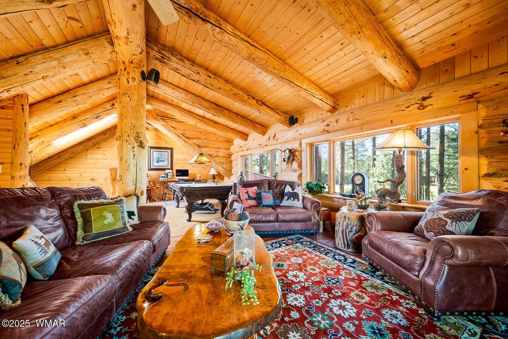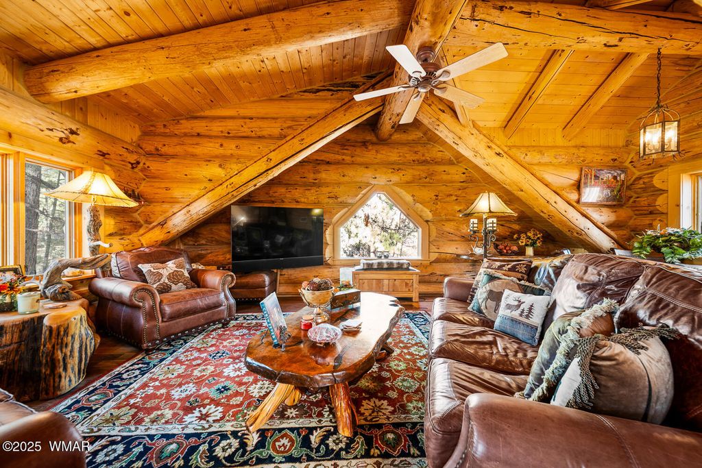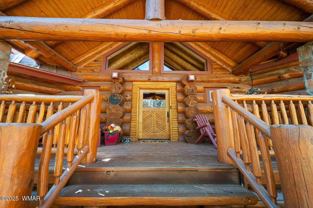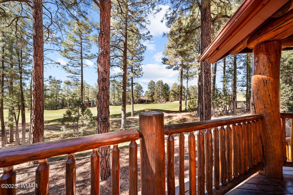 Incredibly rare full log home on the 15th fairway of the prestigious Cabin Course in Torreon. Nestled in the Tall Ponderosa Pine Trees at the end of the Little Leaf cul-de-sac, this is the home to make your great escape to Mountain life. As soon as you step inside, you will be awe-inspired by the spectacular craftmanship of it's full log beauty. Enjoy the open-concept living area that will keep the festivities going from the kitchen to the dining area, to the cozy gas fireplace made for a true mountain getaway. Your guests can relax in their own rooms with a Jack and Jill bathroom. The primary bedroom features its own loft and an abundance of space. The upstairs loft provides ample space for more entertaining. Outside, enjoy stunning views of the Cabin Course from the impressive deck!